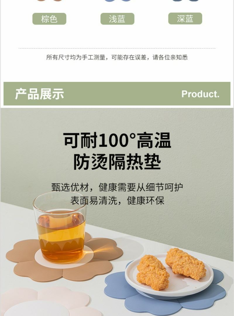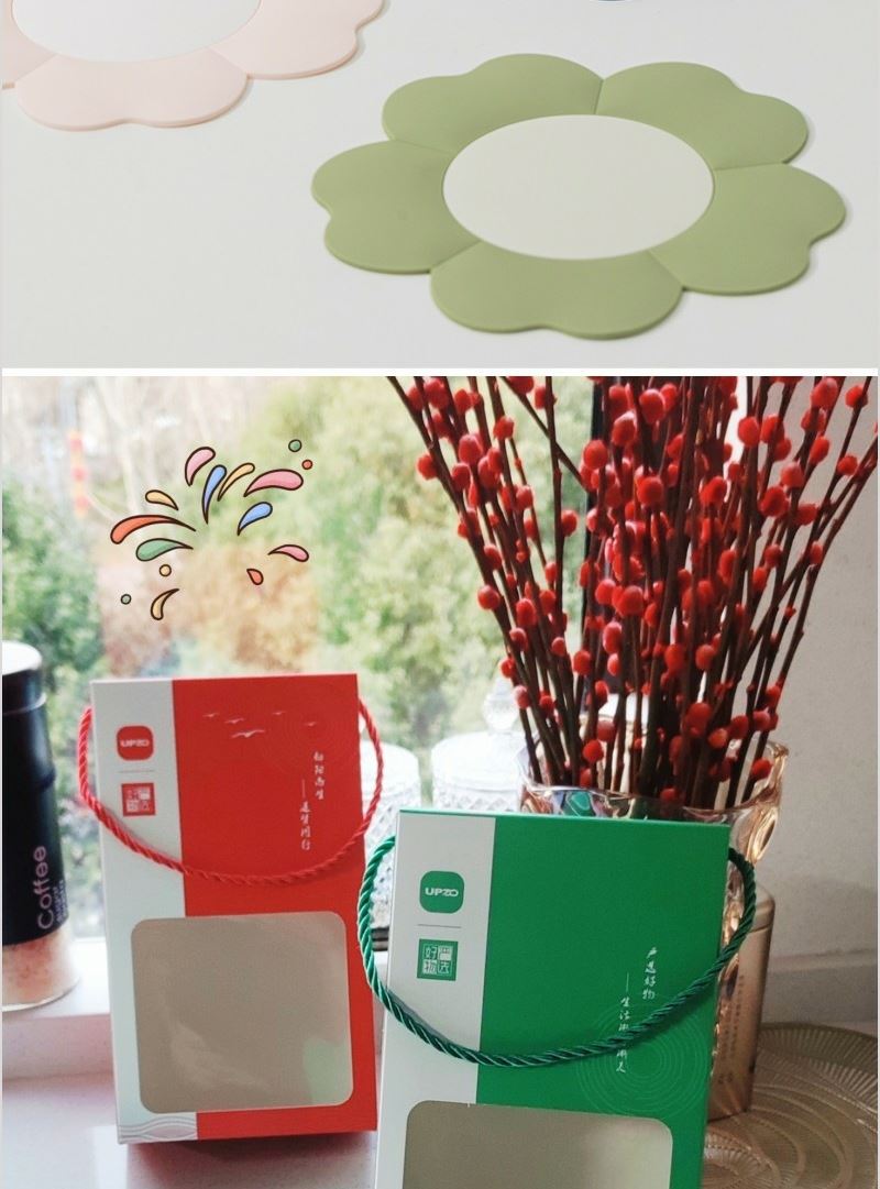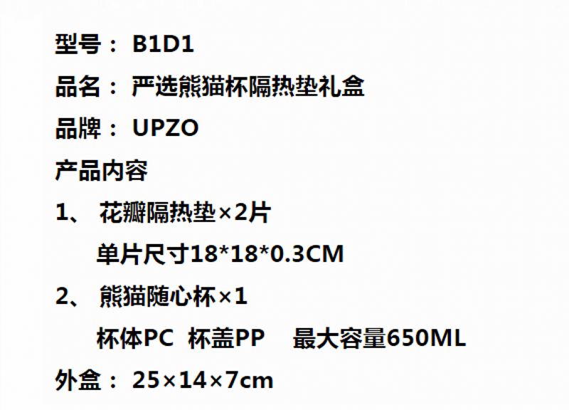 產(chǎn)品內(nèi)容 1、 花瓣隔熱墊×2片 單片尺寸18*18*0.3CM 2、 熊貓隨心杯×1 杯體PC 杯蓋PP 滿杯容量650ML 外盒: 25×14×7cm 熊貓杯創(chuàng)意DIY設(shè)計隨心貼 空白杯體 可定制專屬的客戶廣告隨心貼多重形式 隨意打造專屬水杯 花瓣隔熱墊 采用立體造型結(jié)合優(yōu)質(zhì)軟膠材質(zhì) 優(yōu)異品質(zhì) 時尚外觀