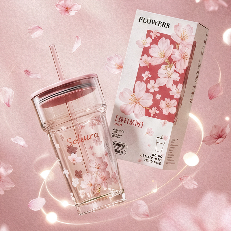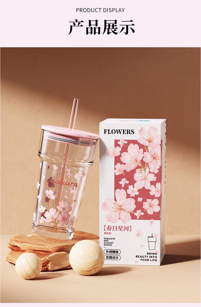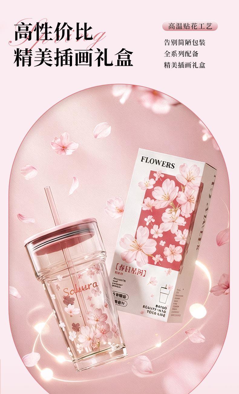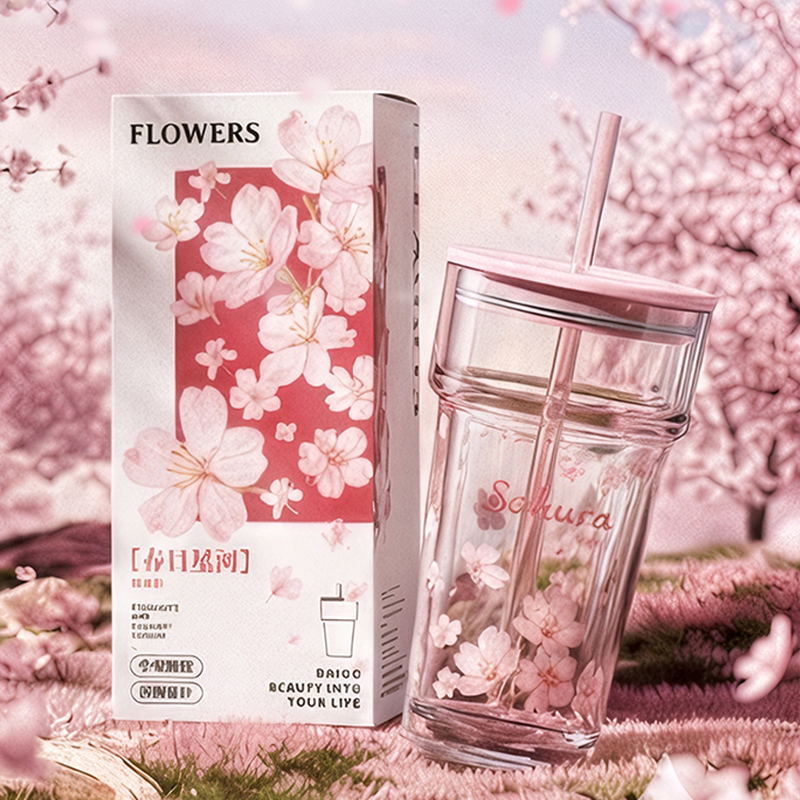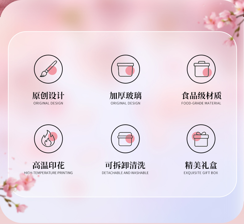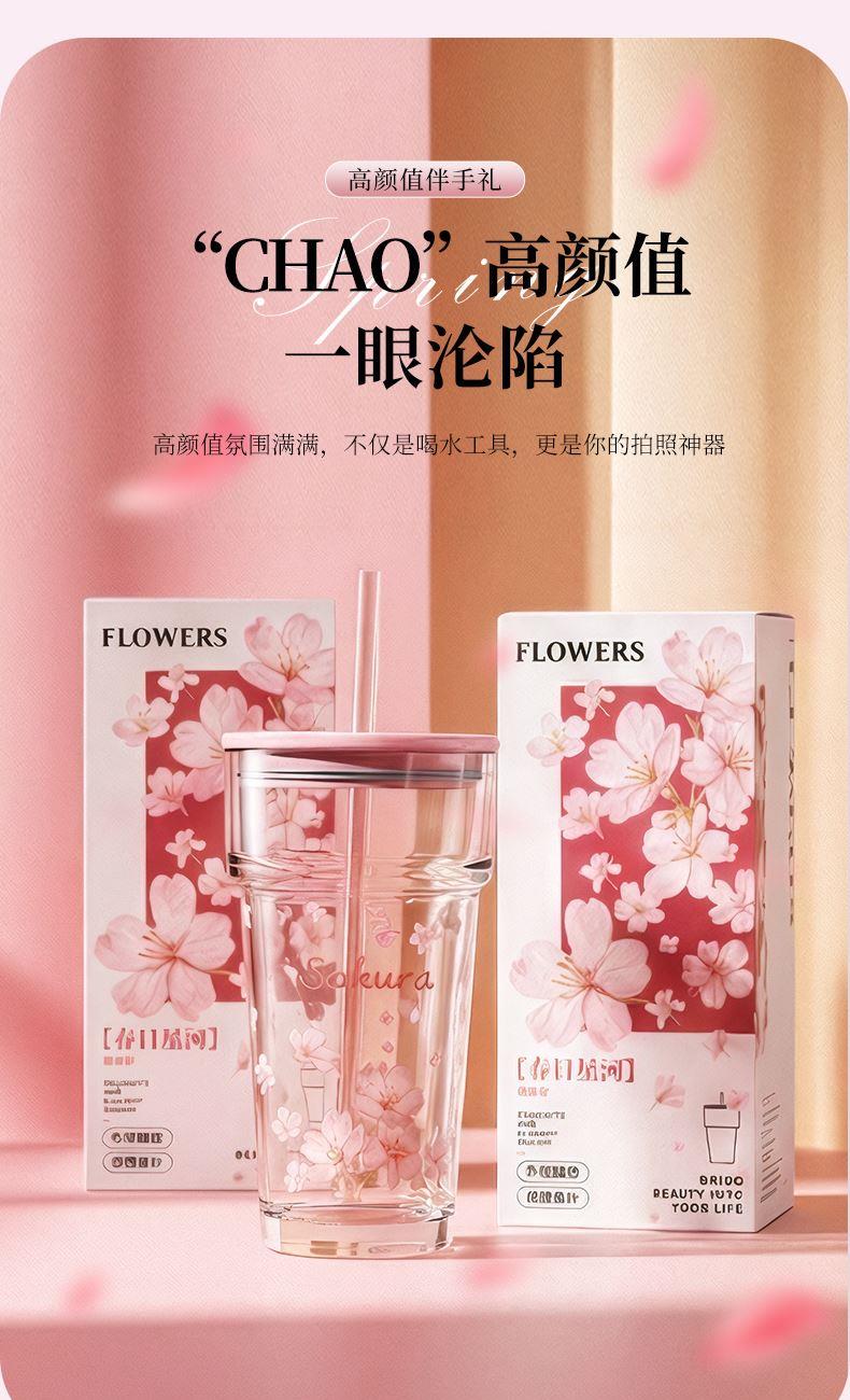 2、透明玻璃杯身印滿粉櫻,禮盒滿鋪櫻花紋樣,配色溫柔高 級(jí),自用賞心悅目,送禮自帶儀式感