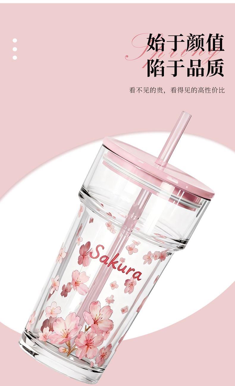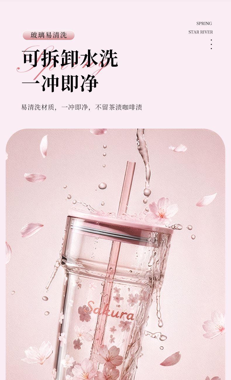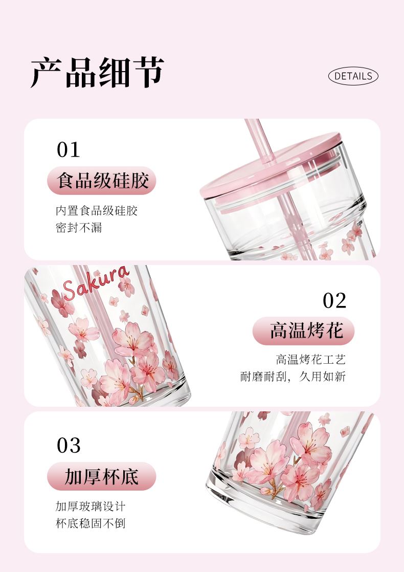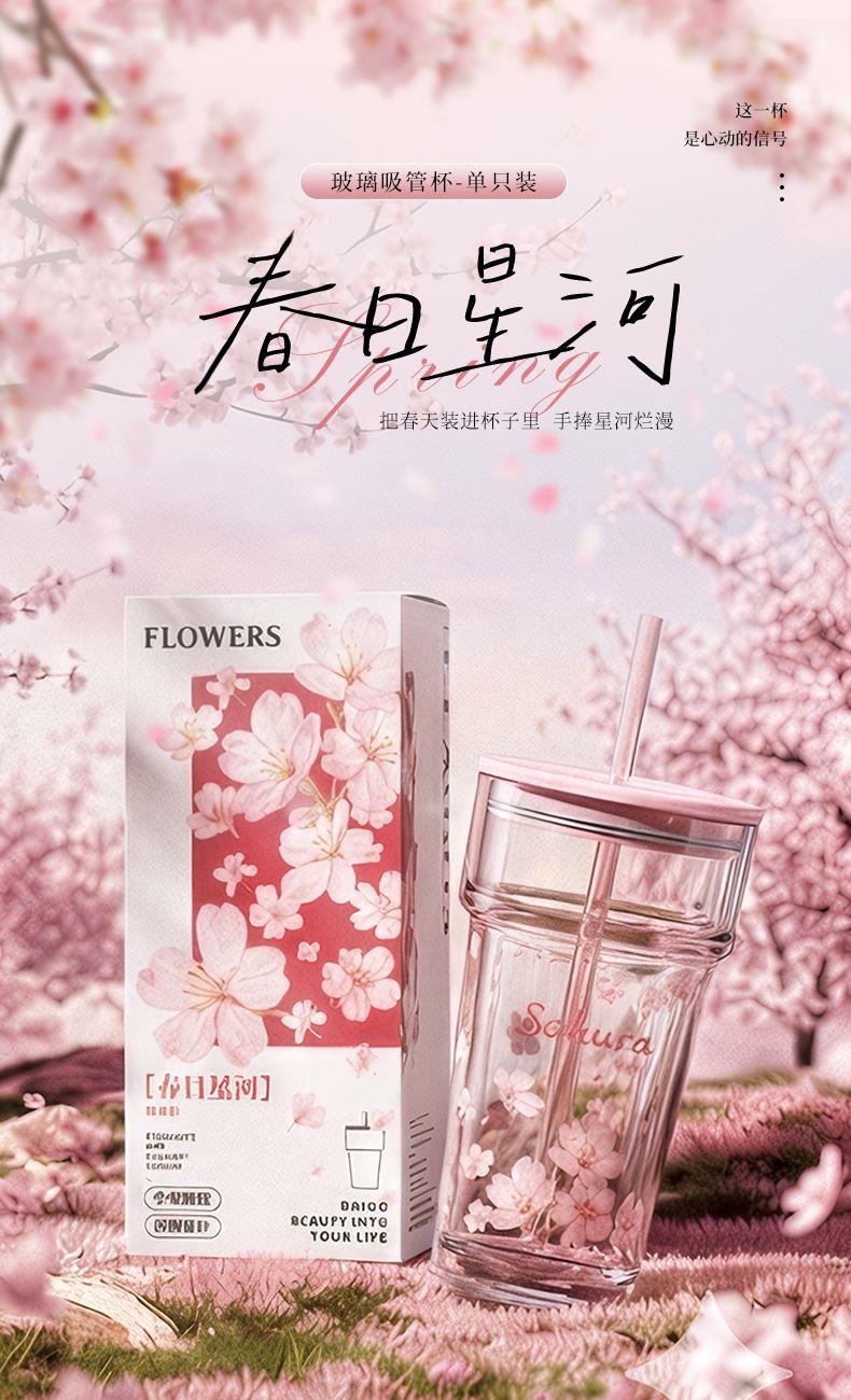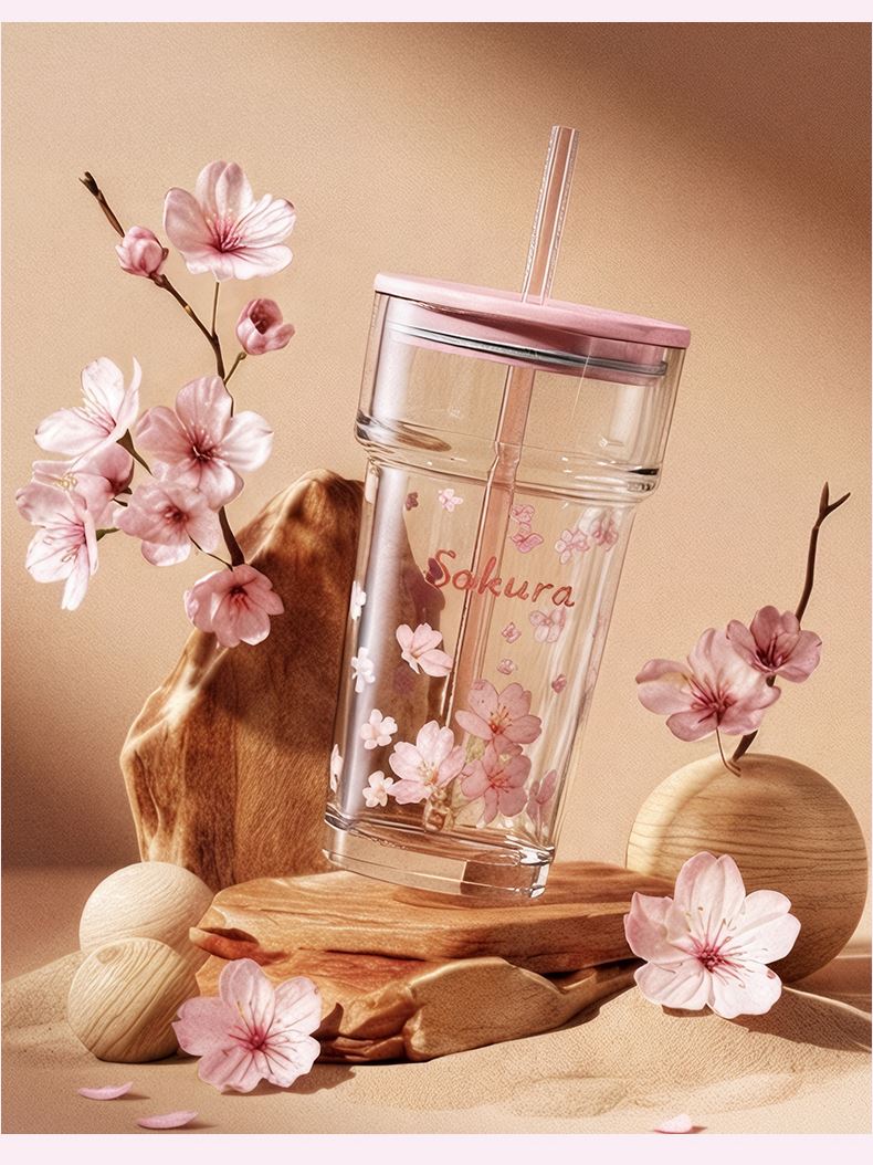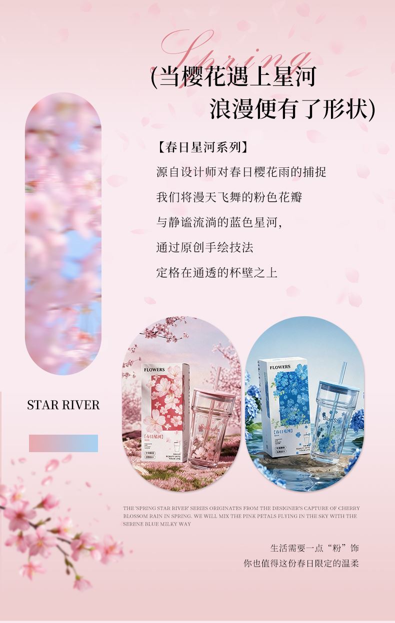 2、透明玻璃杯身印滿粉櫻,禮盒滿鋪櫻花紋樣,配色溫柔高 級(jí),自用賞心悅目,送禮自帶儀式感