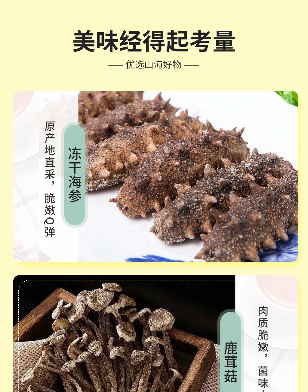 產(chǎn)品配置: 深海魚(yú)膠50g 深山靈芝60g 凍干海參10g 精選化橘紅165g 精選羊肚菌25g 東北秋木耳150g 精選鹿茸菇120g 凈含量:580g 禮盒尺寸:69*9*27cm 半畝川華夏貢禮山海奇珍、深山靈萃共一盒。深海魚(yú)膠配凍干海參,東北秋木耳搭精選鹿茸菇,高價(jià)值禮盒加手提袋,送禮超有面!