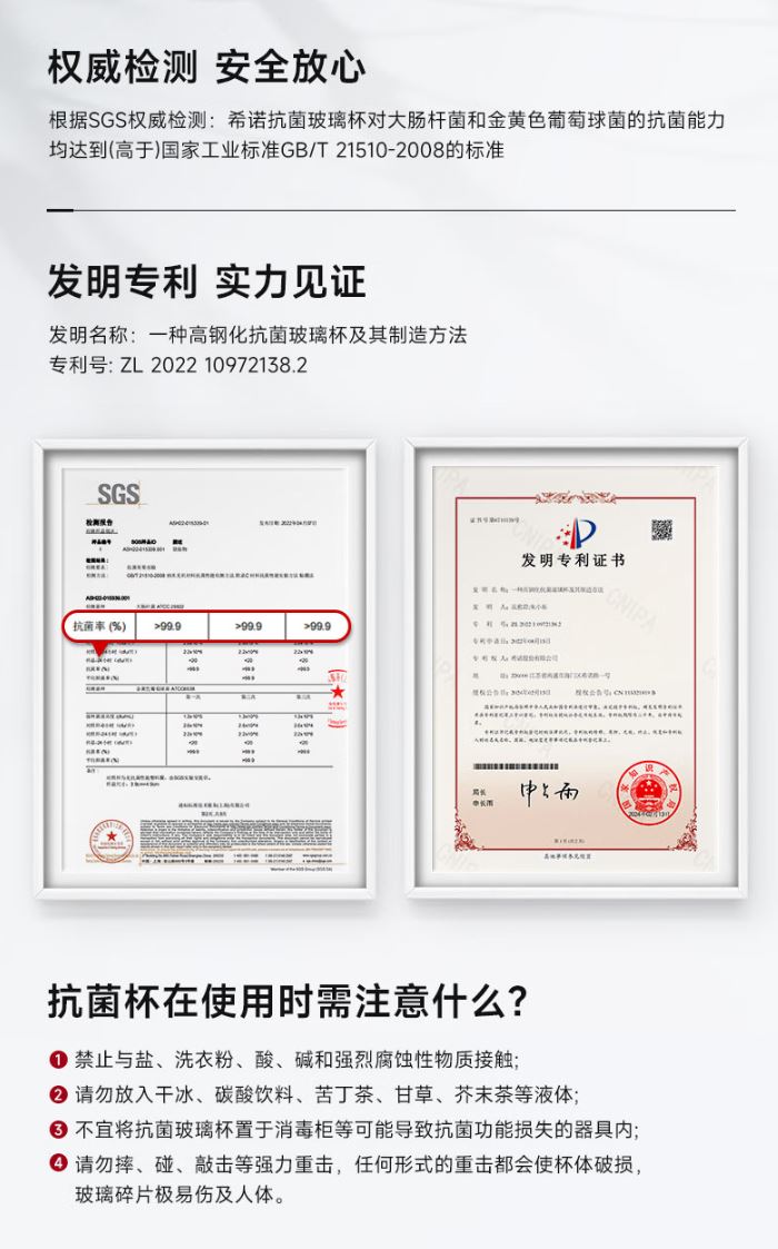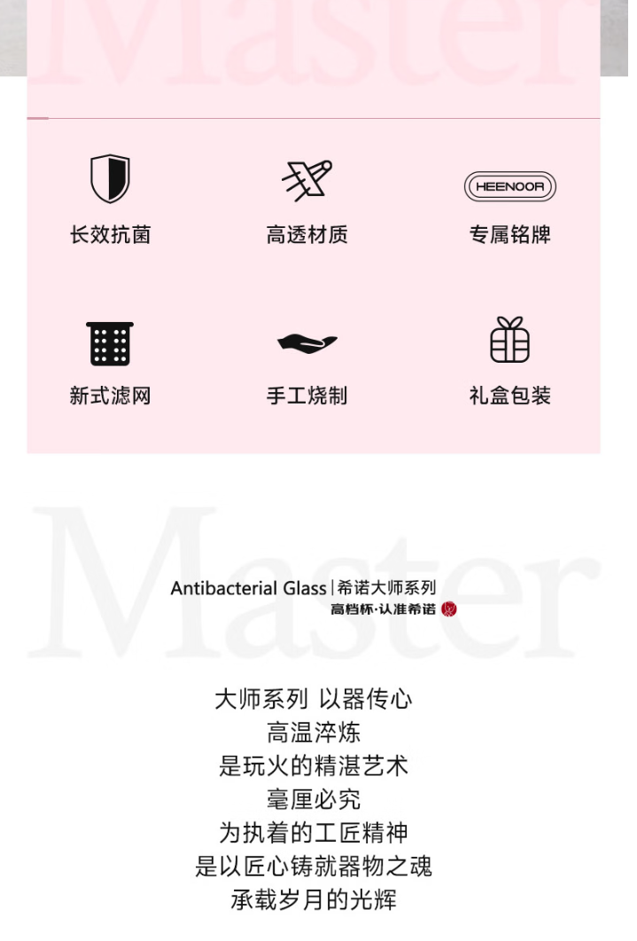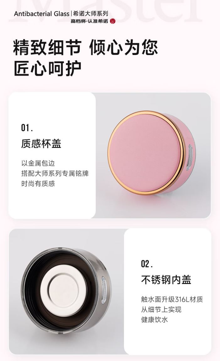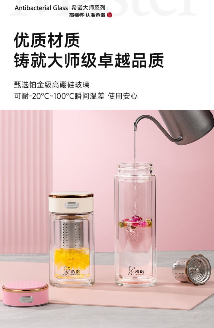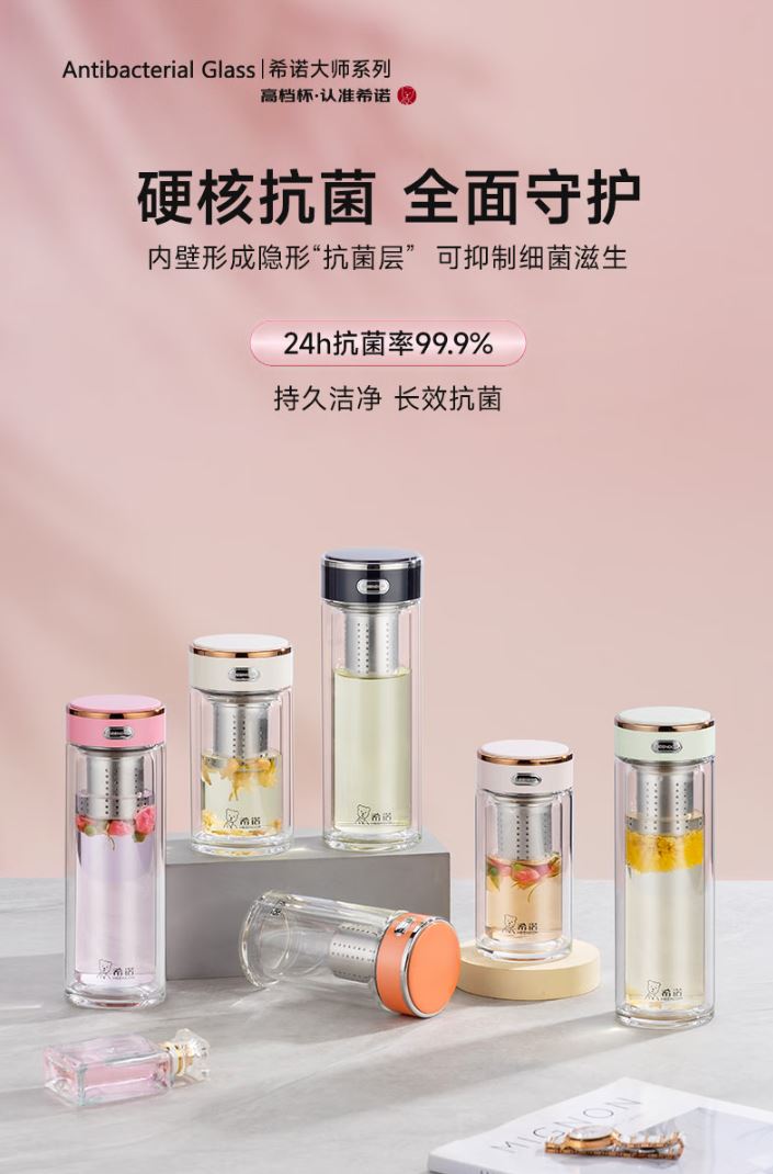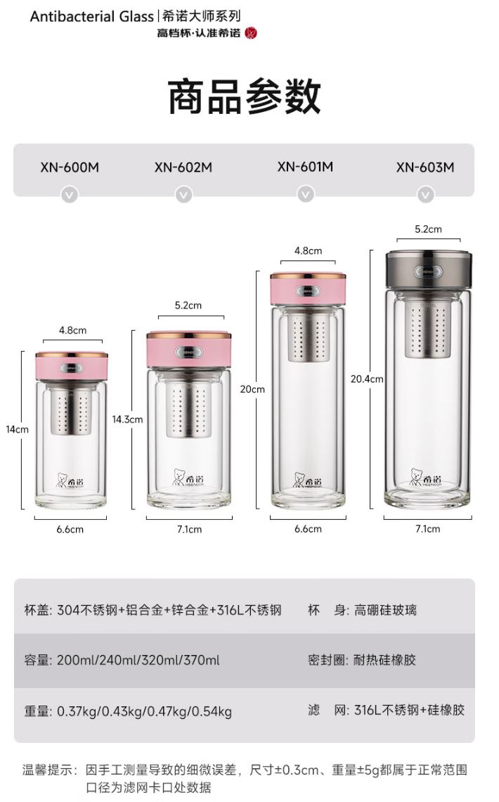 容量 XN-603M: 370ml 規(guī)格(mm) XN-603M: 52(杯口直徑) x71(直徑) x204(高度) 杯體 鉑金級(jí)高硼硅玻璃、銀離子 濾網(wǎng) SUS316L、食品級(jí)硅膠 密封圈 食品級(jí)硅膠 條形碼 XN-603M: 6951097701629 XN-603M:珠光本色、紫羅蘭