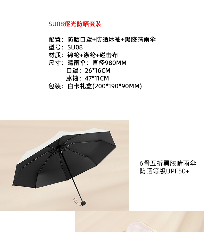 配置:防曬口罩+防曬冰袖+黑膠晴雨傘 型號:SU08 材質(zhì):錦綸+滌綸+碰擊布 尺寸:晴雨傘:直徑980mm 口罩:26*16cm 冰袖:47*11cm 包裝:白卡禮盒(200*190*90mm)