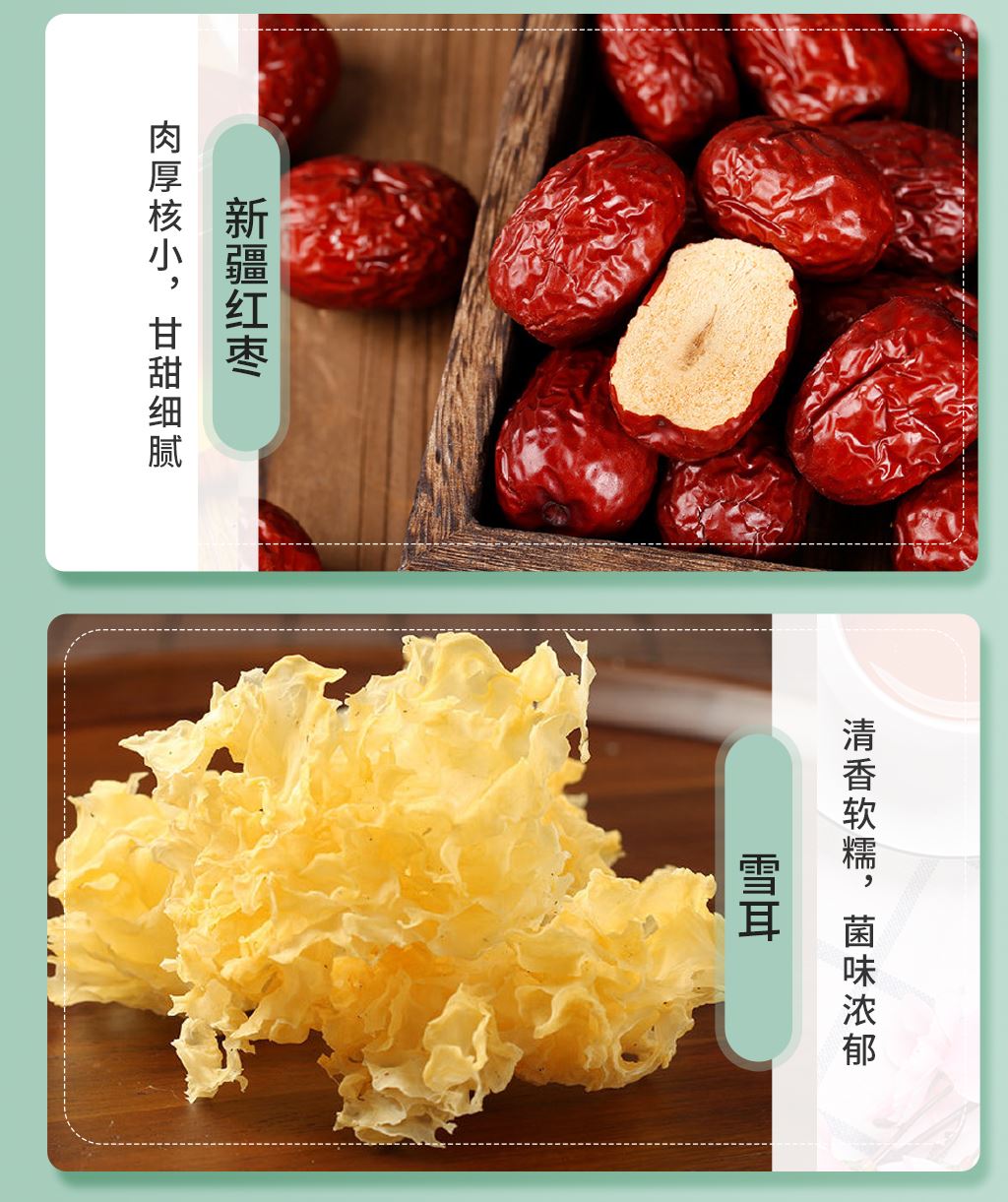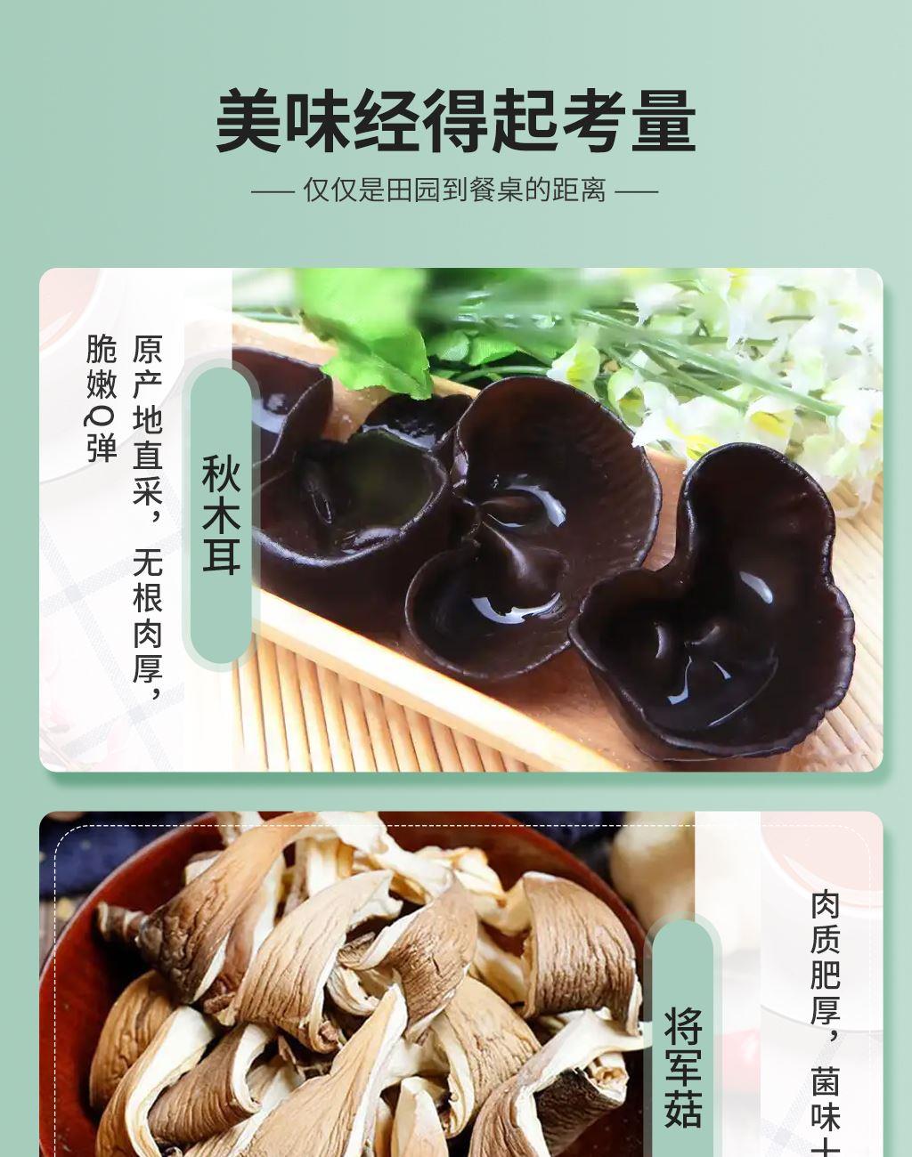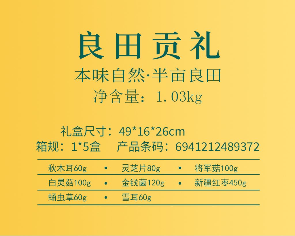 產(chǎn)品配置: 野生秋木耳60g 精選靈芝片80g 精選將軍菇100g 精選白靈菇100g 野生金錢菌120g 新疆紅棗450g 精選蛹蟲草60g 精選雪耳60g 凈含量:1.03kg 禮盒尺寸:49*16*26cm 野生菌邂逅滋補果干,珍有食材集結(jié)。一盒囊括自然精華, 無論是自享還是贈友,都是品質(zhì)之選。