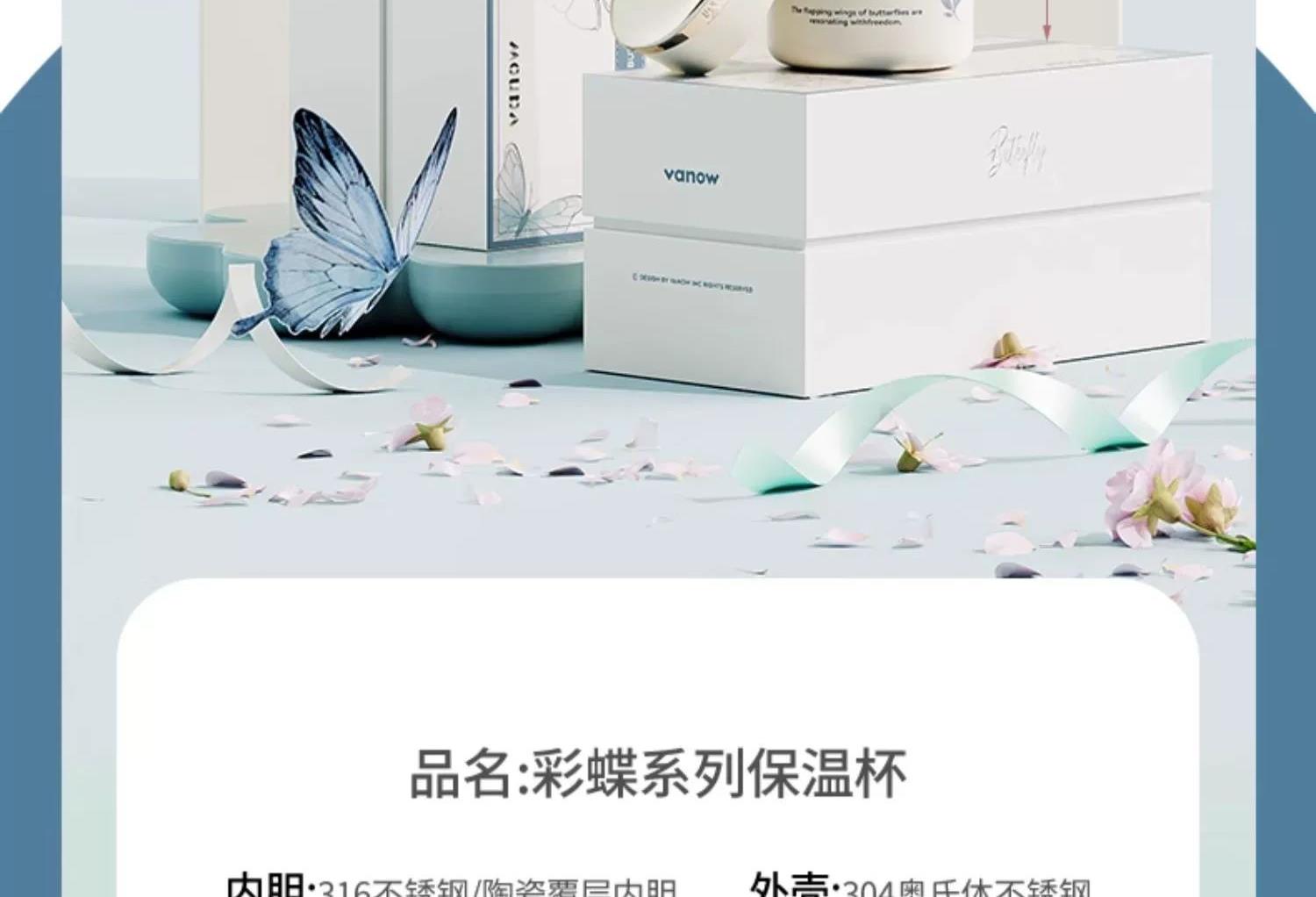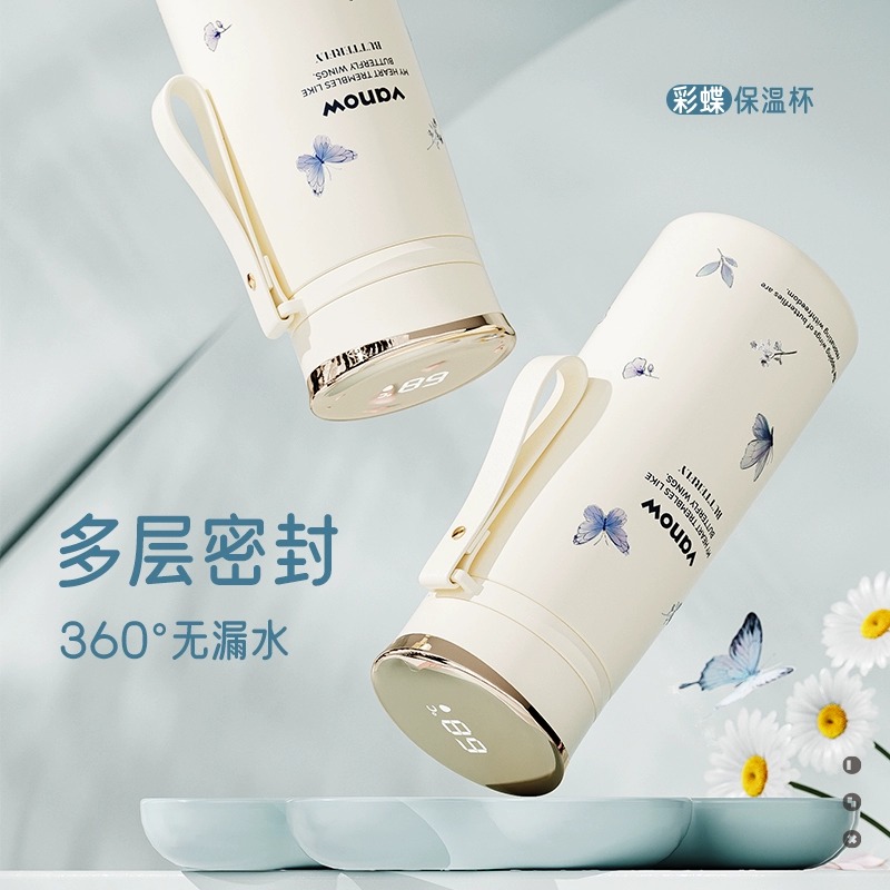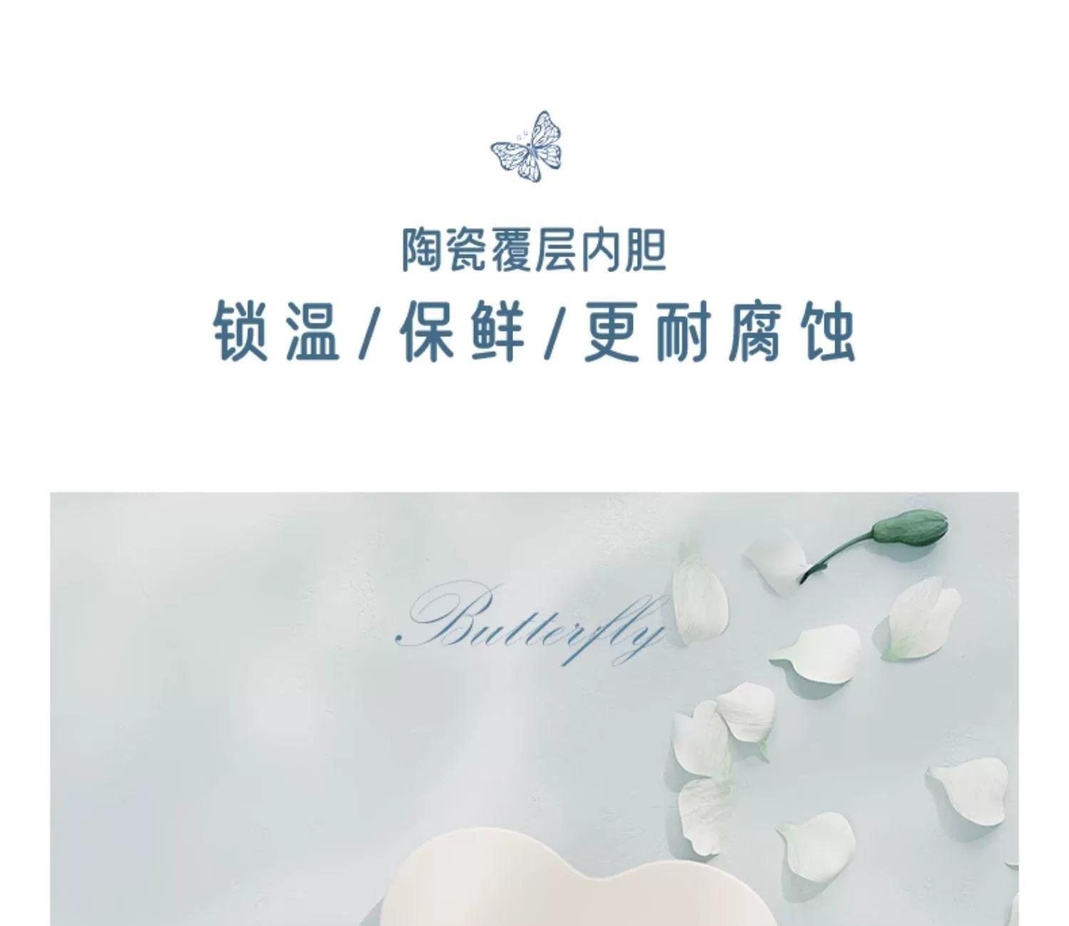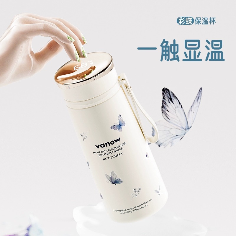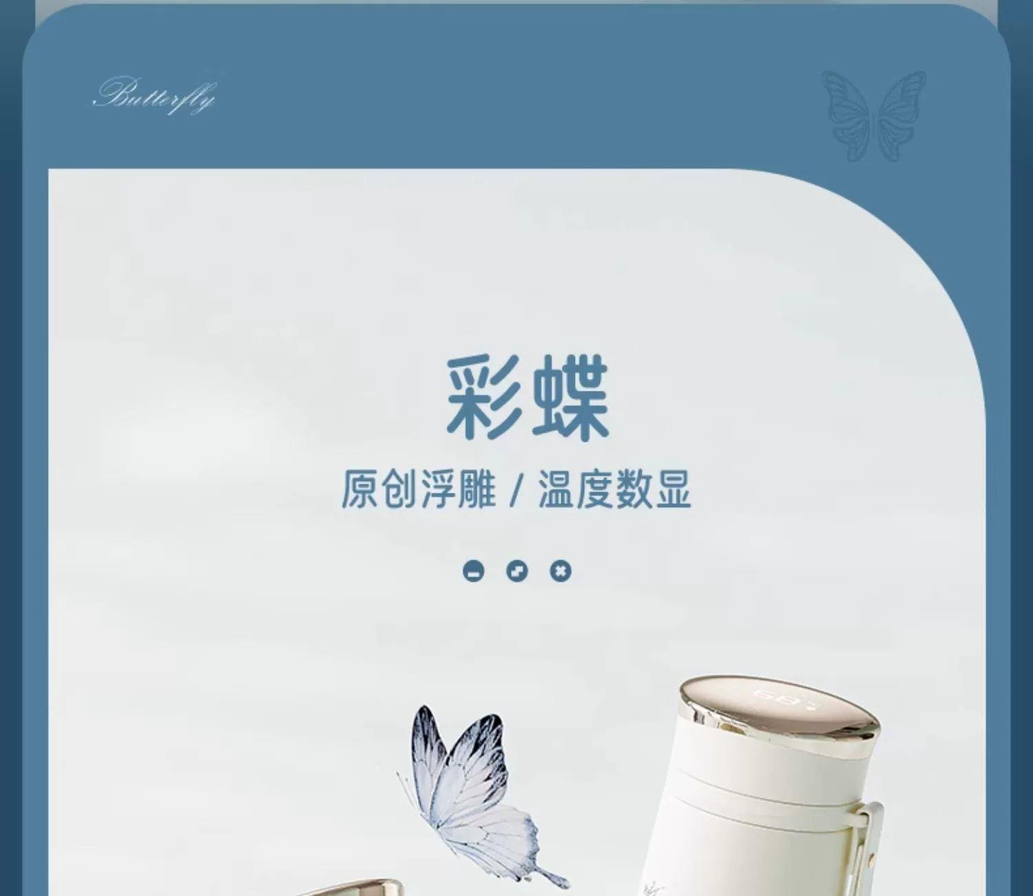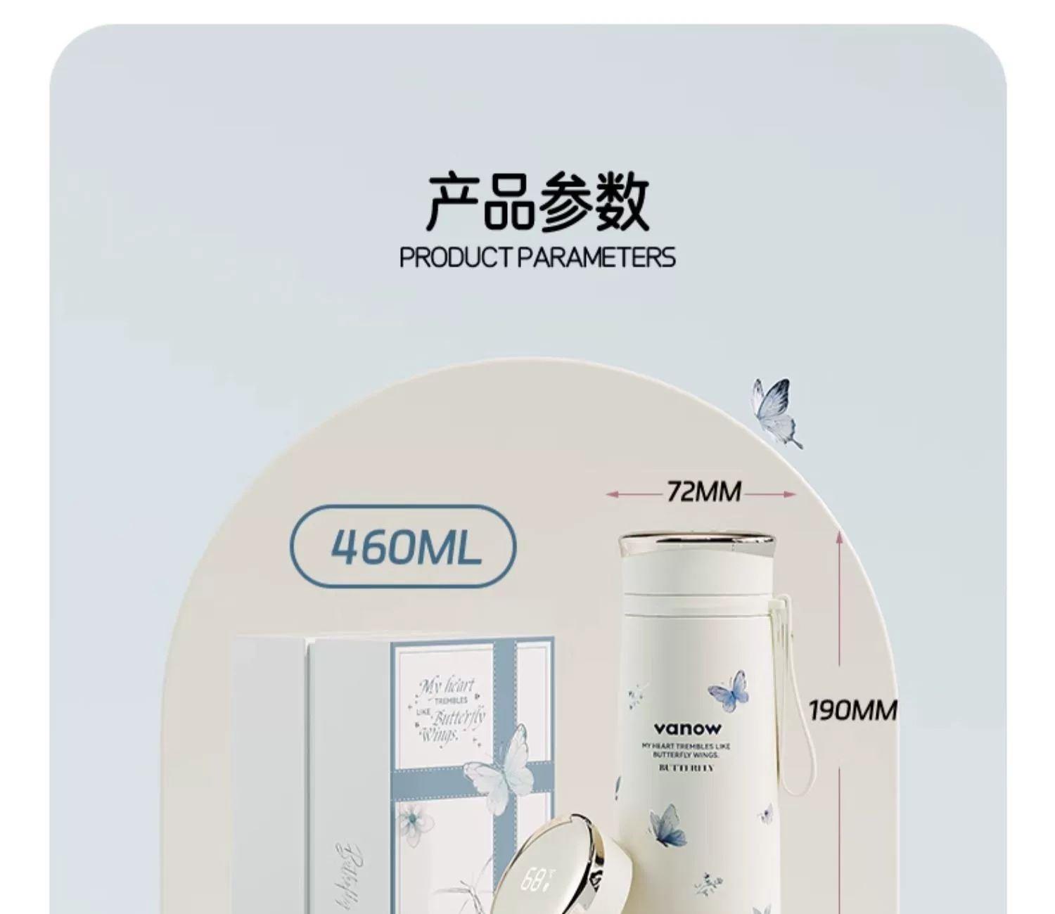 型號(hào):VO-HD46NS、VO-HD46NS-C 顏色:蝴蝶 容量:460ml 材質(zhì):內(nèi)膽316不銹鋼、外殼304不銹鋼 尺寸:70mm*185mm 產(chǎn)品賣點(diǎn):1.溫度看的見,一觸顯溫,知冷知熱免燙嘴 2.養(yǎng)生茶飲,燜茶也不在話下 3.開啟后每隔兩小時(shí),會(huì)響起滴滴提醒 4.360度密封,裝包滿滿安全感