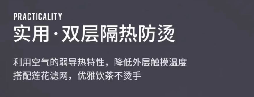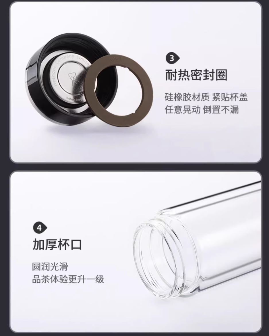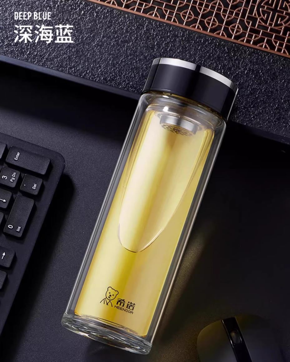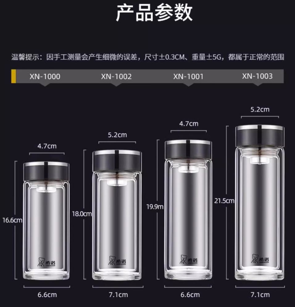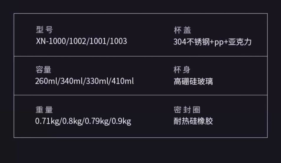 容量 XN-1003:410ml 規(guī)格(mm) XN-1003:52(杯口直徑)×71(直徑)×215(高度) 杯體 雙層高硼硅玻璃 杯蓋 食品級PP、304不銹鋼 濾網(wǎng) 304不銹鋼、食品級硅膠 密封圖 食品級硅膠 重量 XN-1003:0.53kg 顏色 深海藍、殿堂銀