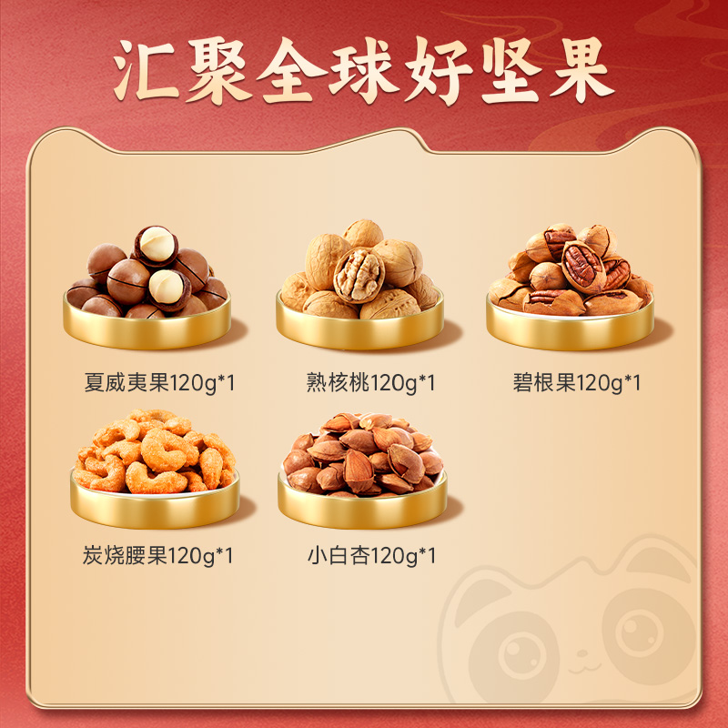 克重:600克 內(nèi)配: 1.腰果120g*1袋 2.碧根果120g*1袋 3.小白杏120g*1袋 4.熟核桃120g*1袋 5.夏威夷果120g*1袋 禮盒規(guī)格:260*68*350mm 保質(zhì)期:8月