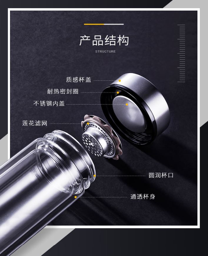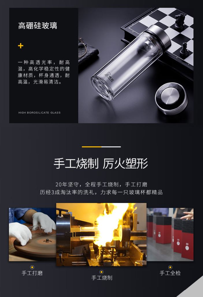 類別 希諾雙層玻璃杯 容量 XN-7072:340ml 規(guī)格(mm) XN-7072:52(杯口直徑)×70(直徑)x196(高度) 杯 體 雙層高硼硅玻璃 杯 蓋 食品級PP、304不銹鋼 密封圈 食品級硅膠 濾 網(wǎng) 304不銹鋼、食品級硅膠 重 量 XN-7072:0.48kg 顏 色 本 色