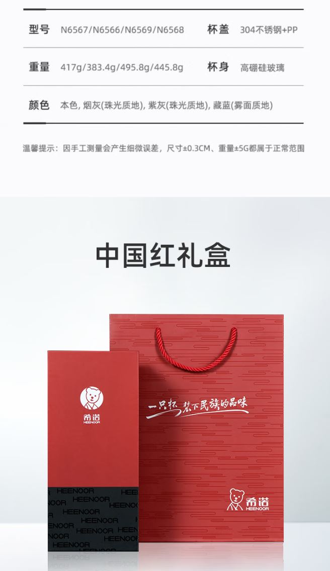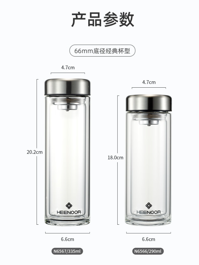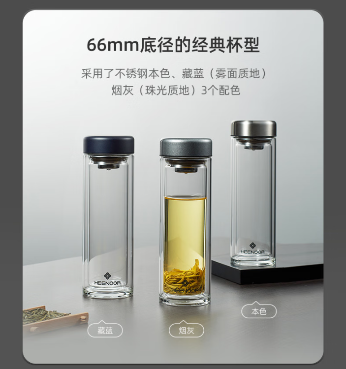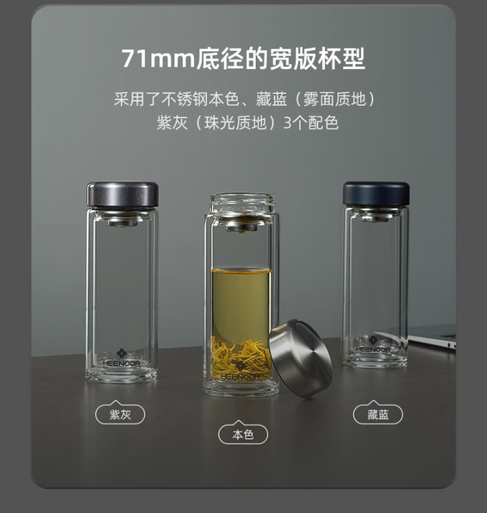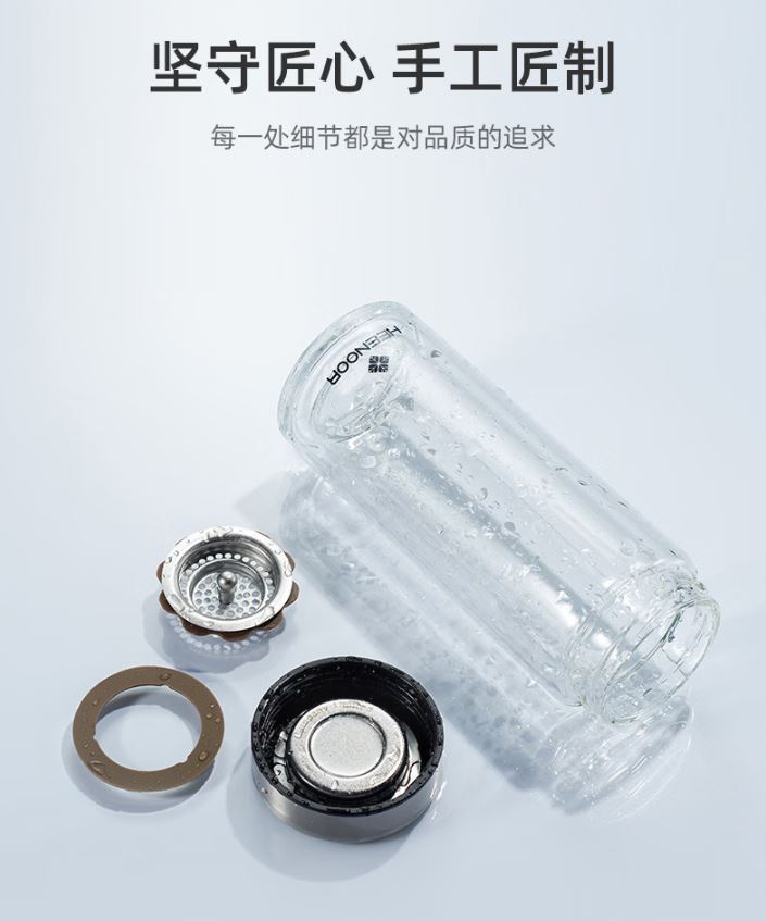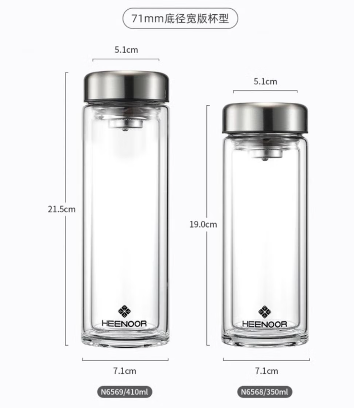 類(lèi) 別 希 諾 雙 層 玻 璃 杯 容量 精品N-6567:335ml 規(guī)格(mm) 精品N-6567:47(杯口直徑)×66(直徑)×203(高度) 杯 體 雙層高硼硅玻璃 杯 蓋 食品級(jí)PP、304不銹鋼 密封圈 食品級(jí)硅膠 濾 網(wǎng) 304不銹鋼、食品級(jí)硅膠 重 量 精品N-6567:0.42kg 顏 色 藏藍(lán)、煙灰、本色