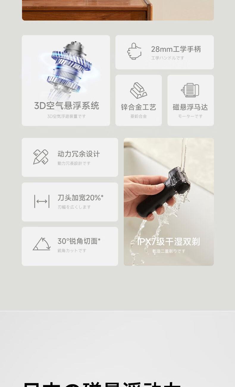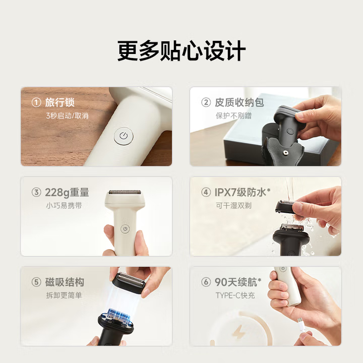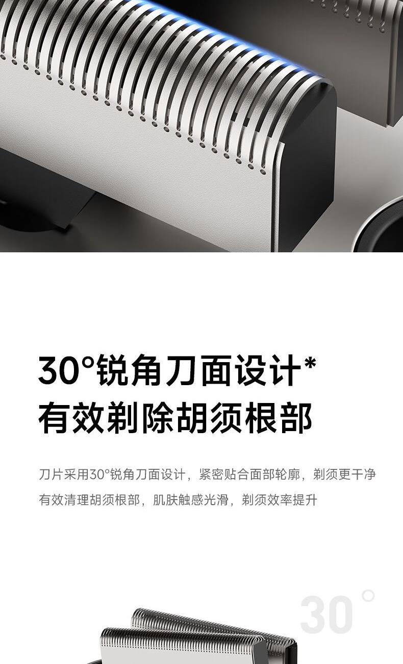 產品型號:CCS-J030 電池:800mah 刀頭:旋轉式2刀頭 續(xù)航時間:90min 鋅合金質感機身,ipx7防水 鋒利刀片秒下胡須,久用無頓感,舒適剃須不卡須 快速充電1小時,90分鐘超長續(xù)航 浮動雙刀頭設計,左右移動,輕松剃須 貼面刀網設計,緊貼面部輪廓,高效剃須 分體式設計 ,刀頭可單獨清洗,干凈衛(wèi)生