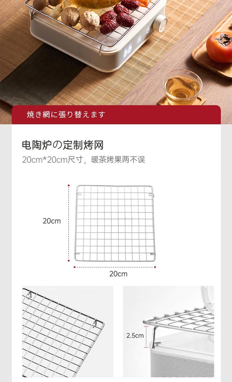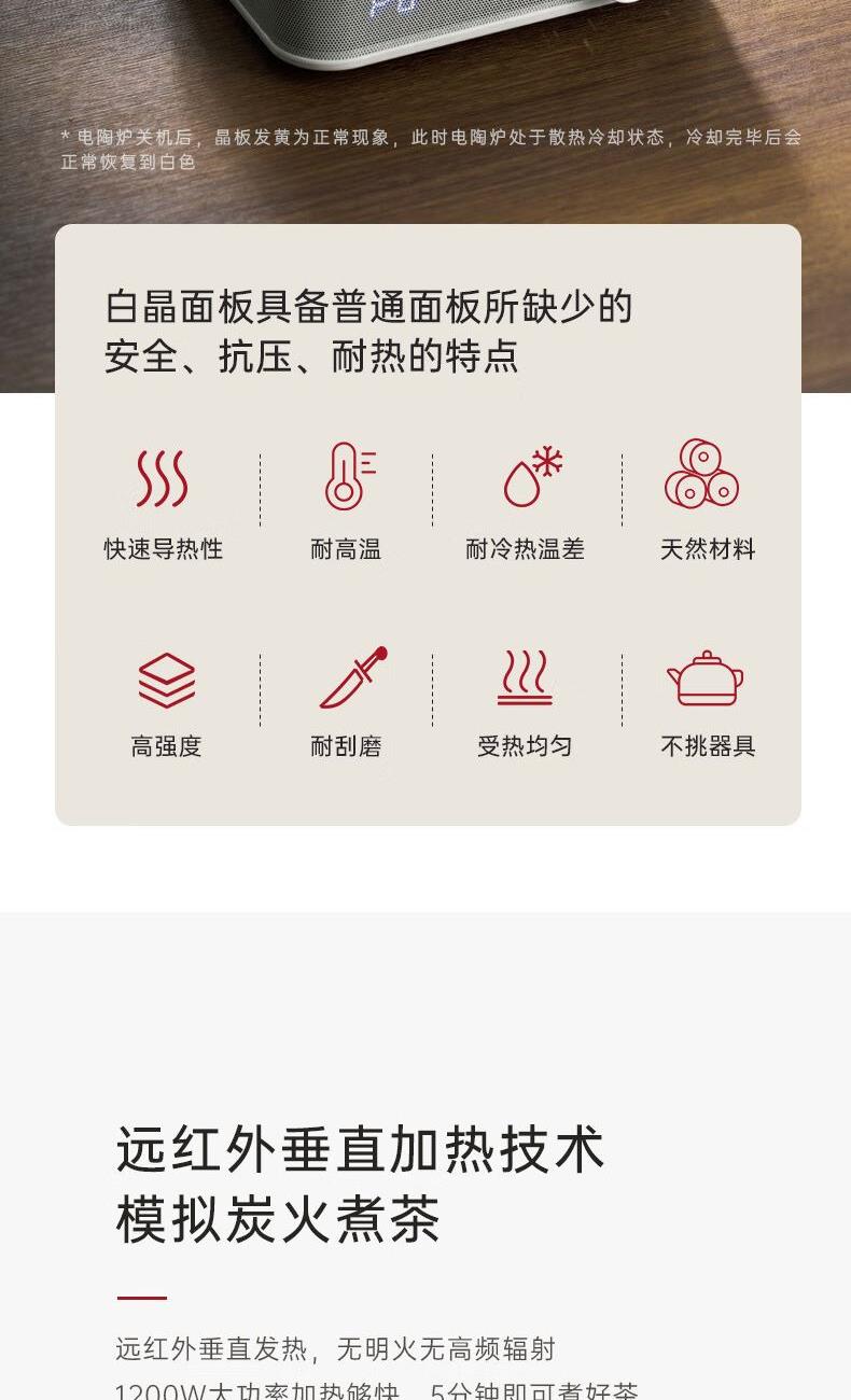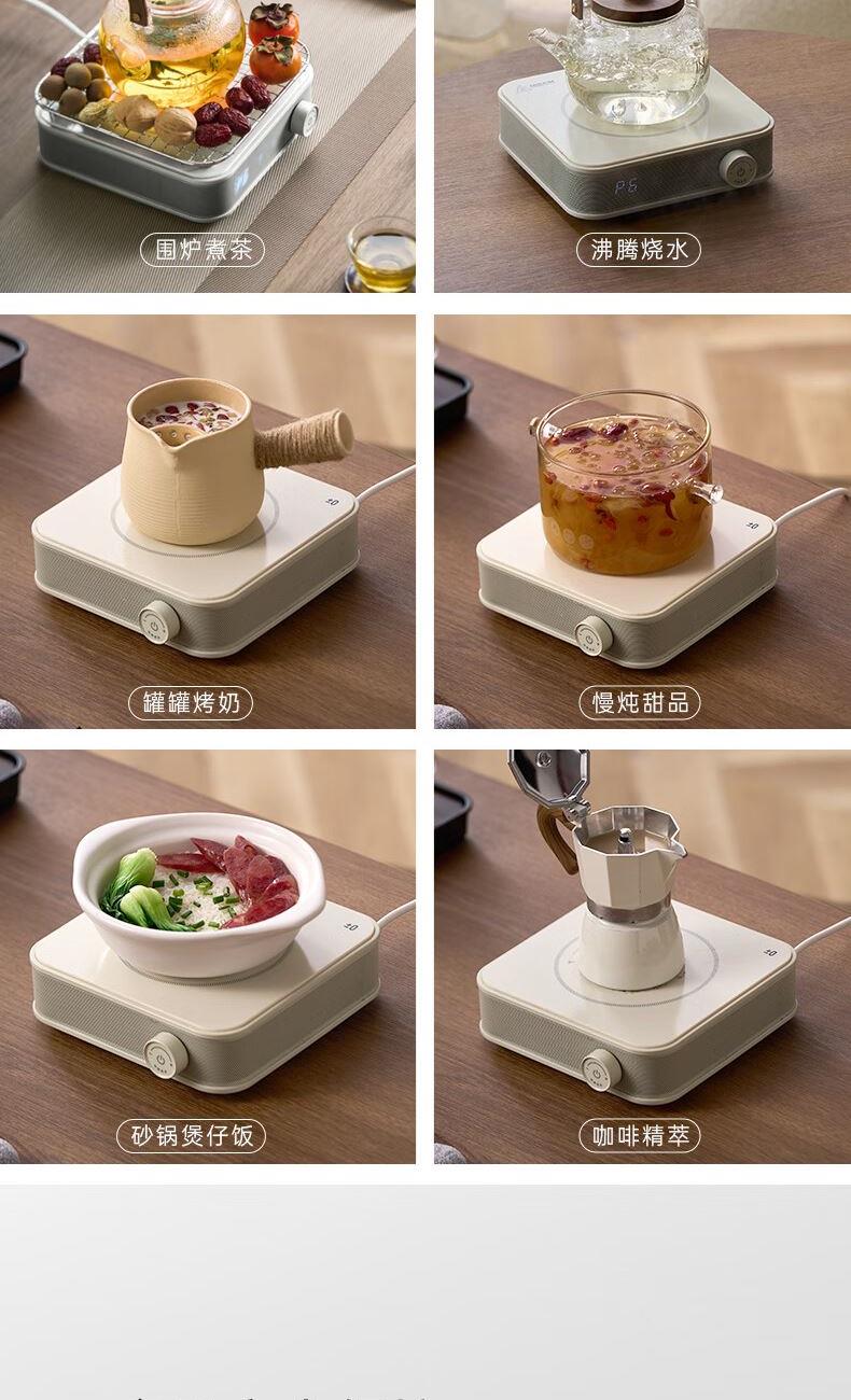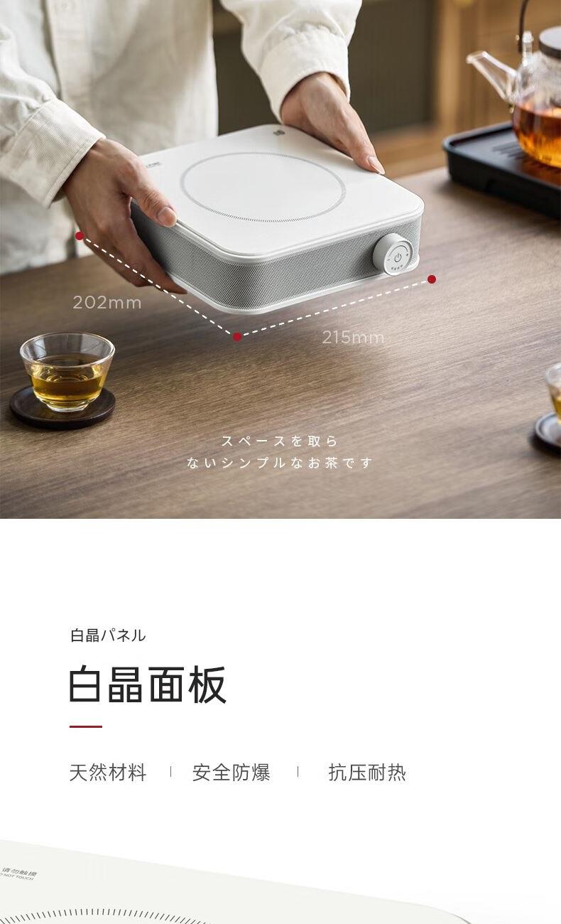 型號:CKH-J010 產品尺寸: 202*215*60mm 產品凈重:約1.1 kg 額定電壓:220V~ 額定頻率:50Hz 額定功率:1200W 可保溫時間:2小時 紅外聚能“垂直加熱”技術 隨心搭配,多壺適用 旋鈕開關靈活掌握火候 風扇靜音散熱壽命更長久
