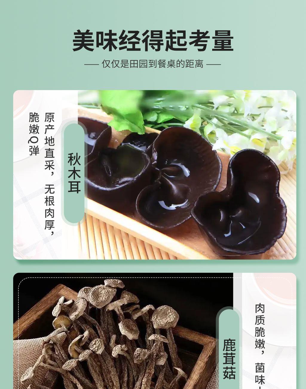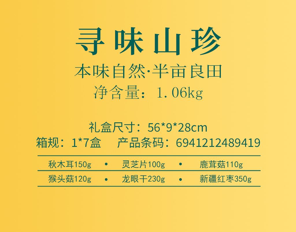 產(chǎn)品配置: 野生秋木耳150g 精選靈芝片100g 精選鹿茸菇110g 精選猴頭菇120g 泰國龍眼干230g 新疆紅棗350g 凈含量:1.06kg 禮盒尺寸:56*9*28cm 精選野生秋木耳、珍有菌菇、滋補(bǔ)靈芝,搭配香甜果干。 精美罐裝禮盒,把自然好味與健康一同打包。