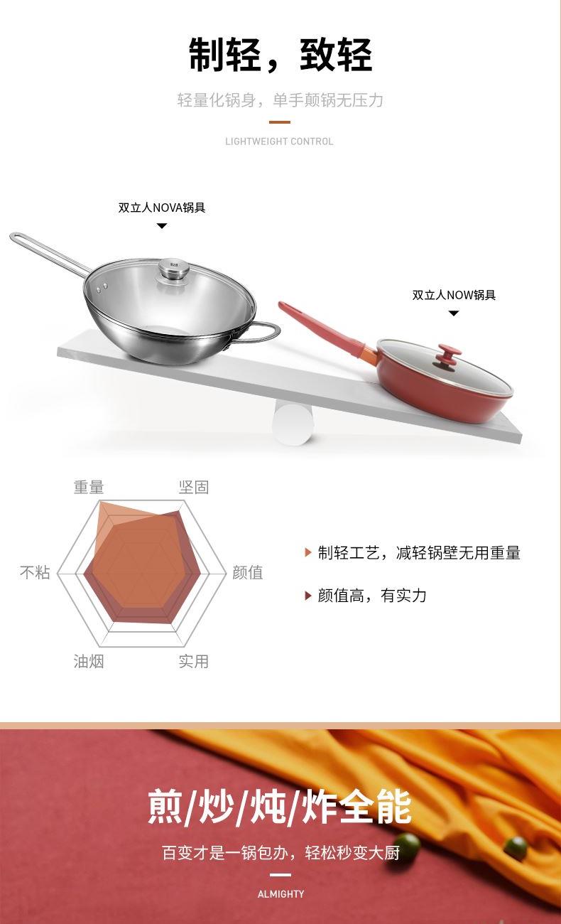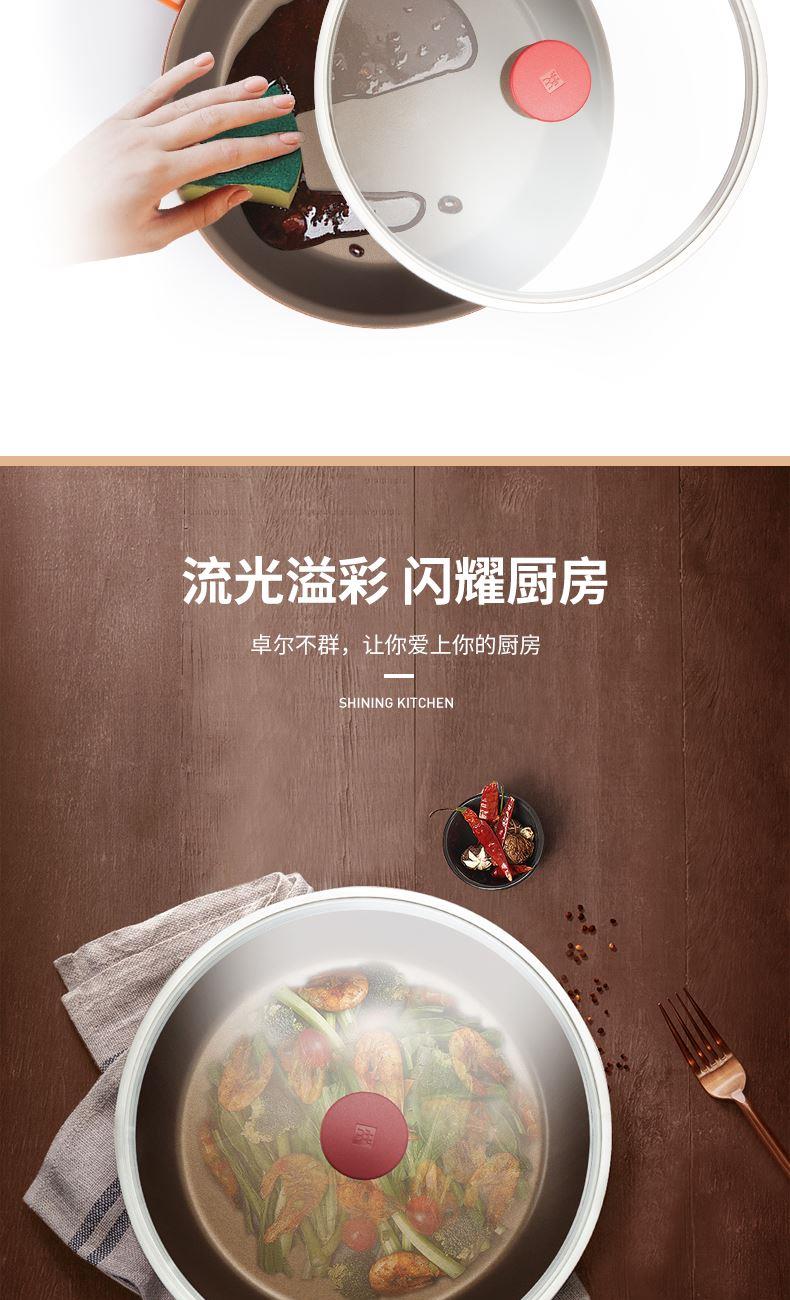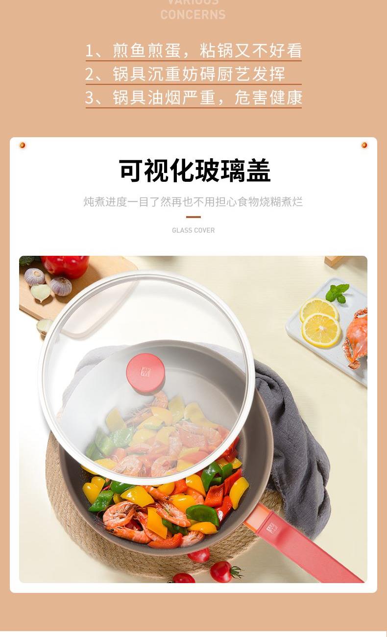 2、玻璃鍋蓋,可直觀地享受烹飪?nèi)窟^(guò)程,長(zhǎng)柄設(shè)計(jì),可掂鍋翻炒,鍋型更適合中式烹飪。