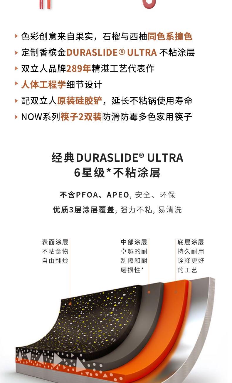 1、采用經(jīng)典DURASLIDE ULTRA不粘涂層,不含PFOA、APEO,安全、環(huán)保優(yōu)質(zhì)3層涂層覆蓋,強(qiáng)力不粘,易清洗