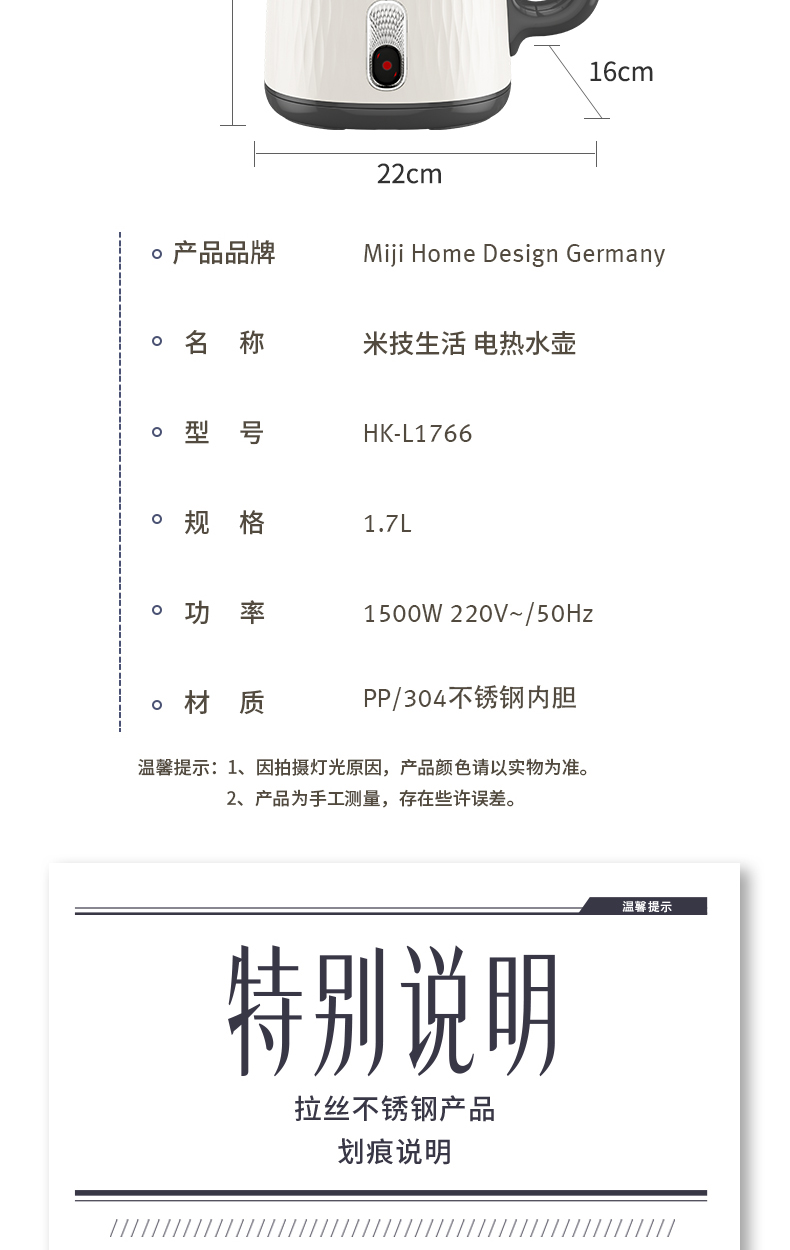 型號:HK-L1766 規(guī)格:1.7L 功率:1500W 220V~/50Hz 材質(zhì):PP/304不銹鋼內(nèi)膽 顏色:白色系 容量:1.7L 額定電壓:220V 電源線長:0.7m 額定功率:1500W 產(chǎn)品凈重:1kg