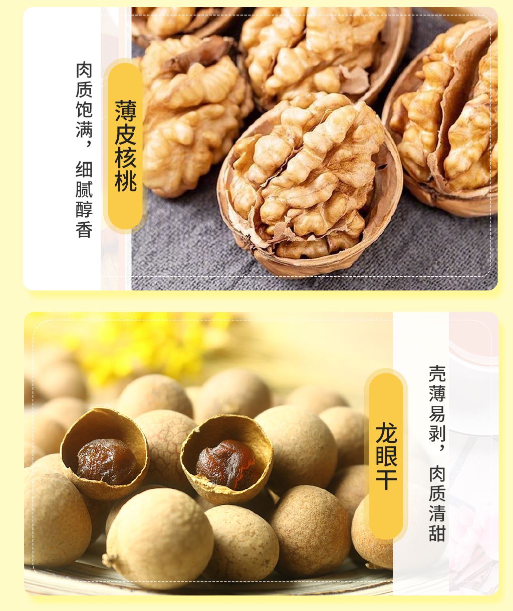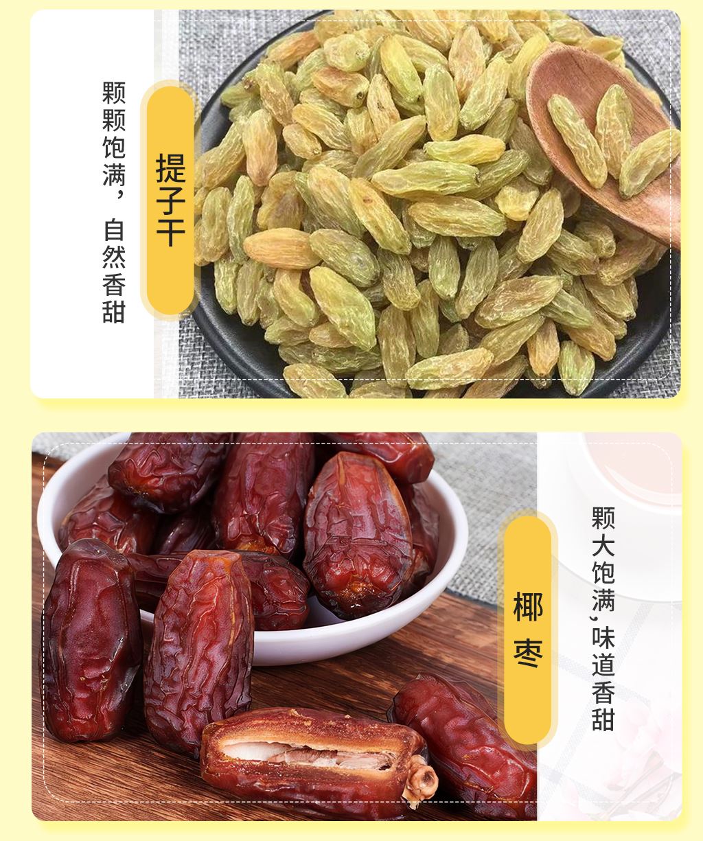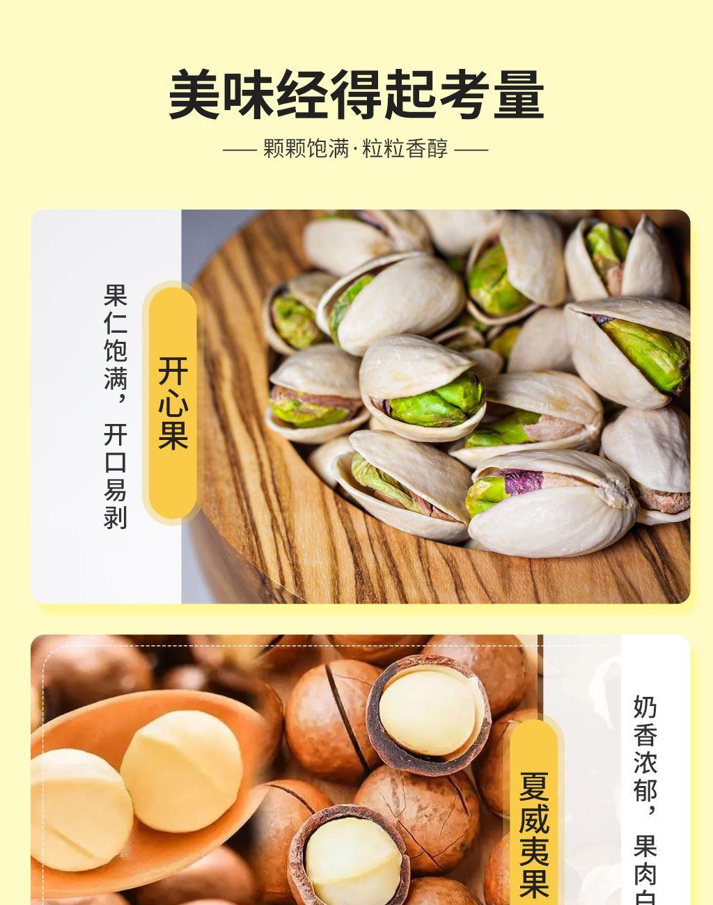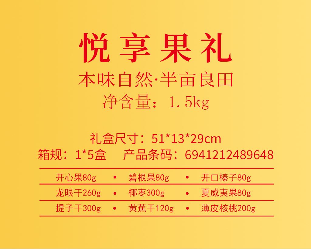 產(chǎn)品配置: 美國(guó)開(kāi)心果80g 美國(guó)開(kāi)口榛子80g 美國(guó)碧根果80g 澳洲夏威夷果80g 泰國(guó)龍眼干260g 阿聯(lián)酋椰棗300g 北美提子干300g 東南亞黃蕉干120g 美國(guó)薄皮核桃200g 凈含量:1.5Kg 禮盒尺寸:51*13*29cm