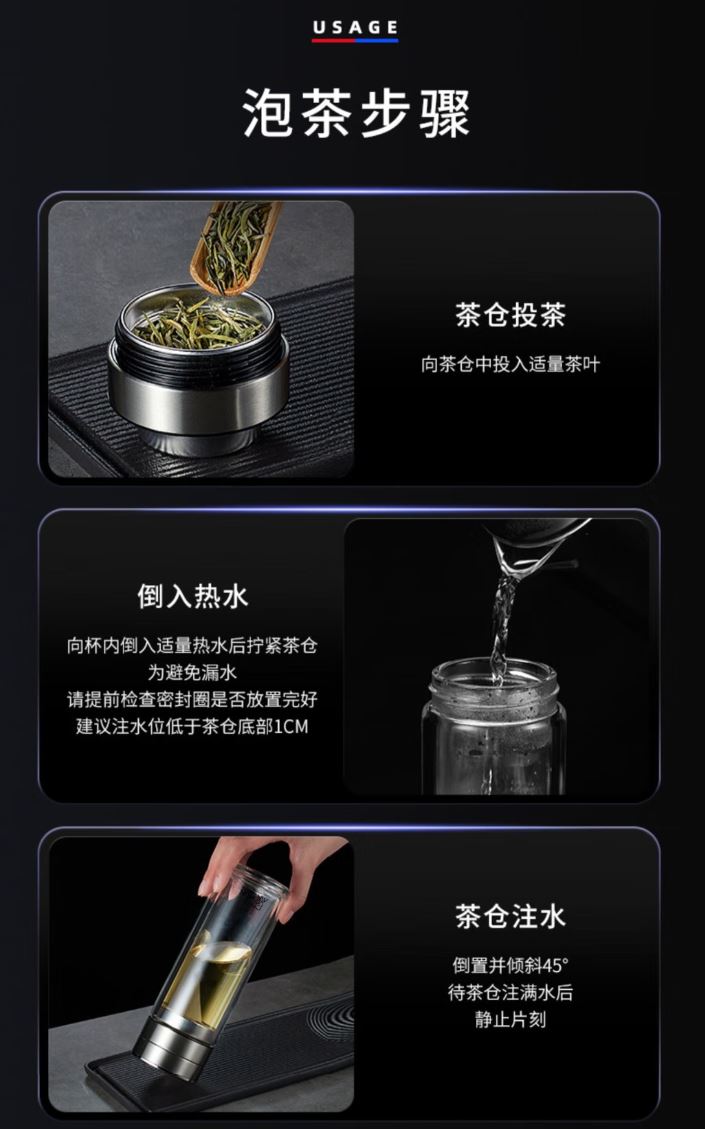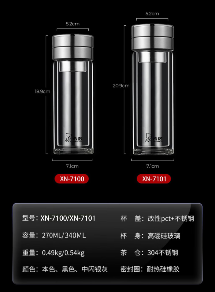 容量 XN-7100:290ml 規(guī)格(mm)XN-7100:52(杯口直徑)×71(直徑)×189(高度) 杯體 雙層高硼硅玻璃 杯蓋 食品級PP、304不銹鋼 密封圈 食品級硅膠 濾網(wǎng) 304不銹鋼、食品級硅膠 重量 XN-7100:0.49kg 顏色 黑色、本色、中閃銀灰
