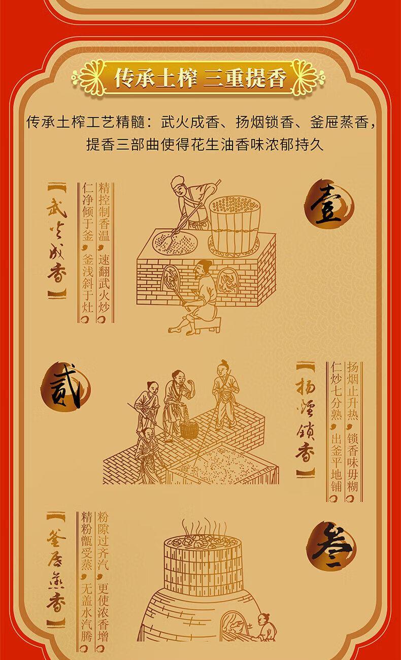 非遺土榨三重提香禮盒:非遺土榨技藝,武火成香、揚煙鎖香、釜屜蒸香三步曲,花生焦香濃郁,1.2L*3 精致規(guī)格,送禮自用兩相宜