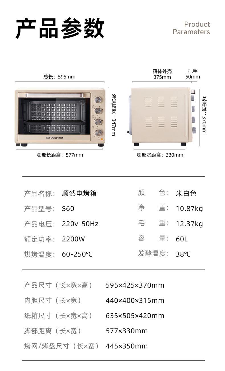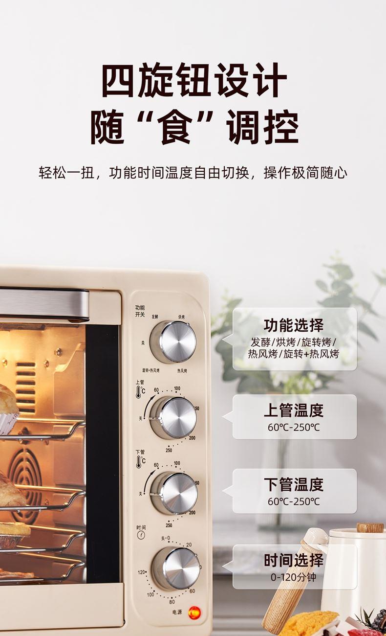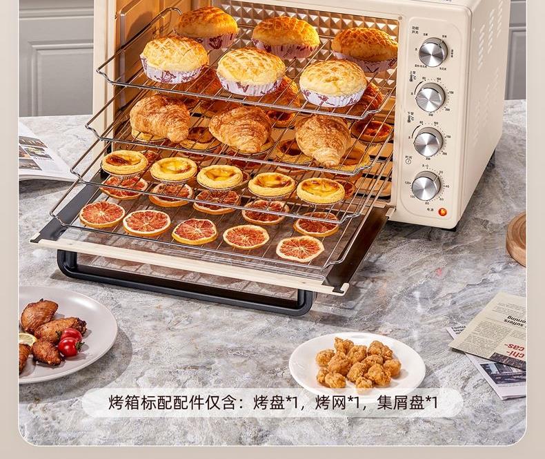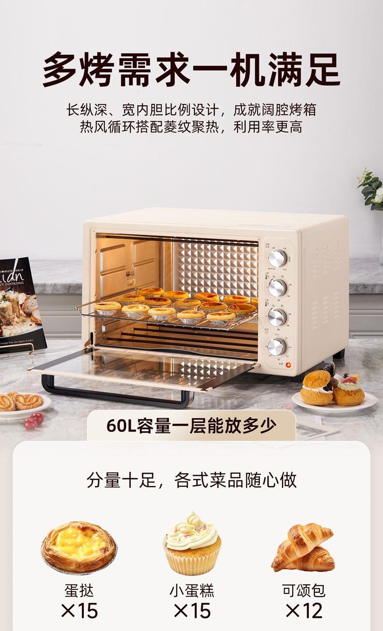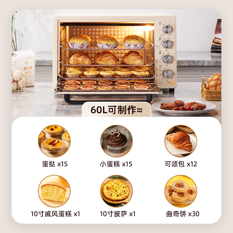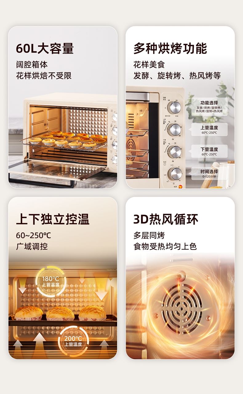 性能配置:60L 大容量,2200W,適配多種烤制需求; 具備低溫發(fā)酵、內(nèi)置照明、360 度旋轉(zhuǎn)烤叉功能; 材質(zhì)優(yōu)勢:發(fā)熱管為不銹鋼材質(zhì),內(nèi)膽是不沾油涂層,電腦式控制,臺式款式,擺放靈活,4 層烤位; 加熱系統(tǒng):熱風循環(huán),熱量均勻; 上下管獨立控溫,60 - 250℃廣域調(diào)溫;