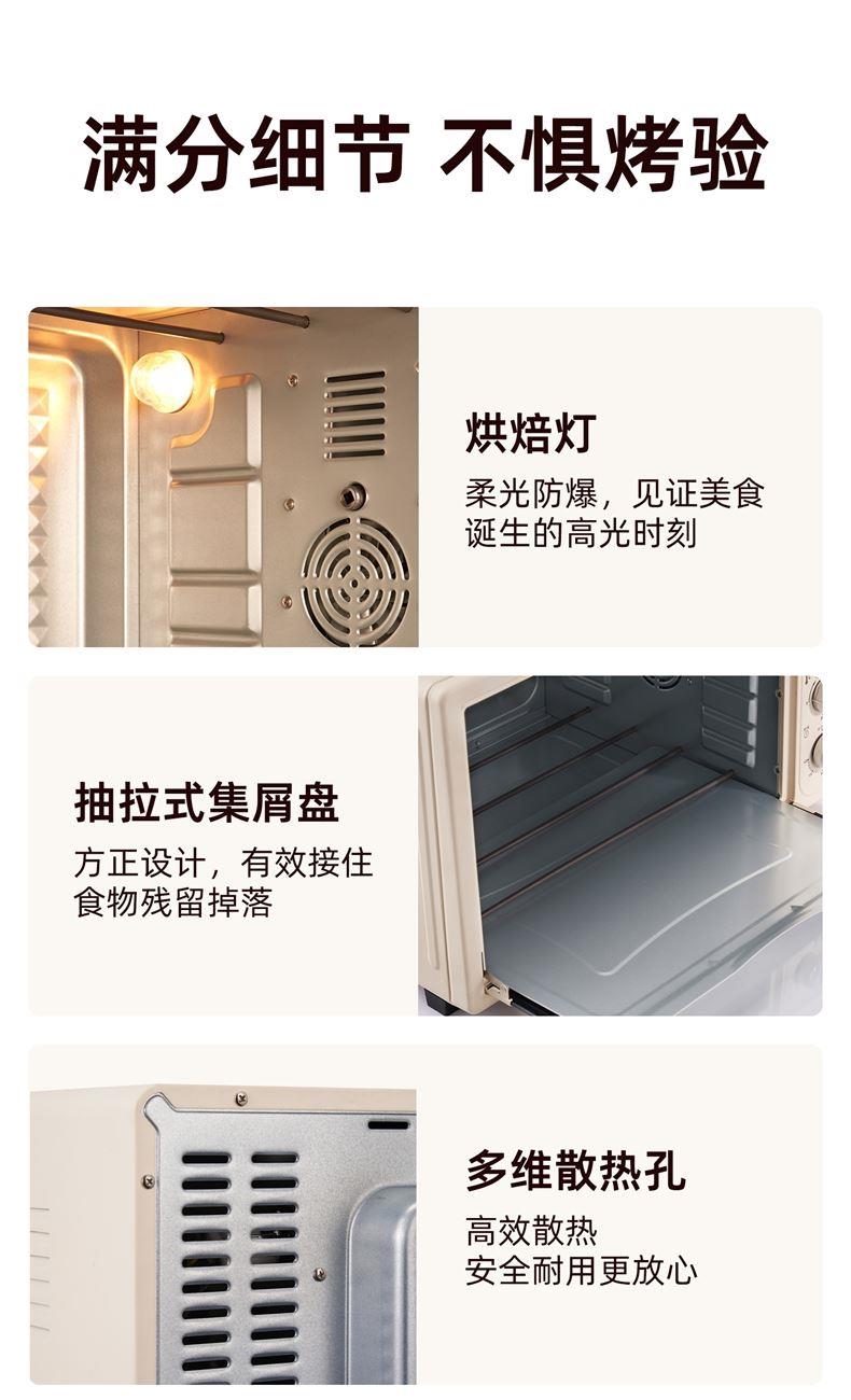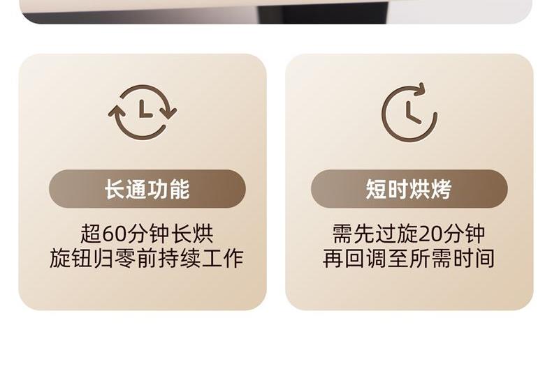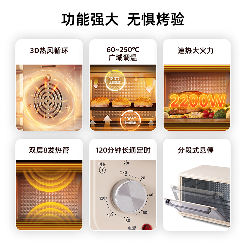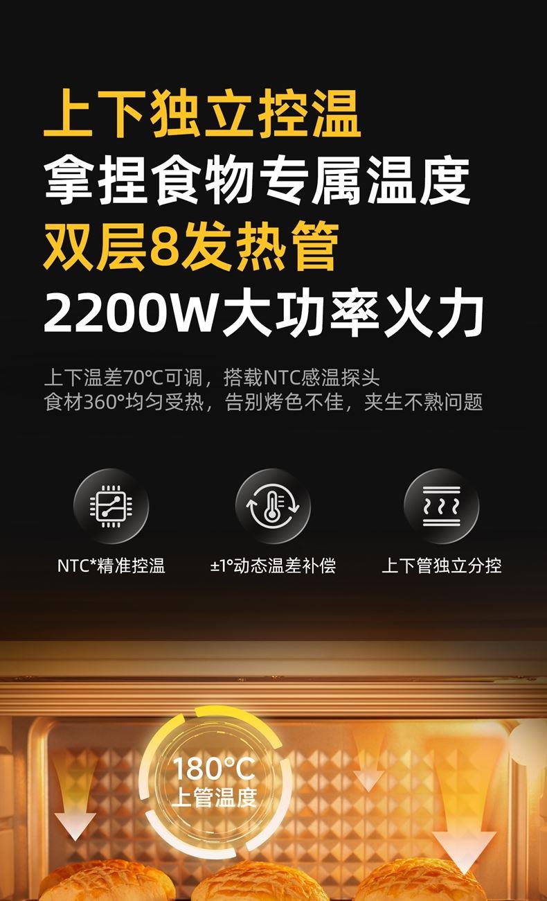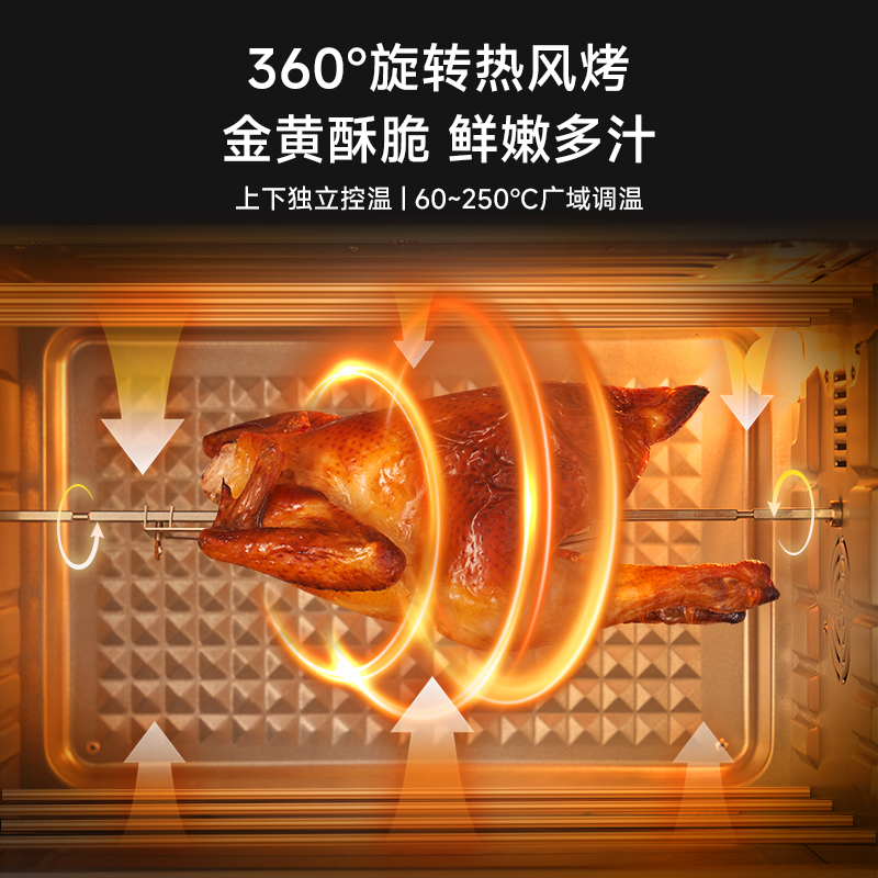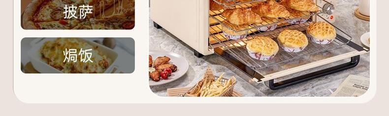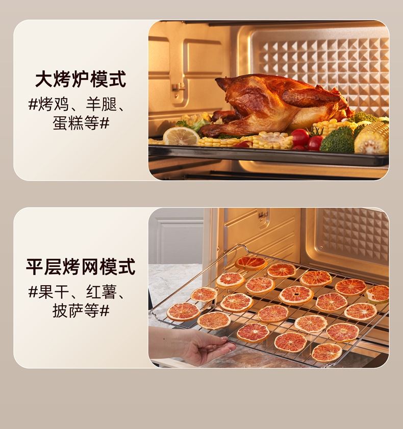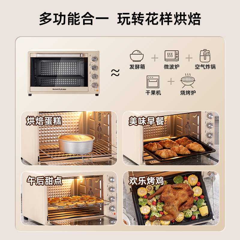 性能配置:60L 大容量,2200W,適配多種烤制需求; 具備低溫發(fā)酵、內(nèi)置照明、360 度旋轉(zhuǎn)烤叉功能; 材質(zhì)優(yōu)勢:發(fā)熱管為不銹鋼材質(zhì),內(nèi)膽是不沾油涂層,電腦式控制,臺式款式,擺放靈活,4 層烤位; 加熱系統(tǒng):熱風循環(huán),熱量均勻; 上下管獨立控溫,60 - 250℃廣域調(diào)溫;