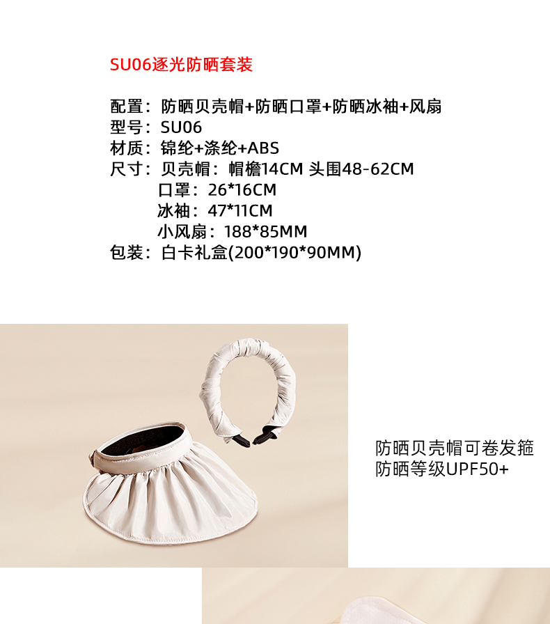配置:防曬貝殼帽+防曬口罩+防曬冰袖+風(fēng)扇 型號(hào):SU06 材質(zhì):錦綸+滌綸+ABS 尺寸:貝殼帽:帽檐14cm 頭圍48-62cm 口罩:26*16cm 冰袖:47*11cm 小風(fēng)扇:188*85mm 包裝:白卡禮盒(200*190*90mm)
