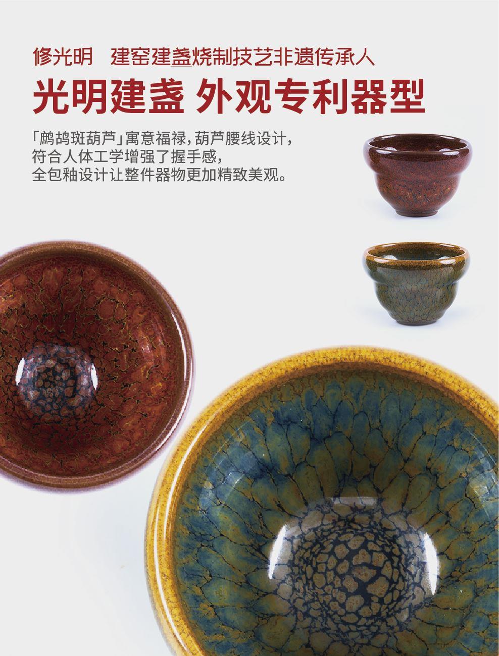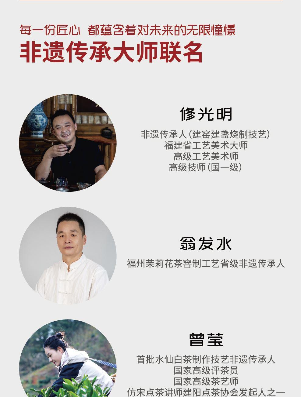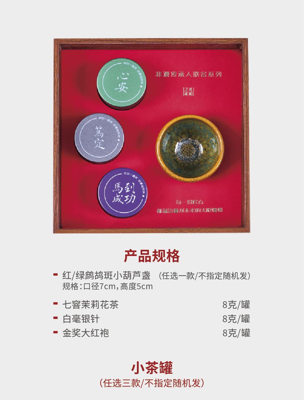 -非遺修光明建盞*1(規(guī)格:口徑7高度5cm) -福州茉莉花茶*8克/罐(省級非遺翁發(fā)水) -荒野白毫銀針*8克/罐(首批水仙白非遺曾瑩) -金獎大紅袍*8克/罐(2025“媽祖杯”大紅袍金獎) -禮盒尺寸:21*21*7cm
