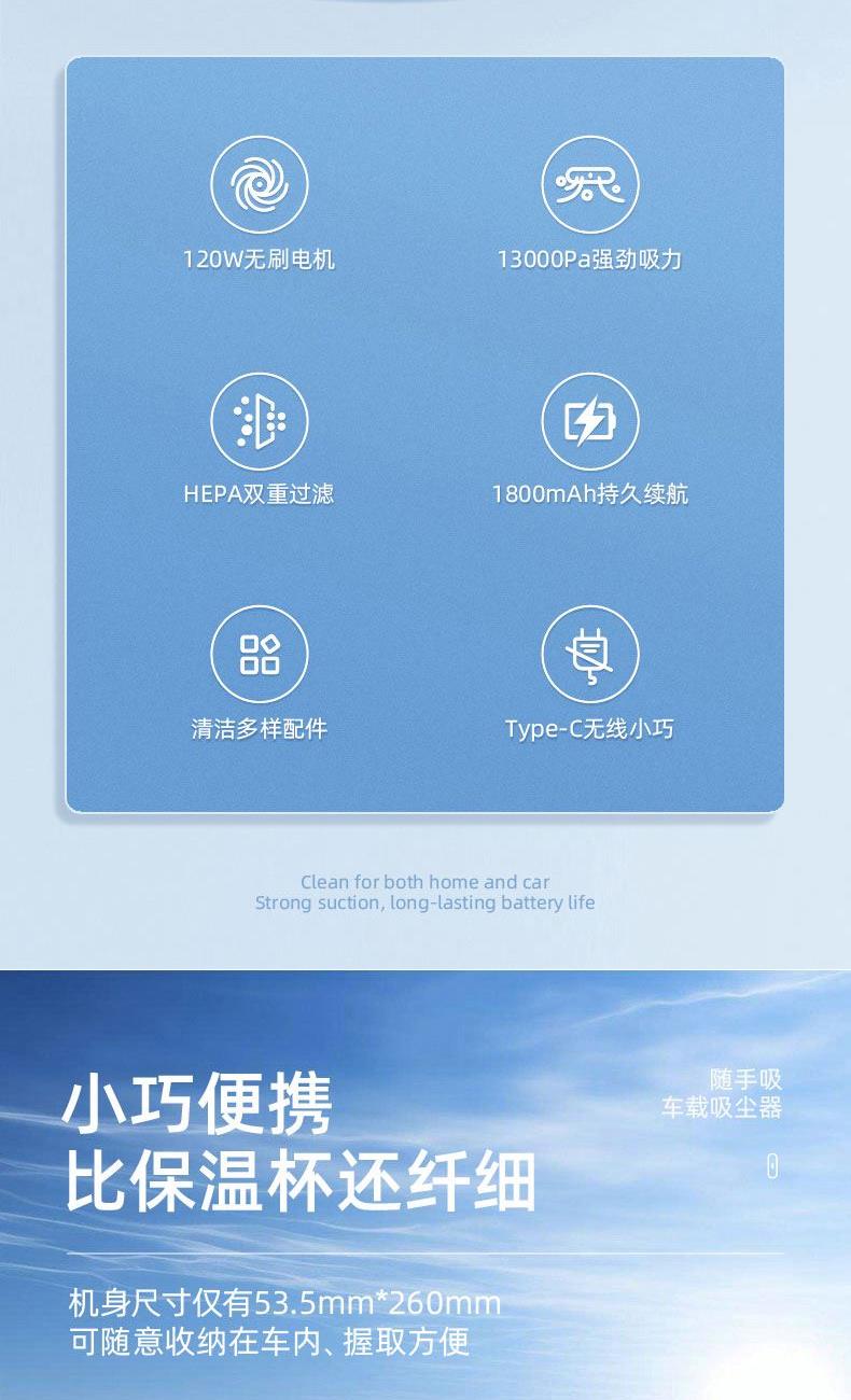 ? 小巧便攜,機身尺寸僅有53.5mm*260mm可隨意收納在車內(nèi)、握取方便;