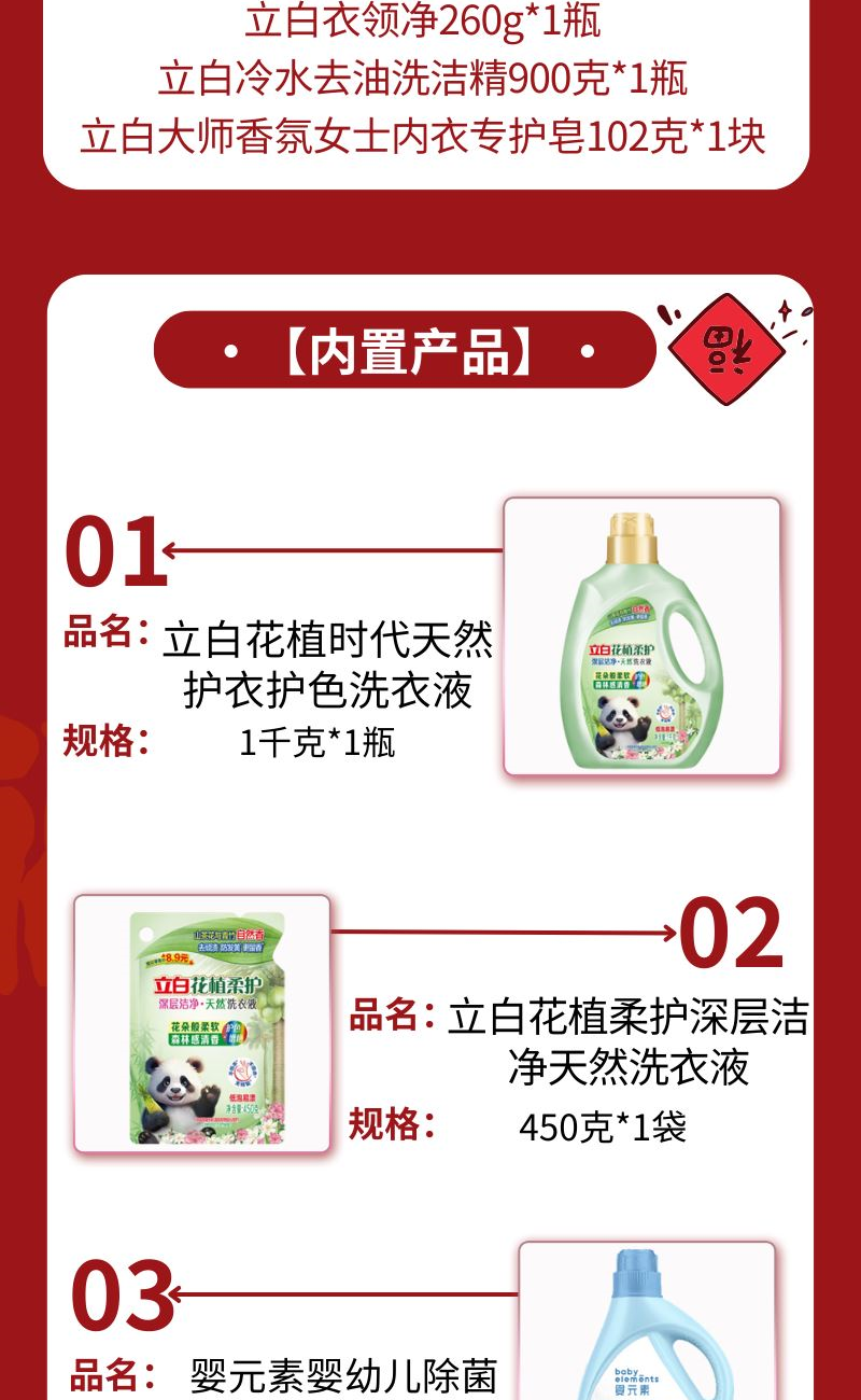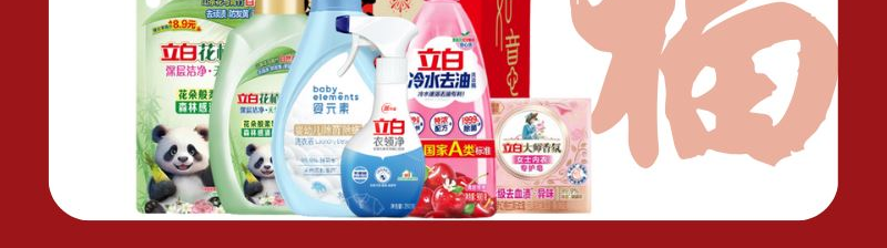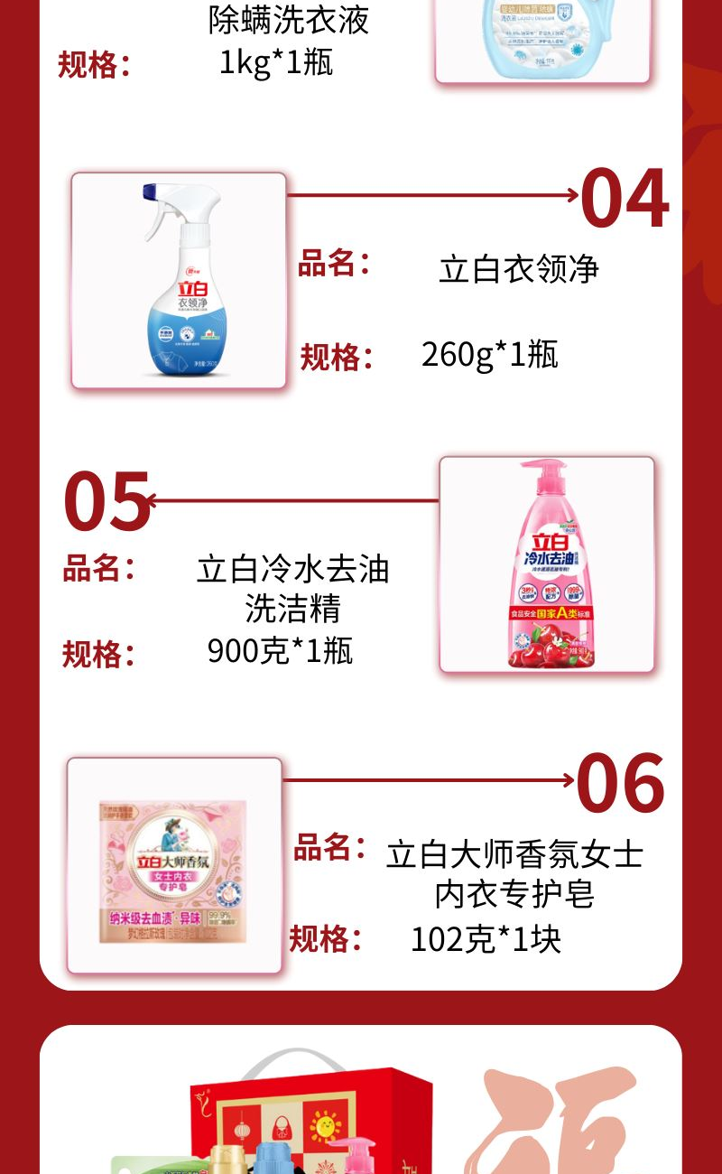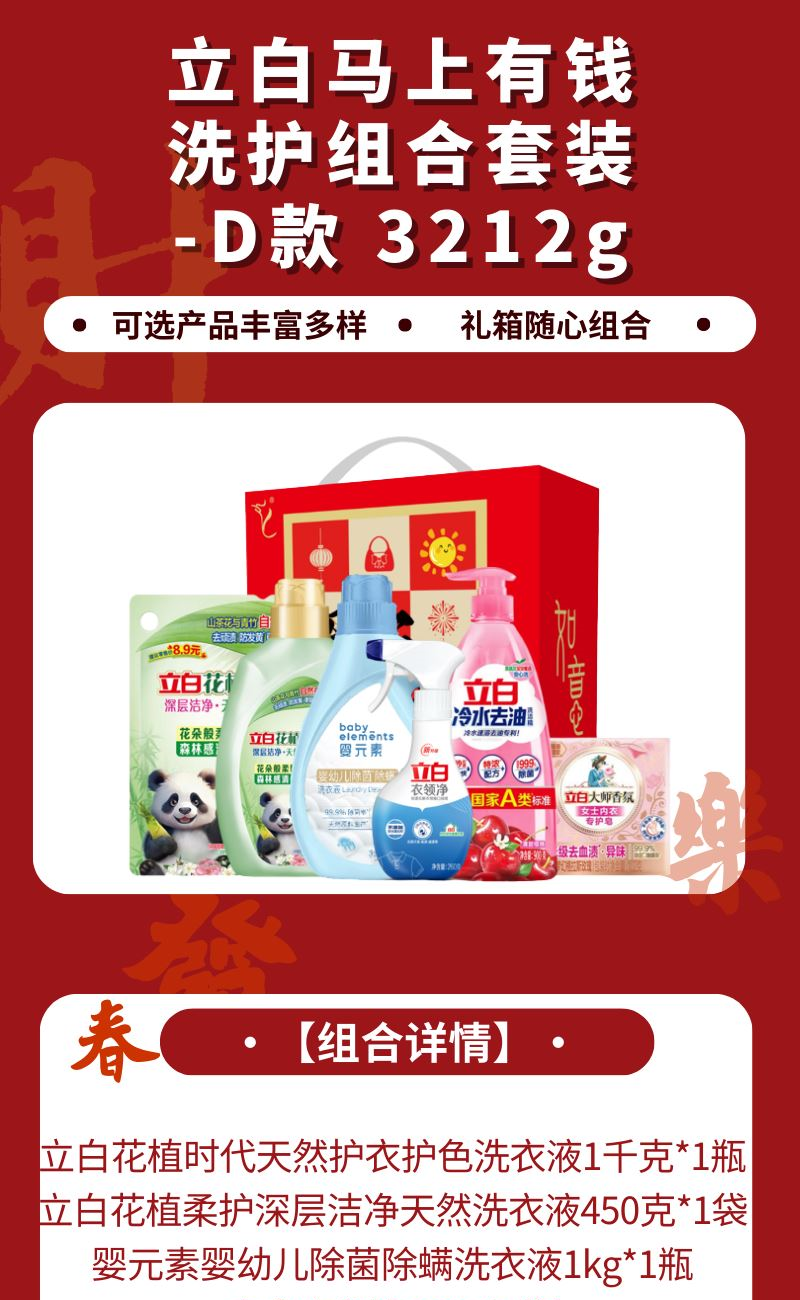 配置: 立白花植時代天然護(hù)衣護(hù)色洗衣液1千克*1瓶 立白花植柔護(hù)深層潔凈天然洗衣液450克*1袋 嬰元素嬰幼兒除 菌除螨洗衣液1kg*1瓶 立白衣領(lǐng)凈260g*1瓶 立白冷水去油洗潔精900克*1瓶 立白大師香氛女士內(nèi)衣專護(hù)皂102克*1塊 賣點: 可選產(chǎn)品豐富多樣,禮箱隨心組合,多種價位因需而定,充分滿足各種送禮需求,是商務(wù)送禮、單位福利的用心之選。