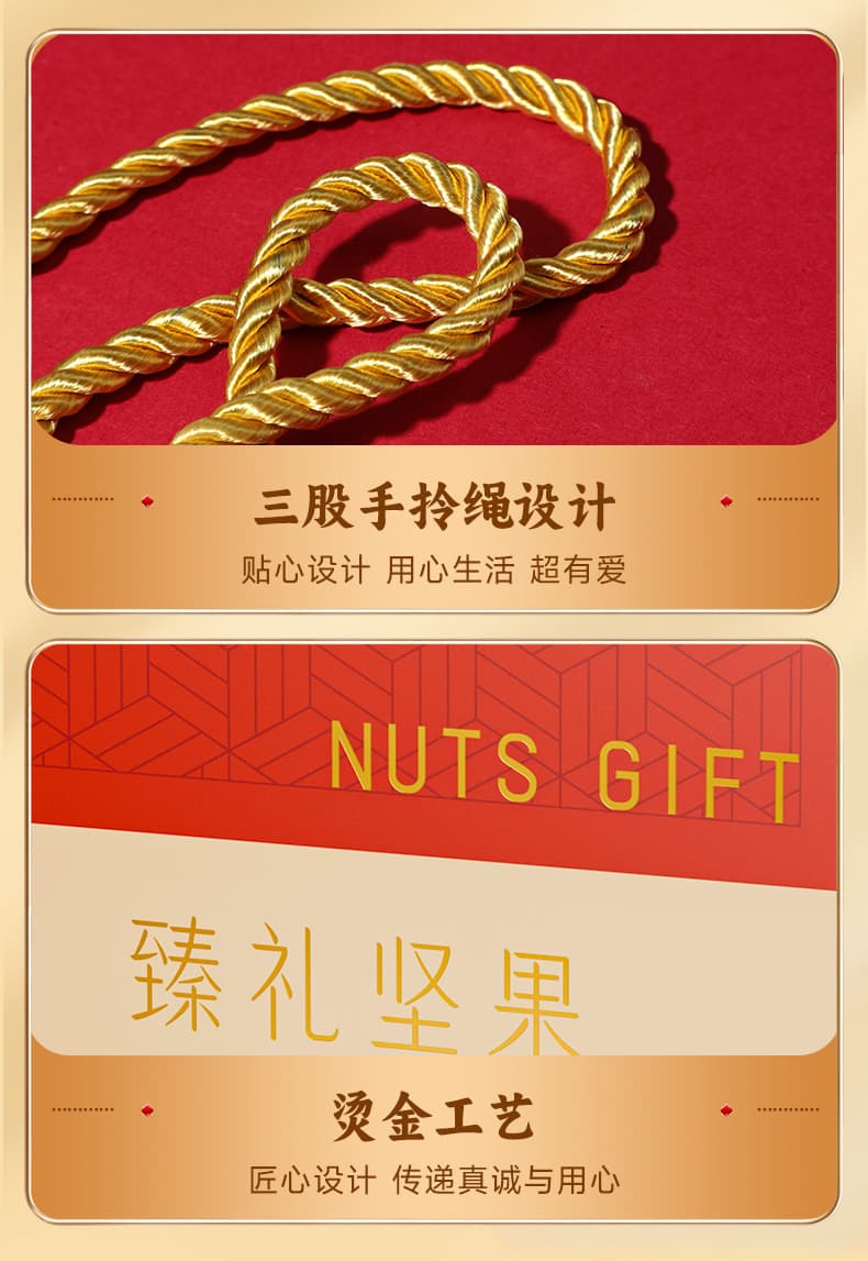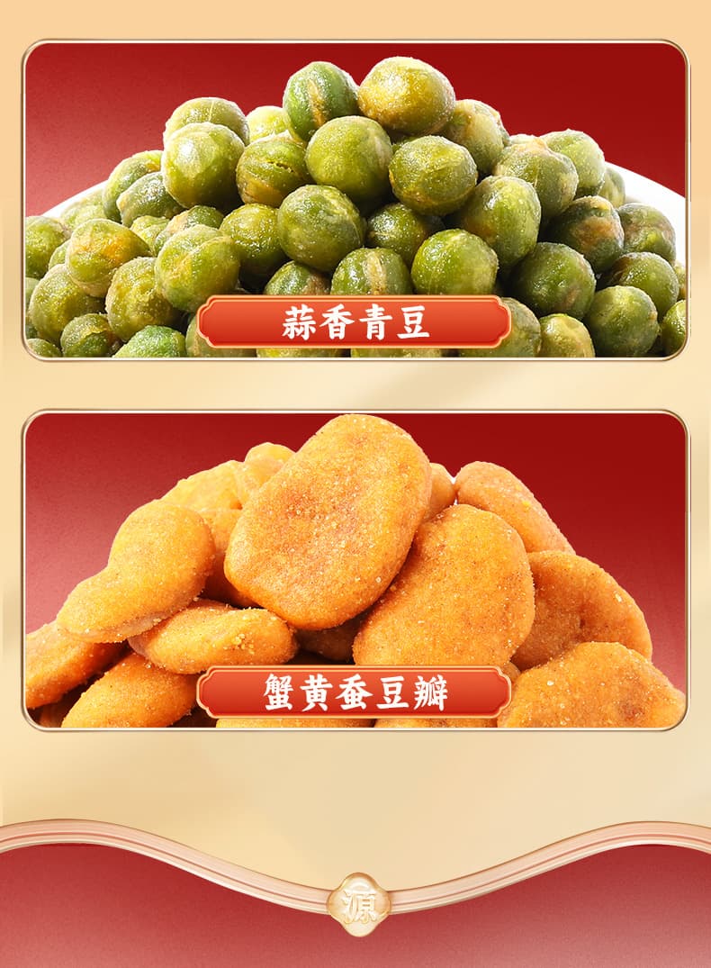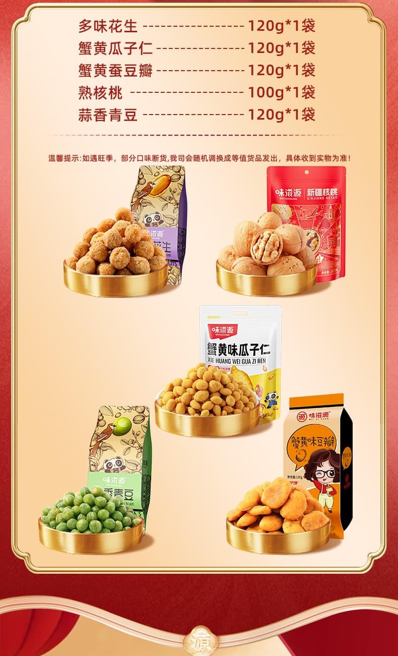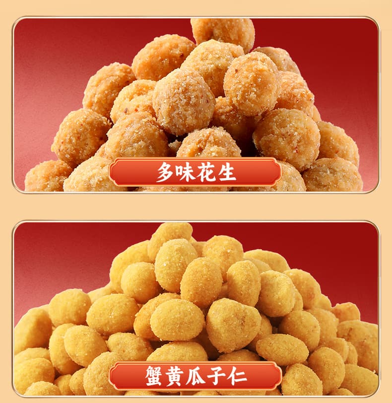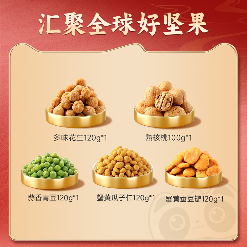克重:580克 內(nèi)配: 1.熟核桃100g*1袋 2.蒜香青豆120g*1袋 3.多味花生120g*1袋 4.蟹黃蠶豆瓣120g*1袋 5.蟹黃瓜子仁120g*1袋 禮盒規(guī)格:260*68*350mm 保質(zhì)期:8月
