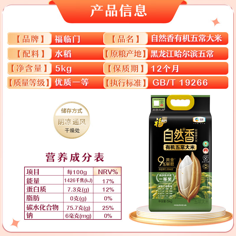 中糧福臨門福臨門自然香有機(jī)五常大米5kg 中糧福臨門福臨門自然香有機(jī)五常大米5kg