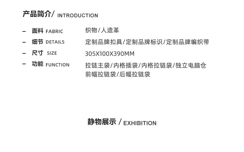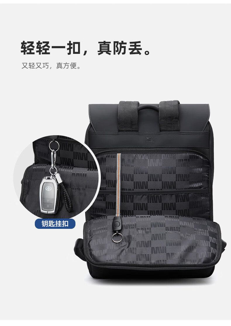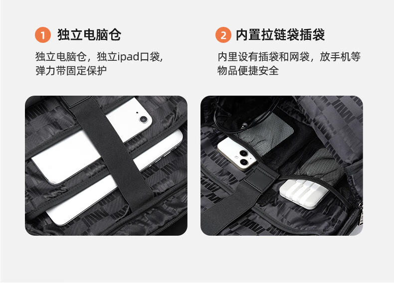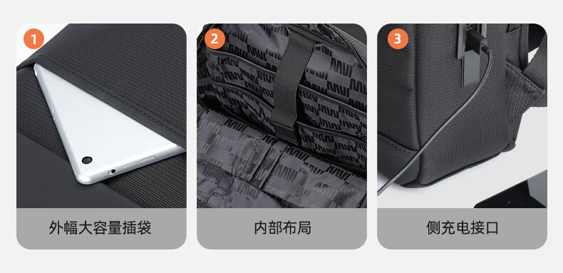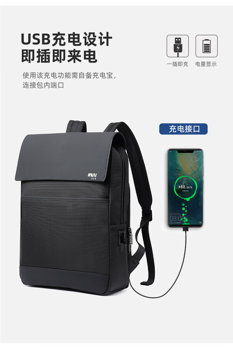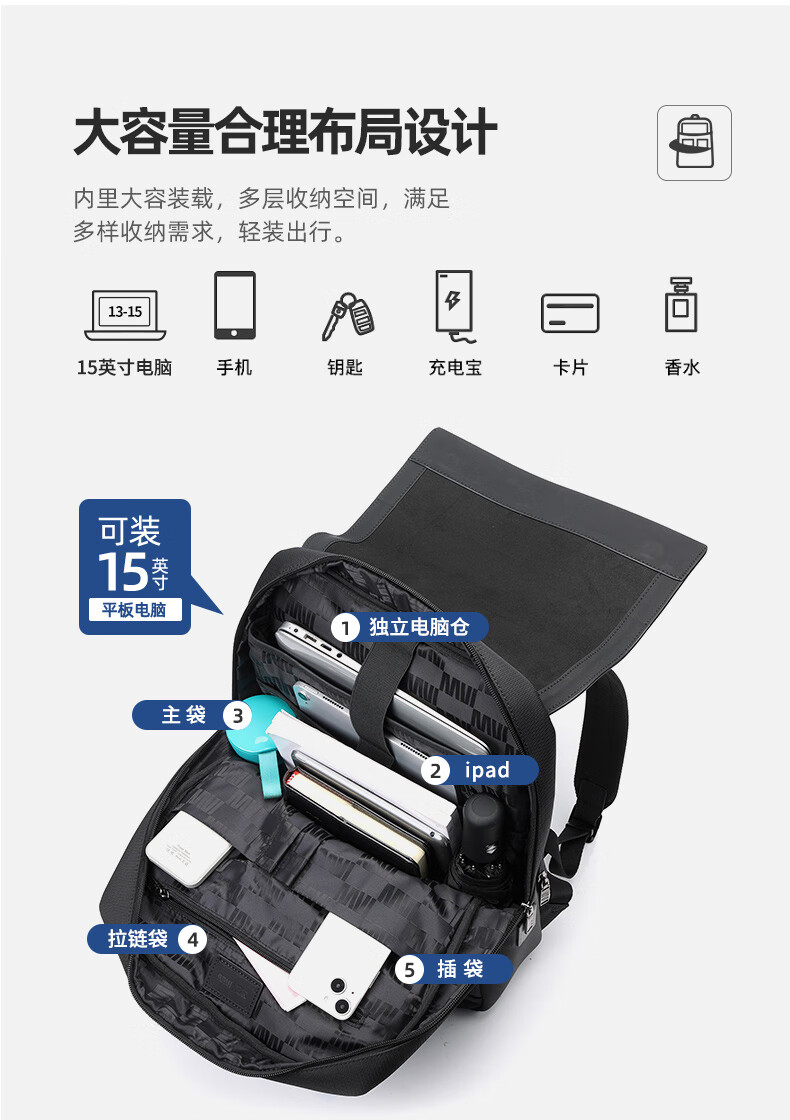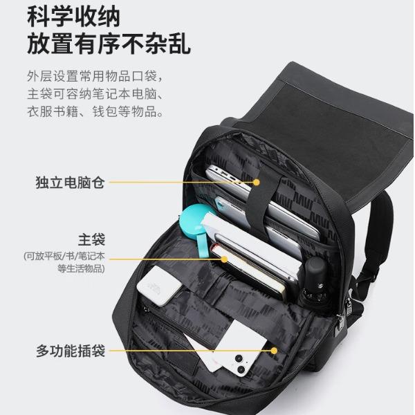 內(nèi)里大容裝載,多層收納空間,滿足多樣收納需求,輕裝出行,采用高密度織物面料,防刮耐用,防潑賤,輕松應(yīng)對(duì)潑水,便攜外置USB充電接口,3D透氣蜂窩設(shè)計(jì),柔軟減壓肩帶