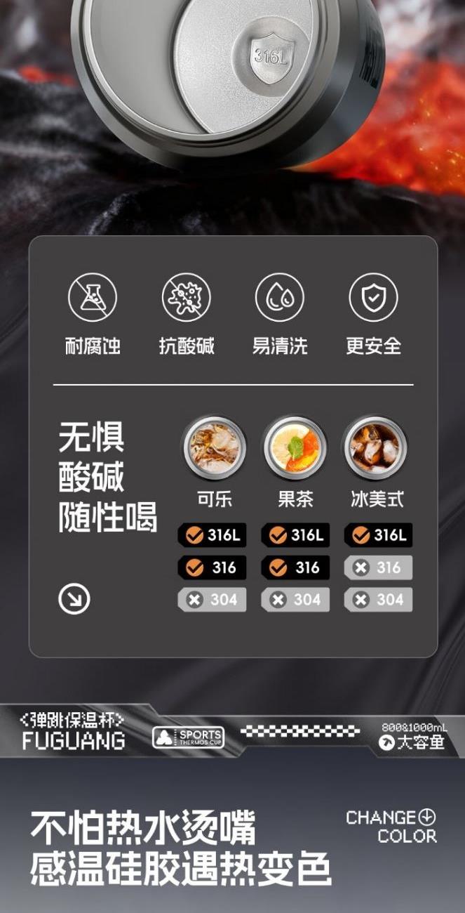 容量:800/1000ml 顏色:黑色灰本色 尺寸:82*274mm 材質(zhì):316L奧氏體不銹鋼內(nèi)膽、食品級PP,PC配件。 不怕熱水燙嘴感溫硅膠遇熱變色。 食品級吸管設(shè)計柔軟不上嘴,便攜是手方便出行,硅膠耐磨底墊靜音防滑設(shè)計。 包裝:單瓦盒