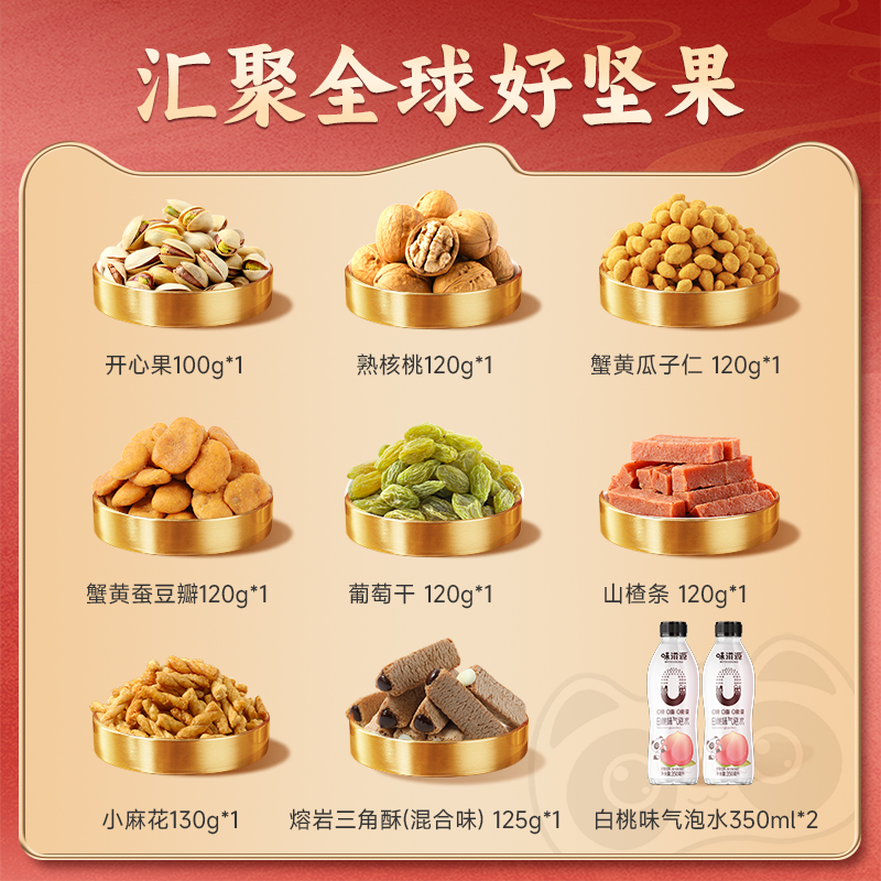 克重:1655克 內(nèi)配: 1.熟核桃120g*1袋 2.開心果100g*1袋 3.蟹黃蠶豆瓣120g*1袋 4.蟹黃瓜子仁120g*1袋 5.山楂條120g*1袋 6.葡萄干120g*1袋 7.小麻花130g*1袋 8.熔巖三角酥125g*1袋 9.白桃氣泡水350ml*2瓶 禮盒規(guī)格:380*270*130mmmm 保質(zhì)期:8月
