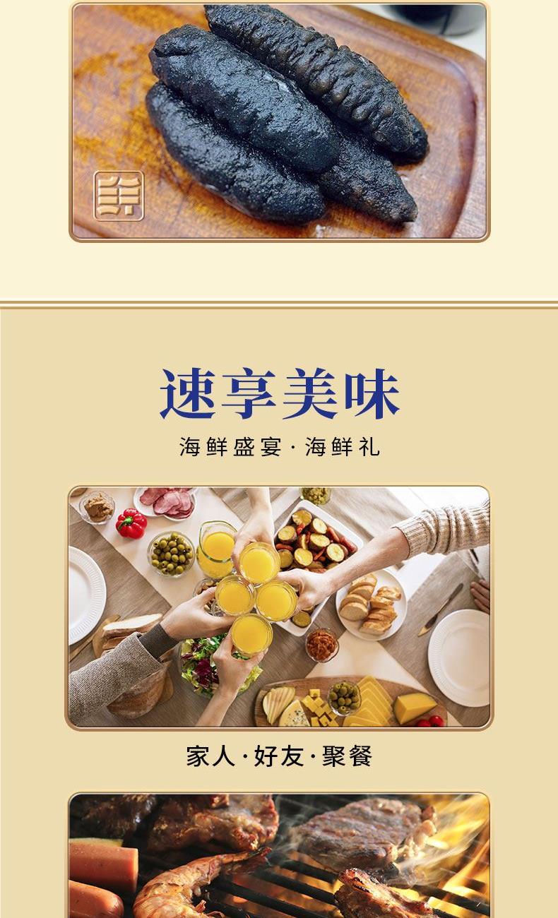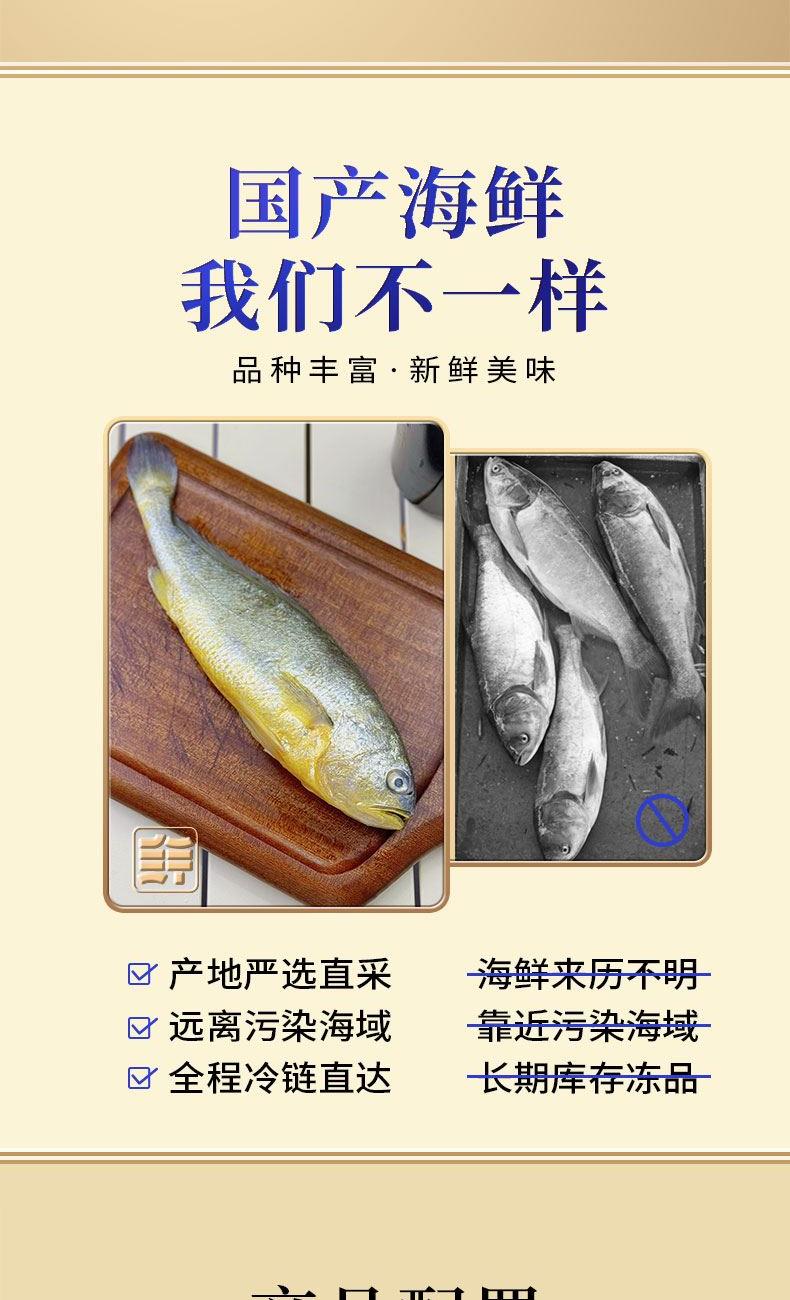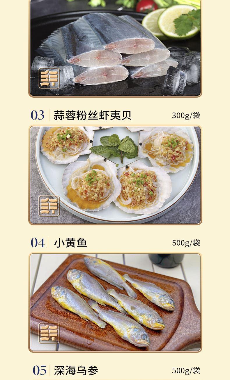 小黃魚500g*2袋 墨魚花250g×1袋 深海烏參500g×1袋 蒜蓉粉絲蝦夷貝300g×1袋 帶魚段800g×1袋