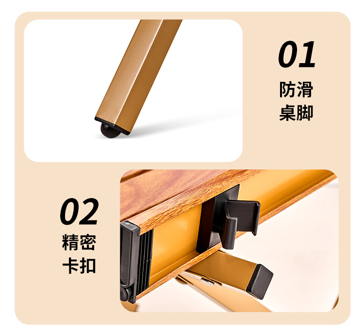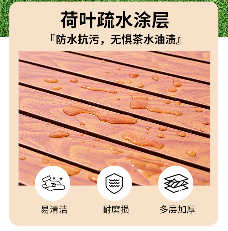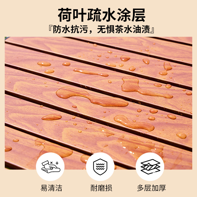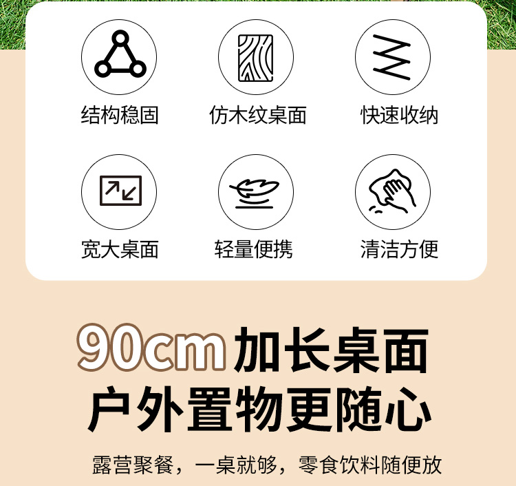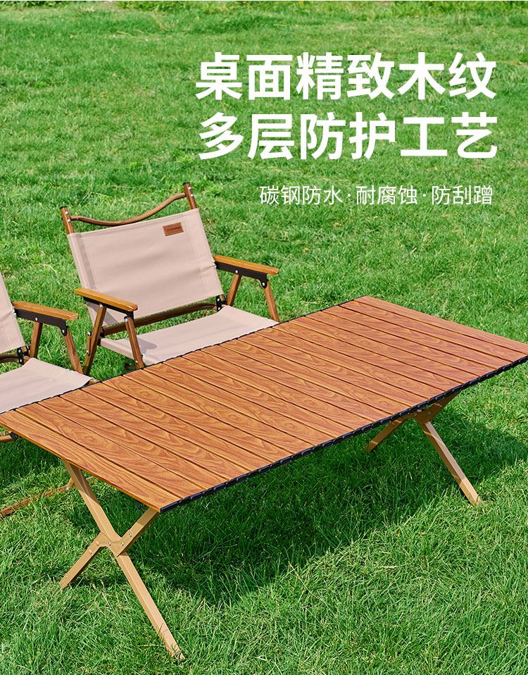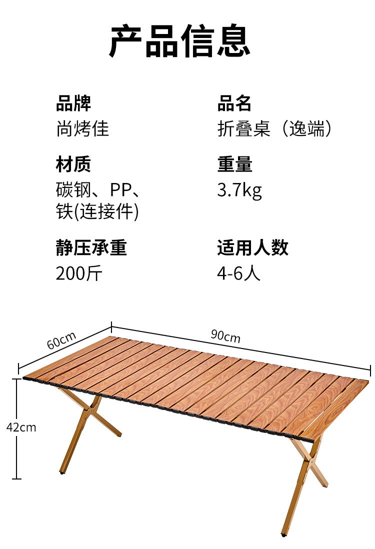 材質(zhì)碳鋼、PP、鐵(連接件) 靜壓承重200斤 重量3.7kg 適用人數(shù)4-6人 結(jié)構(gòu)穩(wěn)固、寬大桌面、仿木紋桌面、輕量便攜、快速收納、清潔方便、 精選優(yōu)質(zhì)碳鋼經(jīng)久耐用 桌面精致木紋多層防護工藝 碳鋼防水·耐腐蝕·防刮蹭