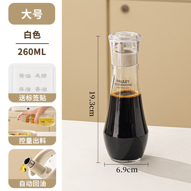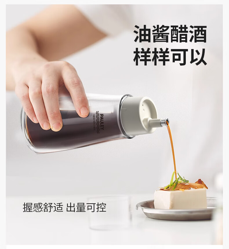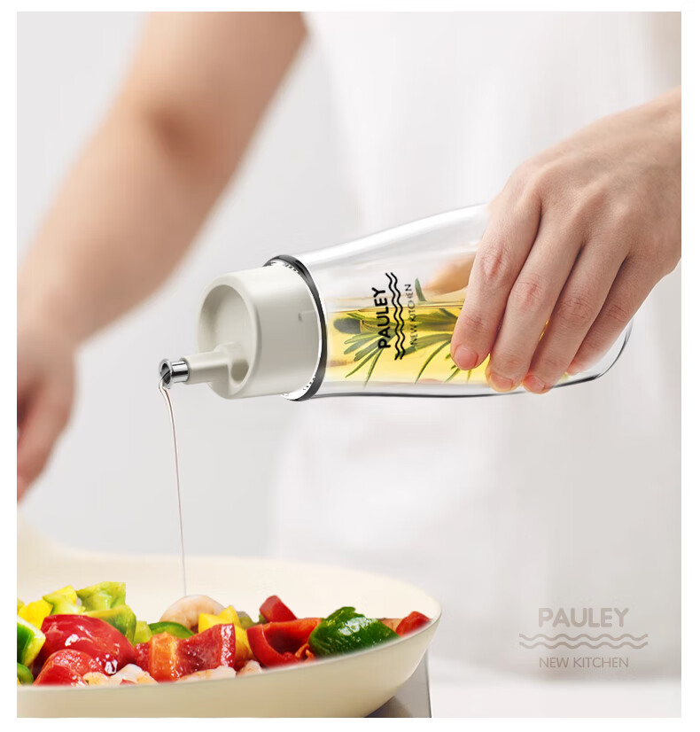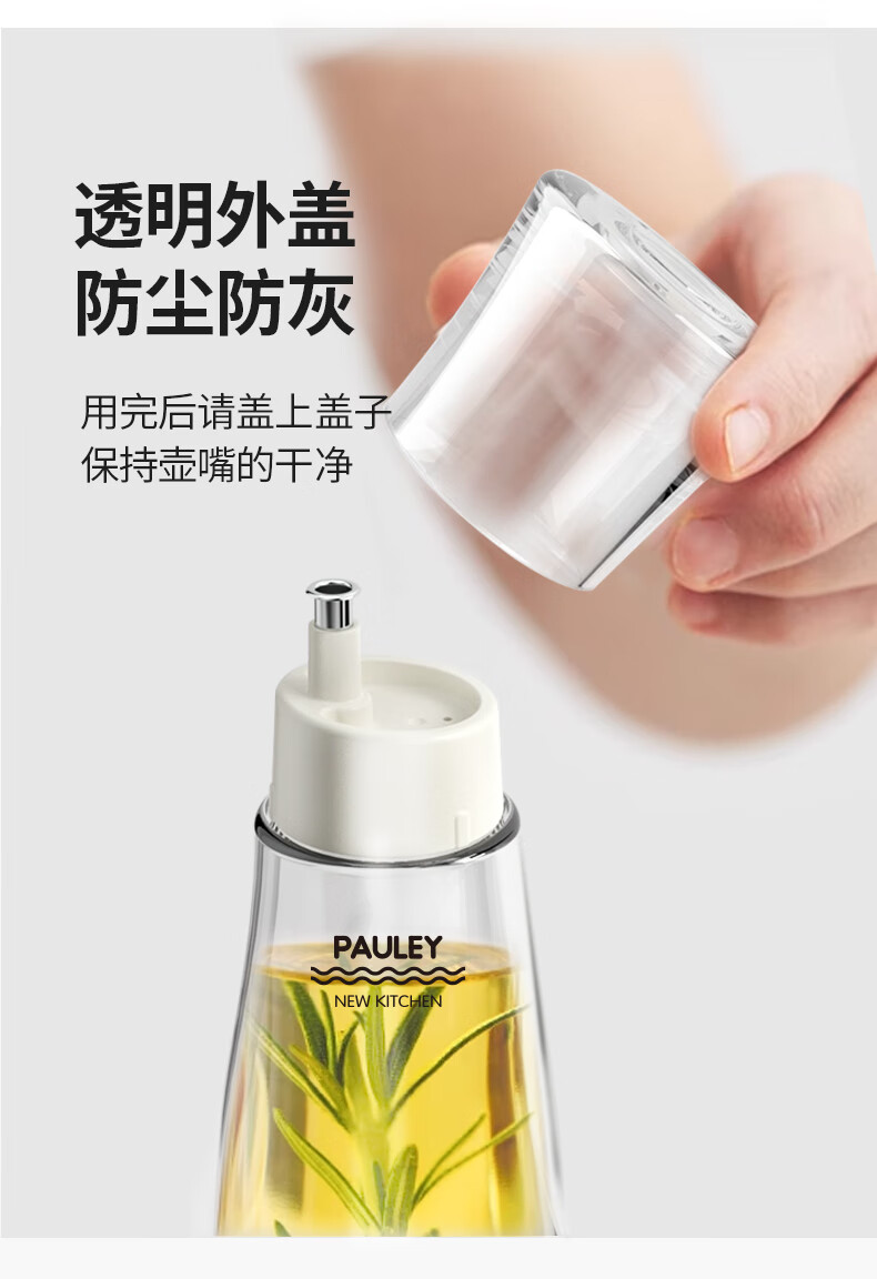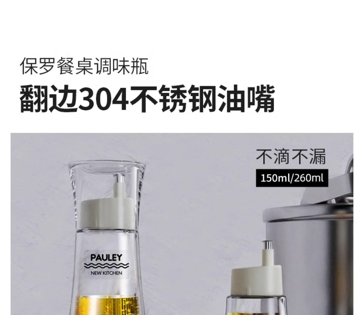 保羅餐桌調味瓶 透明外蓋防塵防灰,安全玻璃材質 翻邊304不銹鋼油嘴 防止滴掛,自動回吸,斷油利落 安全無異味 可視調味, 無鉛玻璃/安全耐用 隨心添加油量,螺紋瓶口/密封性能好 硅膠圈安全密封,不易灑漏/隨心放置/調味儲存更放心 加厚底部 穩(wěn)固耐用,一體成型/小巧精致/平穩(wěn)放置不易倒