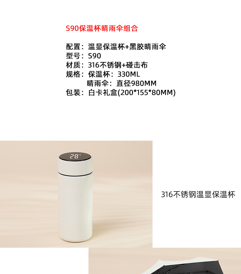 配置:溫顯保溫杯+黑膠晴雨傘 型號:S90 材質(zhì):316不銹鋼+碰擊布 規(guī)格:保溫杯:330ml 晴雨傘:直徑980mm 包裝:白卡禮盒(200*155*80mm)