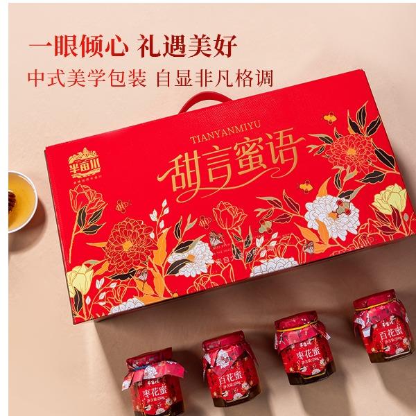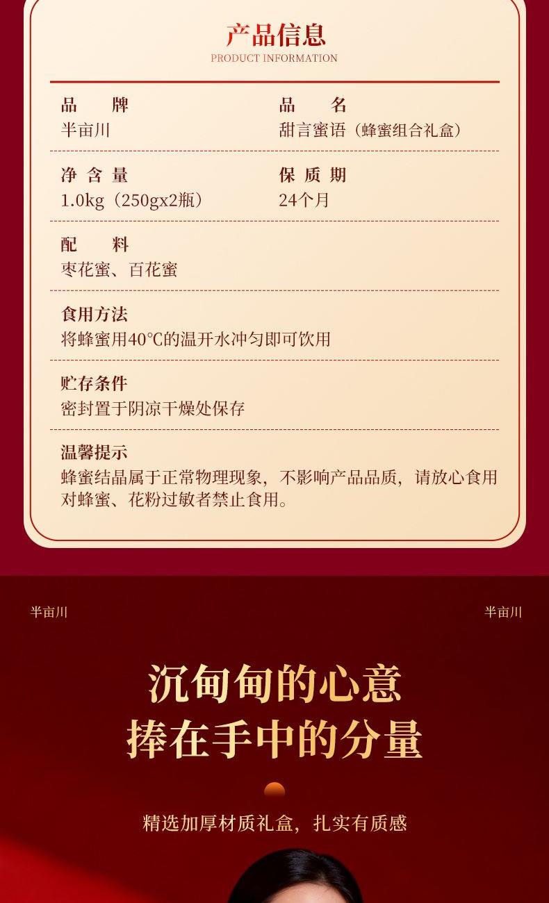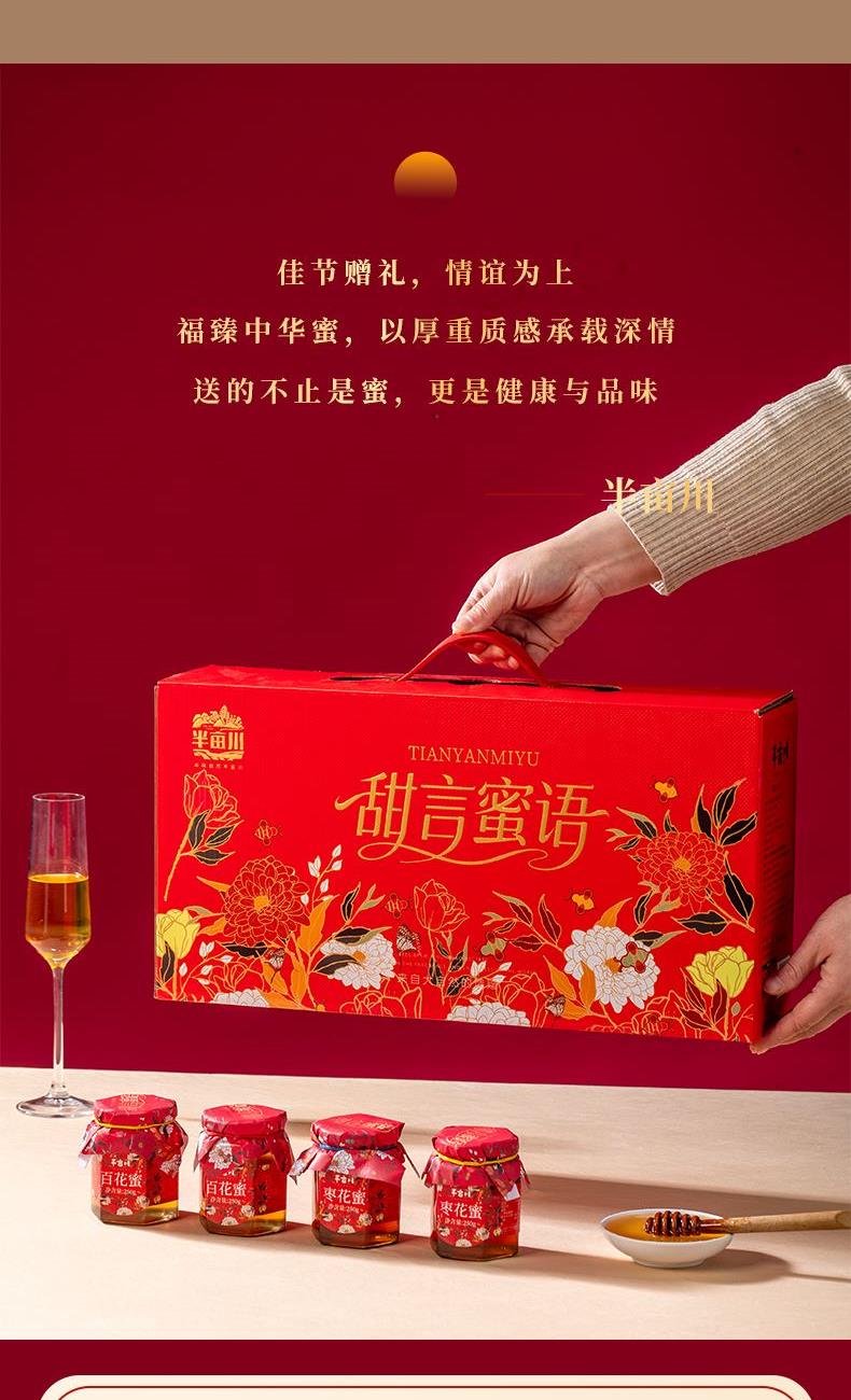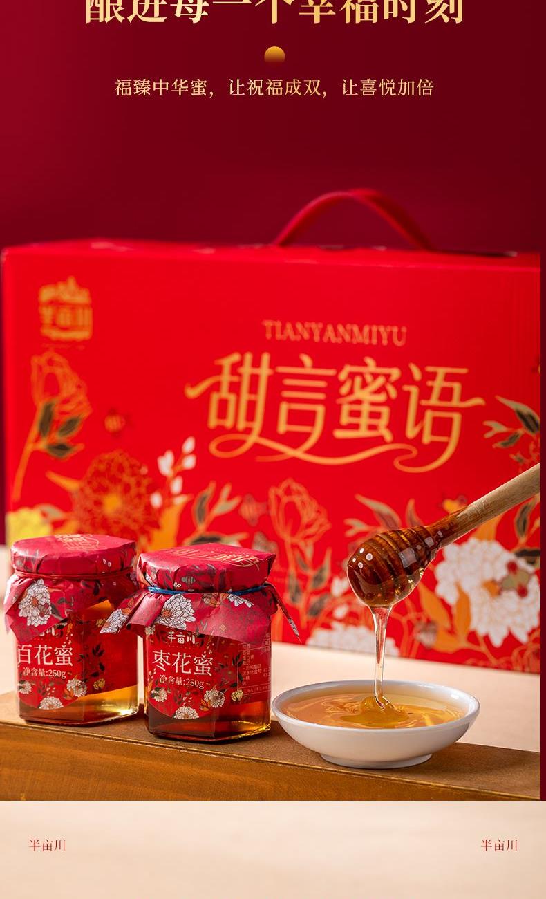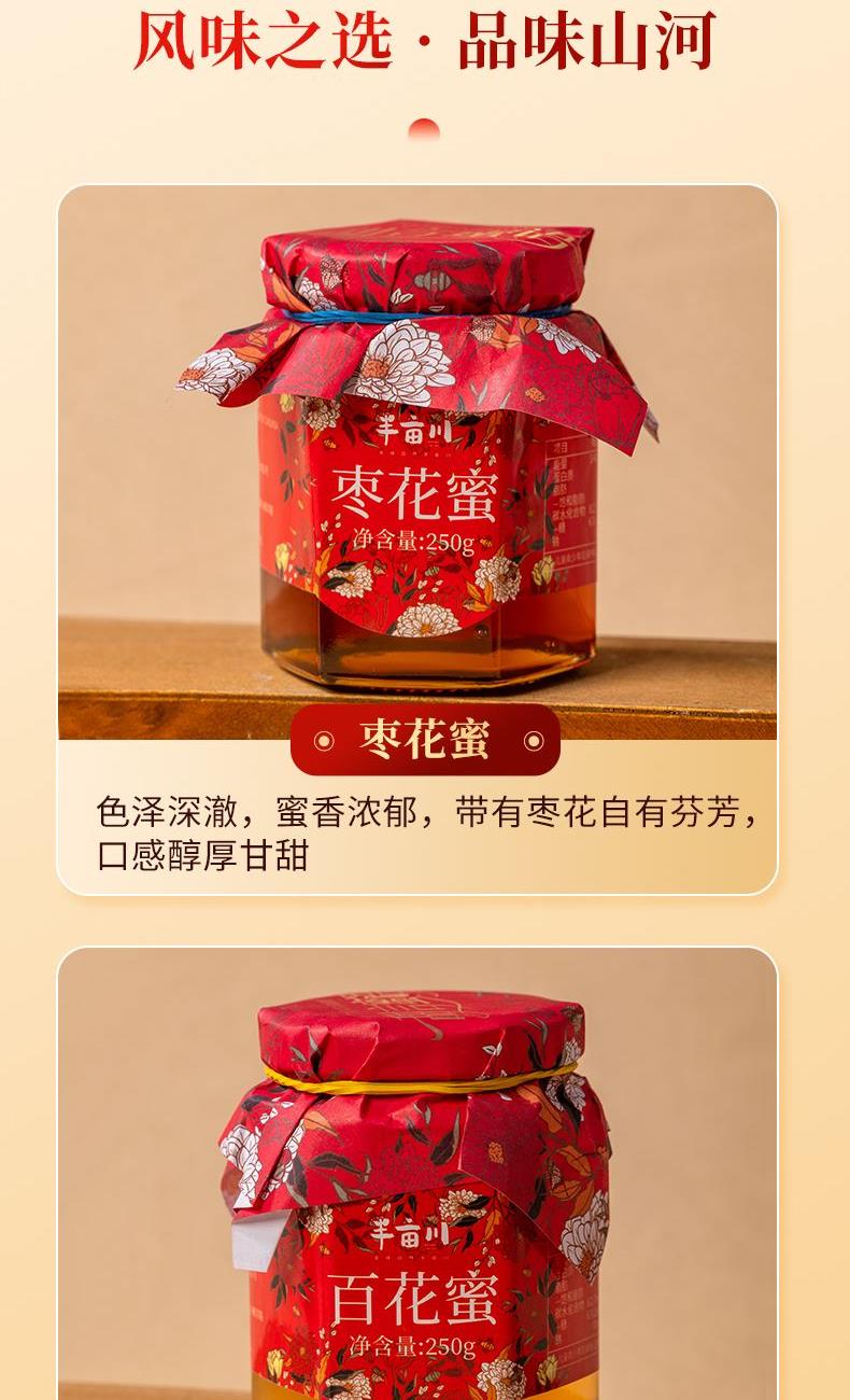 產品配置: 棗花蜜250g*2 百花蜜250g*2 凈含量:1.0kg 禮盒尺寸:47*11*24.5cm 棗花蜜醇厚馥郁,棗香濃郁;百花蜜清甜溫潤,花香交融。 250g*2雙規(guī)格組合,自然原蜜無添加,營養(yǎng)與風味兼?zhèn)洹?