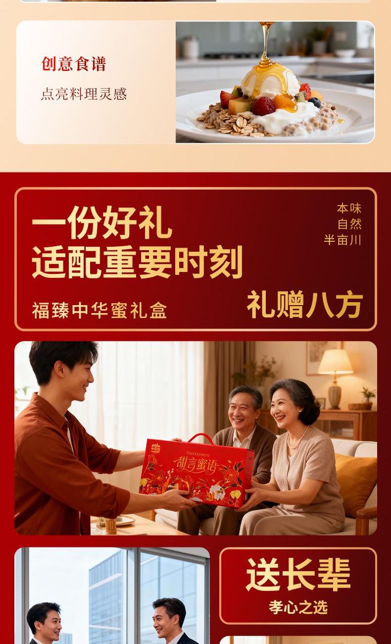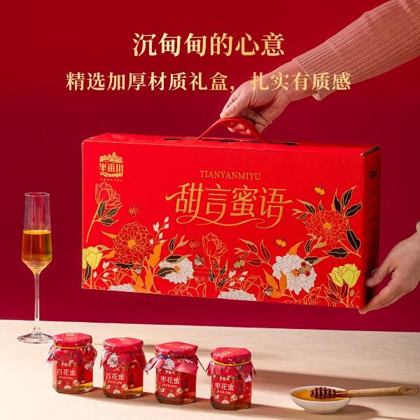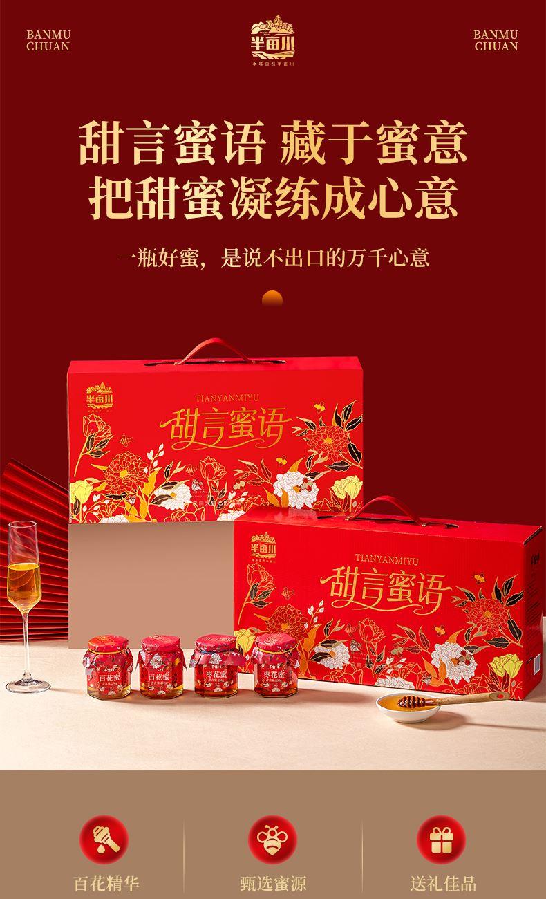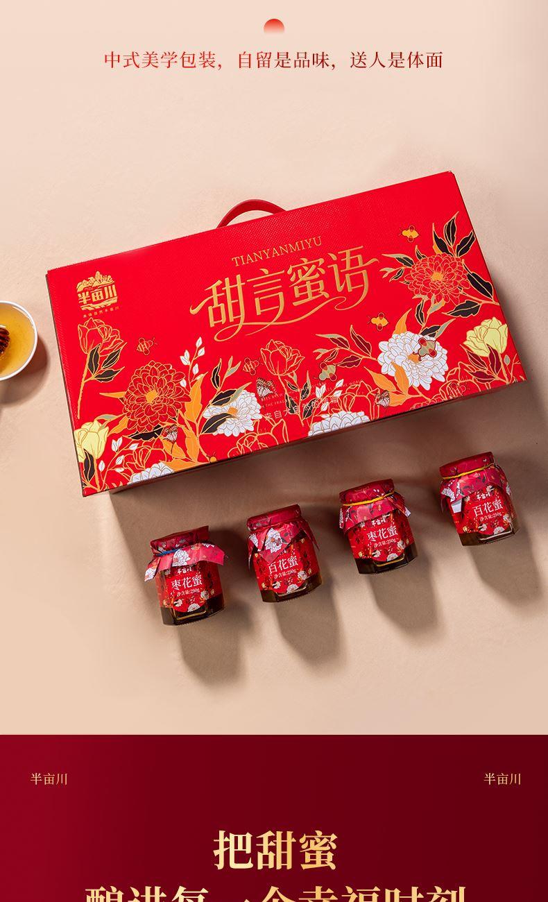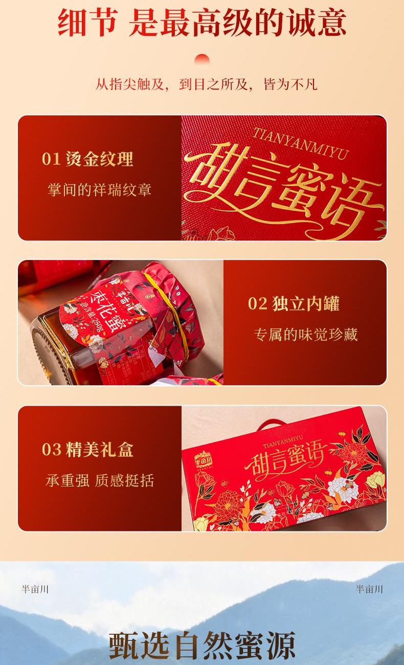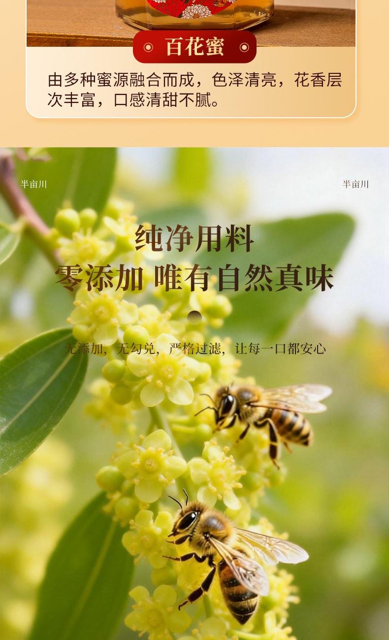 產品配置: 棗花蜜250g*2 百花蜜250g*2 凈含量:1.0kg 禮盒尺寸:47*11*24.5cm 棗花蜜醇厚馥郁,棗香濃郁;百花蜜清甜溫潤,花香交融。 250g*2雙規(guī)格組合,自然原蜜無添加,營養(yǎng)與風味兼?zhèn)洹?