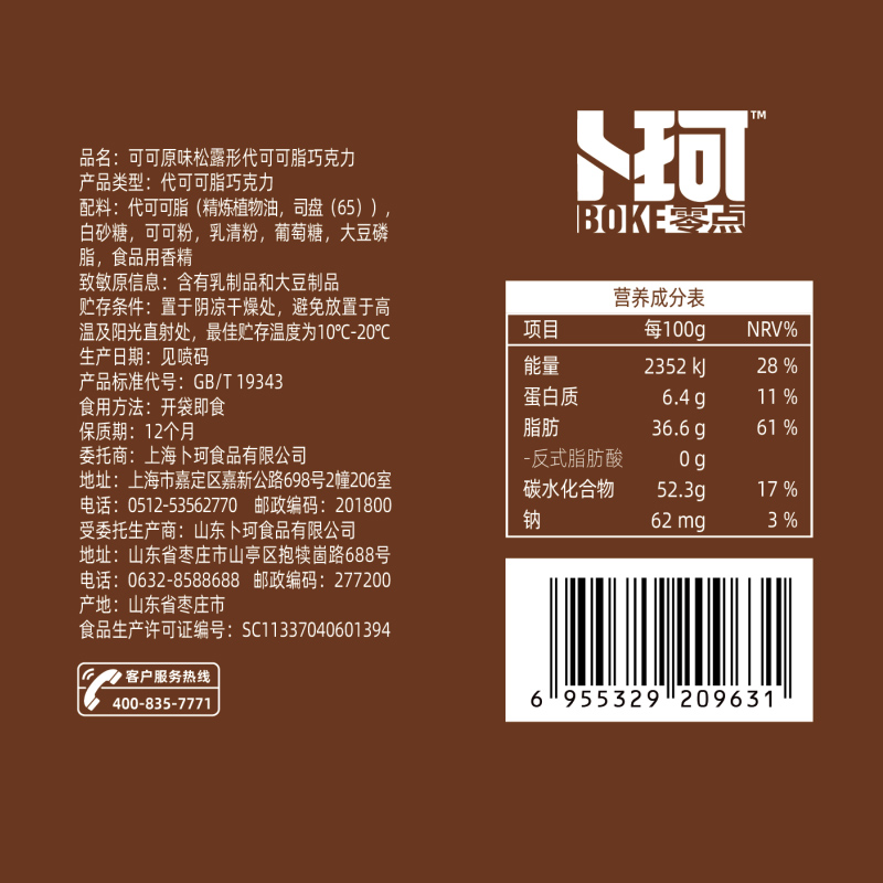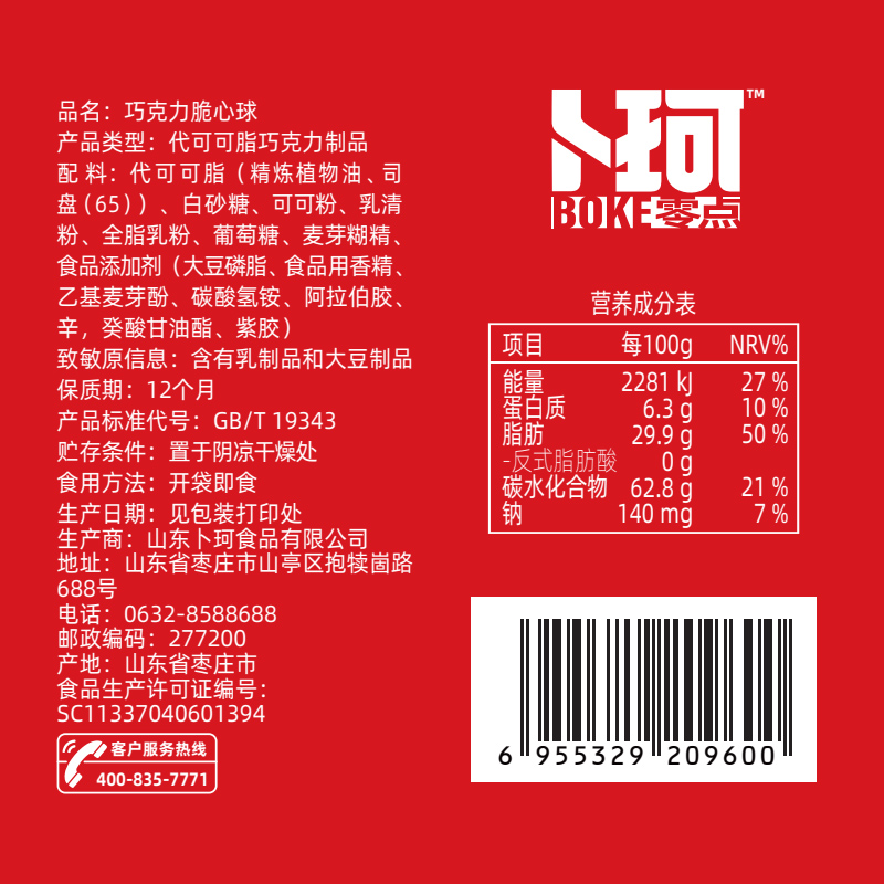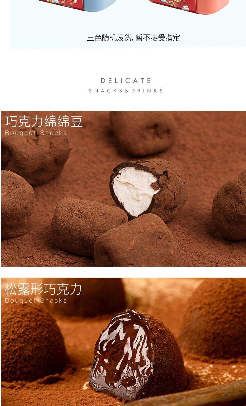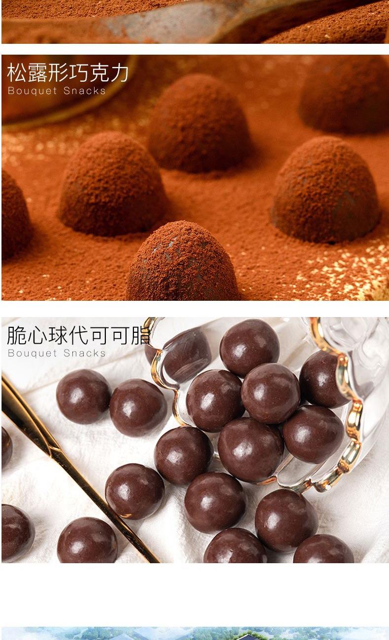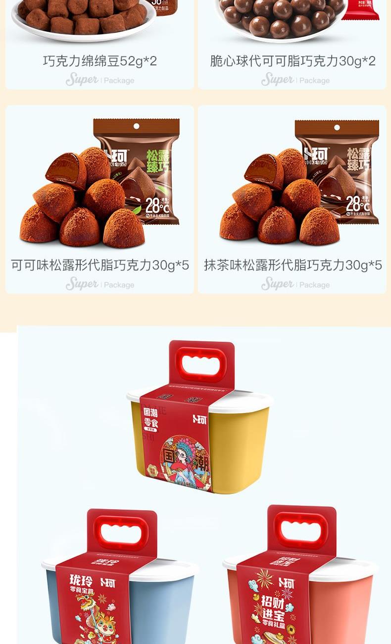 克重:464克 內(nèi)配: 1.清香抹茶味松露形代可可脂巧克力30g×5袋 2.可可原味松露形代可可脂巧克力30g×5袋 3.巧克力綿綿豆52g×2袋 4.脆心球代可可脂巧克力制品30g×2袋 禮盒規(guī)格:24*16*14.5cm 保質(zhì)期:12月