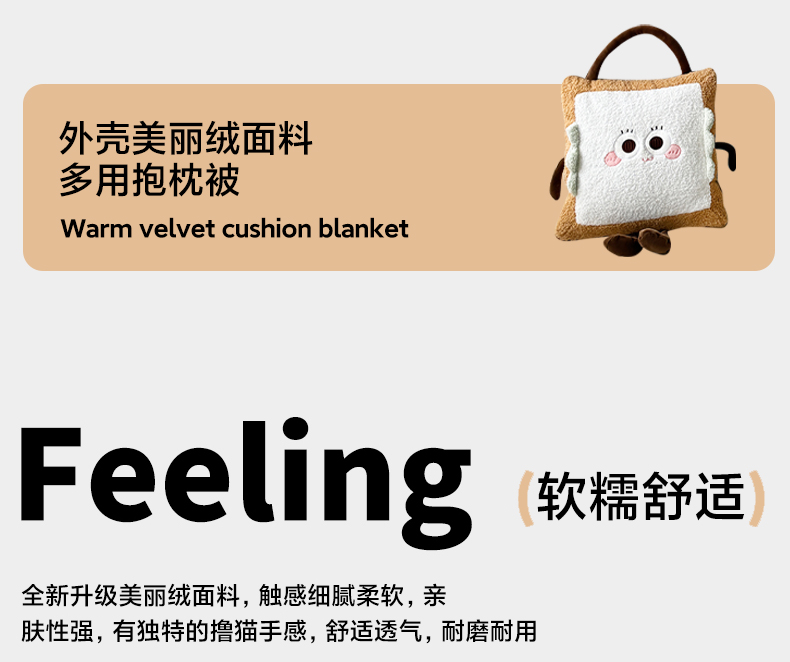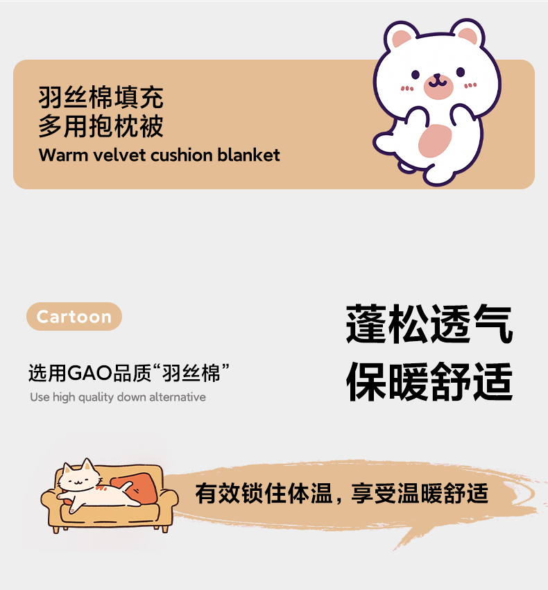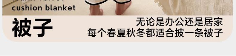暖意綿綿擼貓般手感、愛不釋手,豐滿細(xì)膩的絨毛 更具有保暖性熱量不易流失鎖住溫暖。給肌膚柔軟寵愛,軟糯且溫柔 讓肌膚來個(gè)美麗擁抱的同時(shí) 融入即有的溫柔抱枕或被子自由切換 用于名宿、 宿舍 、家居臥室、沙發(fā)、可做辦公午睡被 旅行被、汽車被 、蓋被等多功能 采用整張棉填充,蓬松透氣,柔軟舒適,輕薄不壓身 貼合肌膚