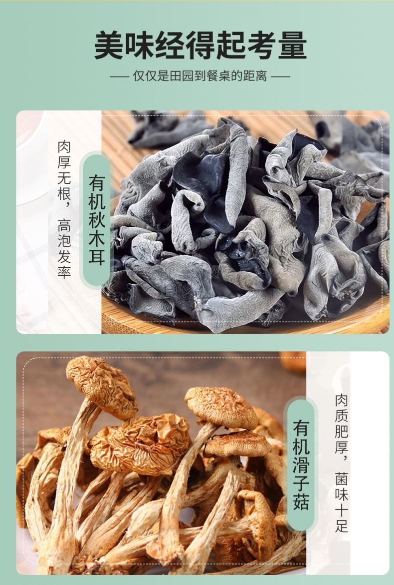 產(chǎn)品詳情配置—罐裝: 有機(jī)黑木耳90g 有機(jī)滑子菇60g 有 機(jī) 香 菇90g 有 機(jī) 元 蘑60g 有 機(jī) 紅 棗200g 凈含量:500g 禮盒尺寸:48*12*23cm 產(chǎn)品賣點(diǎn): 半畝川菌韻華章有機(jī)山珍五種有機(jī)菌菇干貨+有機(jī)紅棗,山珍菌香濃郁,紅棗肉厚核小,禮盒裝薈萃自然精華,有機(jī)又健康。