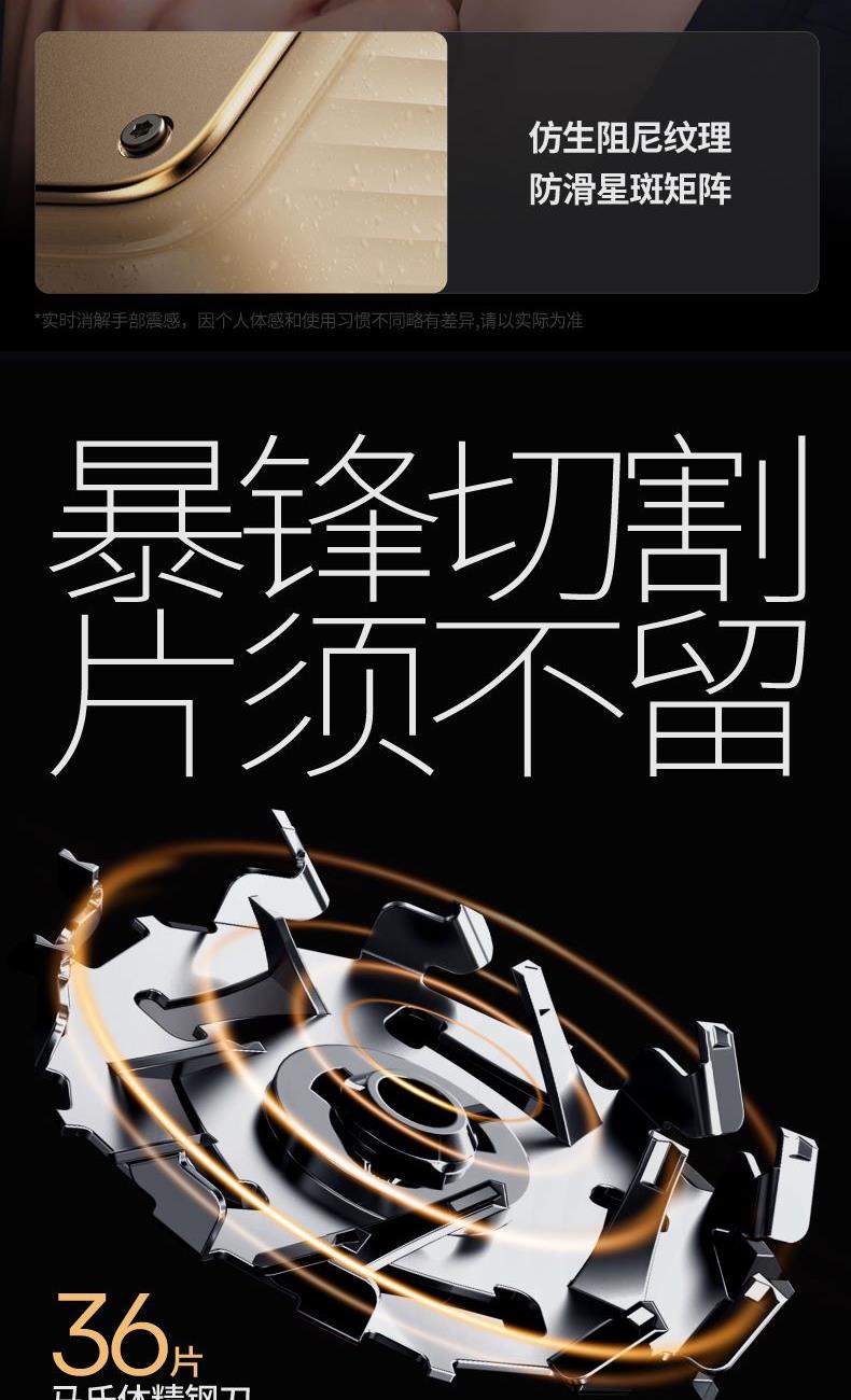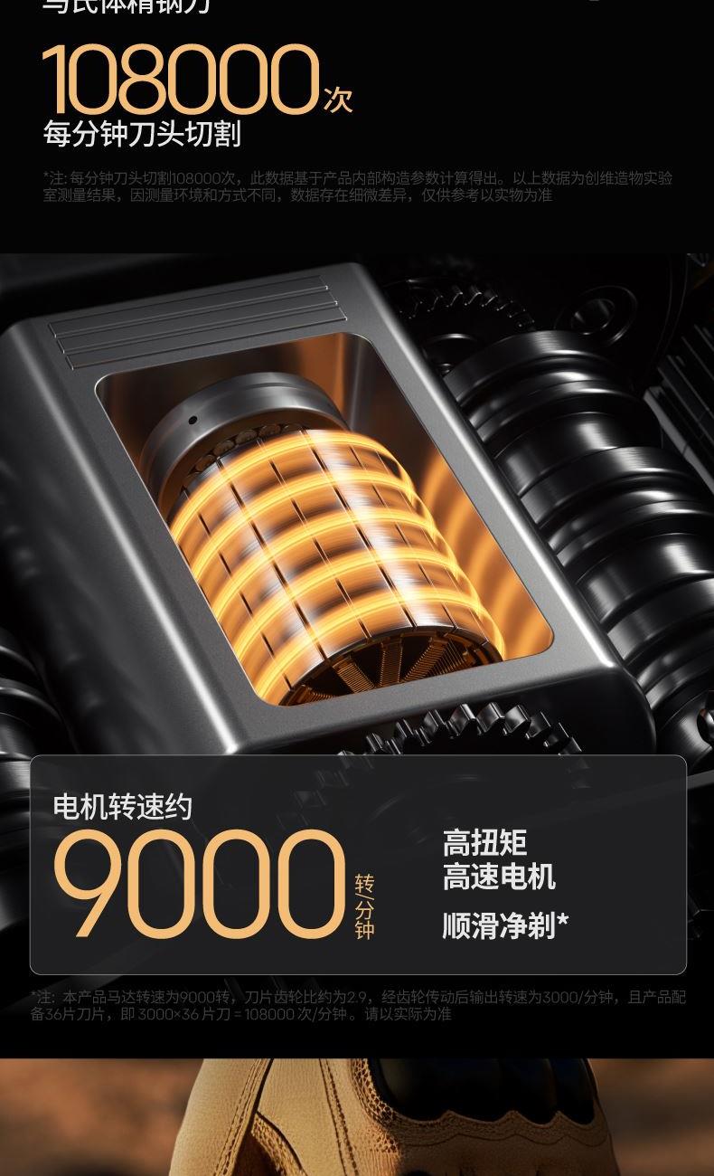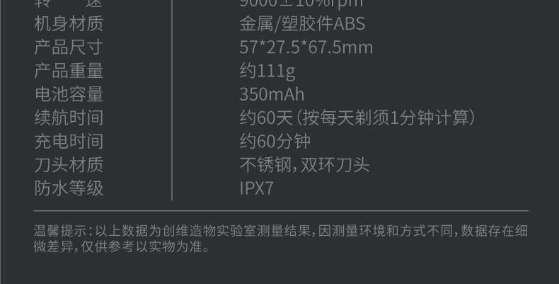 1、無線耳機(jī)盒大小,設(shè)計(jì)精致小巧,超高顏值; 2、18道精工電鍍,夠亮夠潮; 3、6000轉(zhuǎn)高速靜噪電機(jī),夠性能才夠快; 4、15片馬氏精鋼刀, 弧面刀網(wǎng),順滑貼膚,干濕兩剃; 5、IPX7級(jí)防水等級(jí),可全身水洗;
