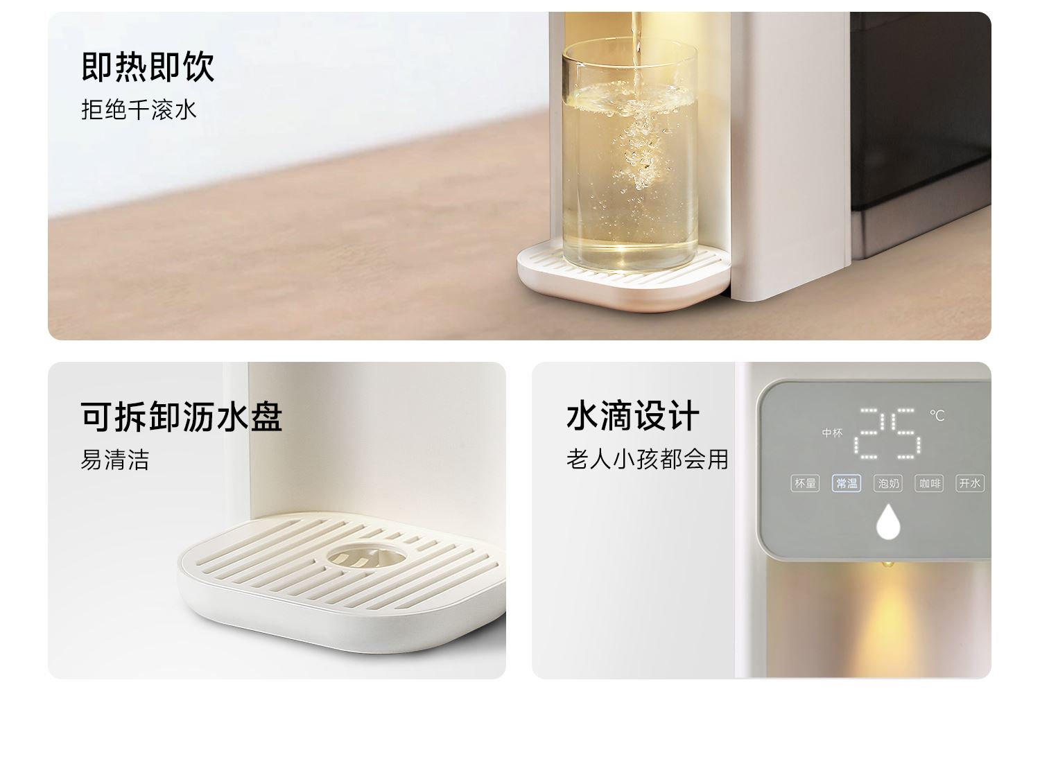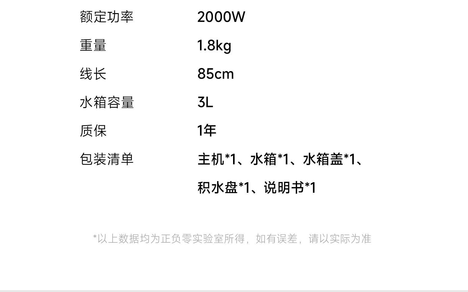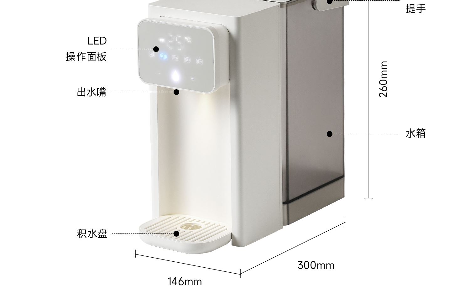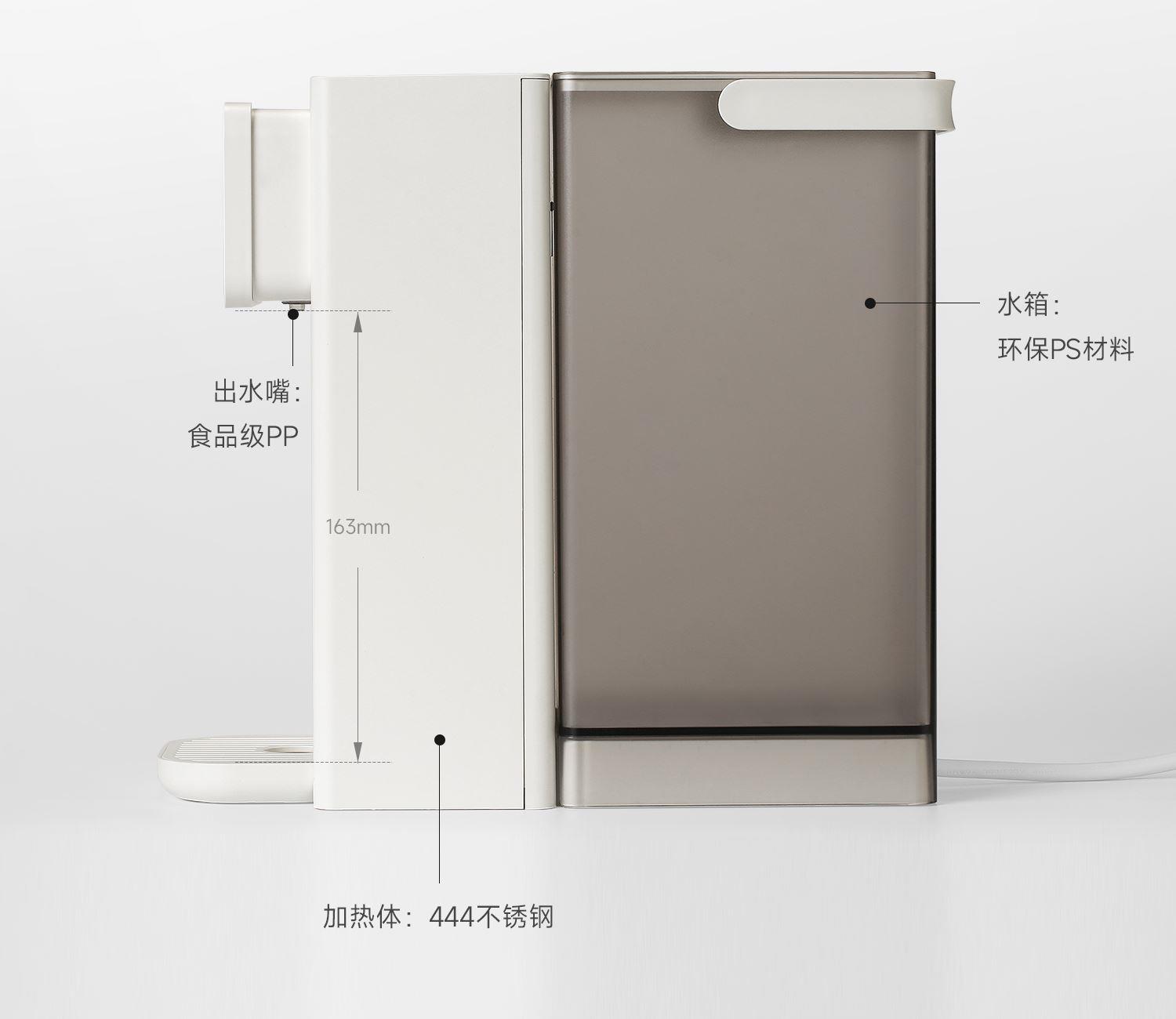 額定功率:2000W 重量:1.8kg 線長:85cm 水箱容量:3L 質(zhì)保:1年 包裝清單:主機*1、水箱*1、水箱蓋*1、積水盤、*1、說明書*1 稀土厚膜加熱技術(shù)、即開即熱 多段定溫模式、±1℃可調(diào)節(jié) 水路安全、食品級材質(zhì)、 0異味,0雙酚A 柔光夜晚氛圍燈 定量取水、輕音制水 即熱式節(jié)能低耗 防干燒、自動停止加熱