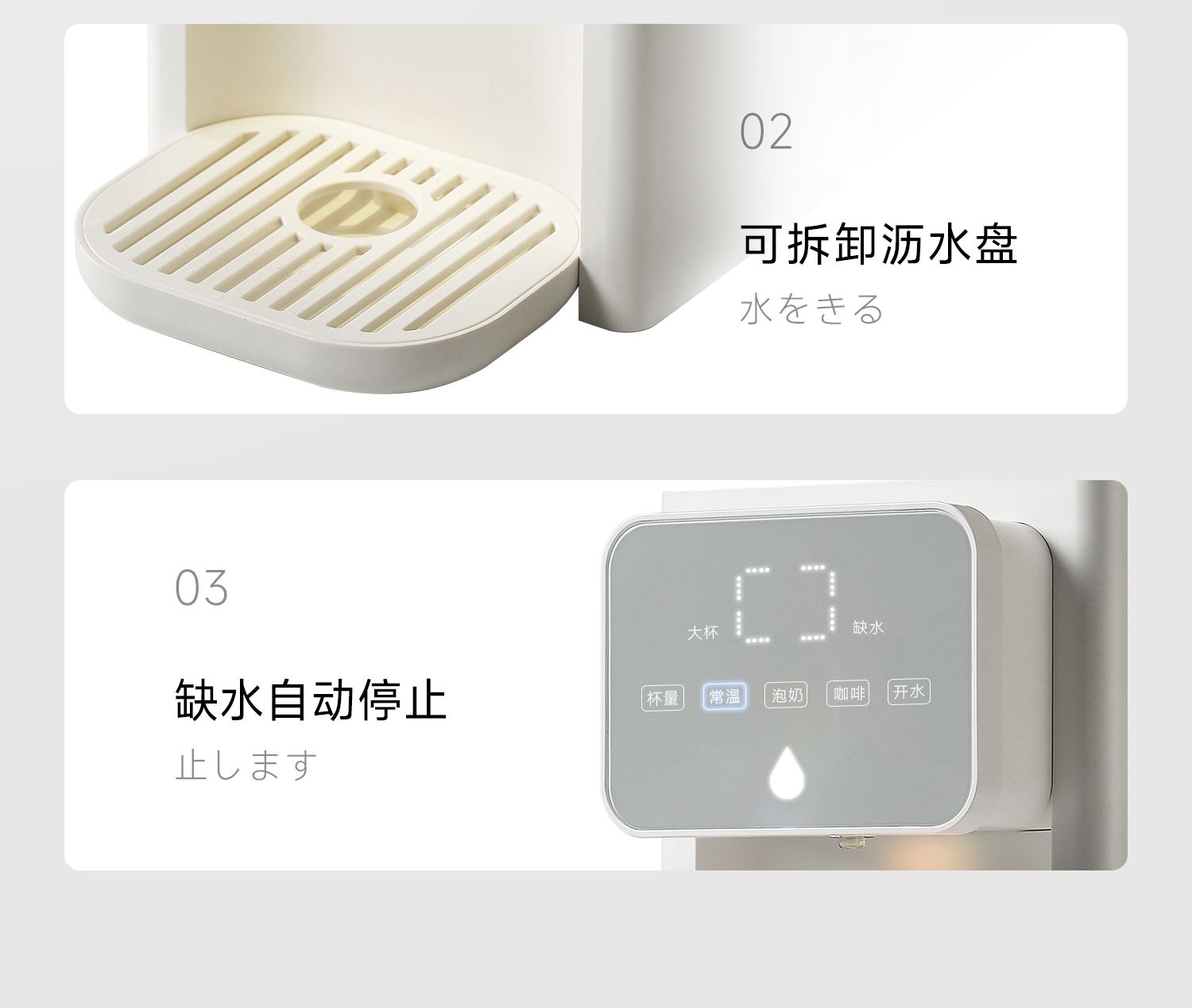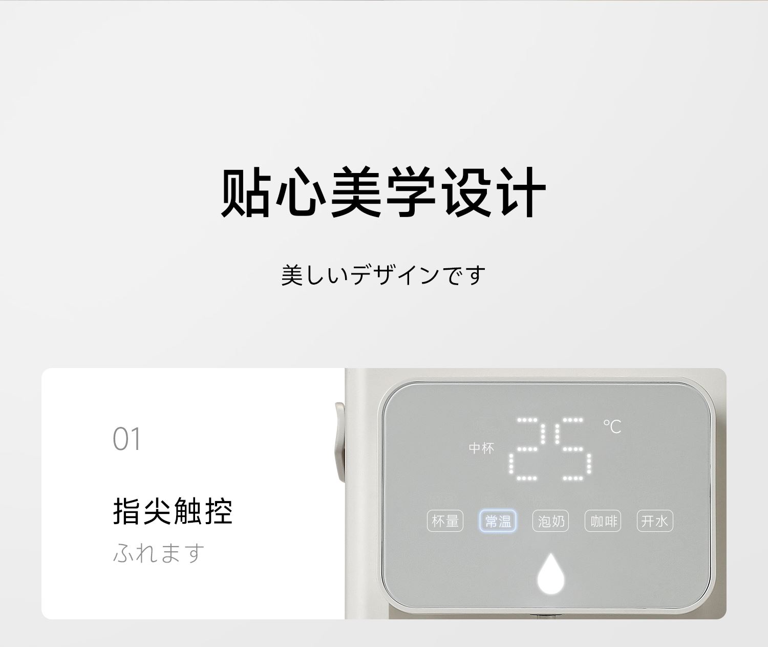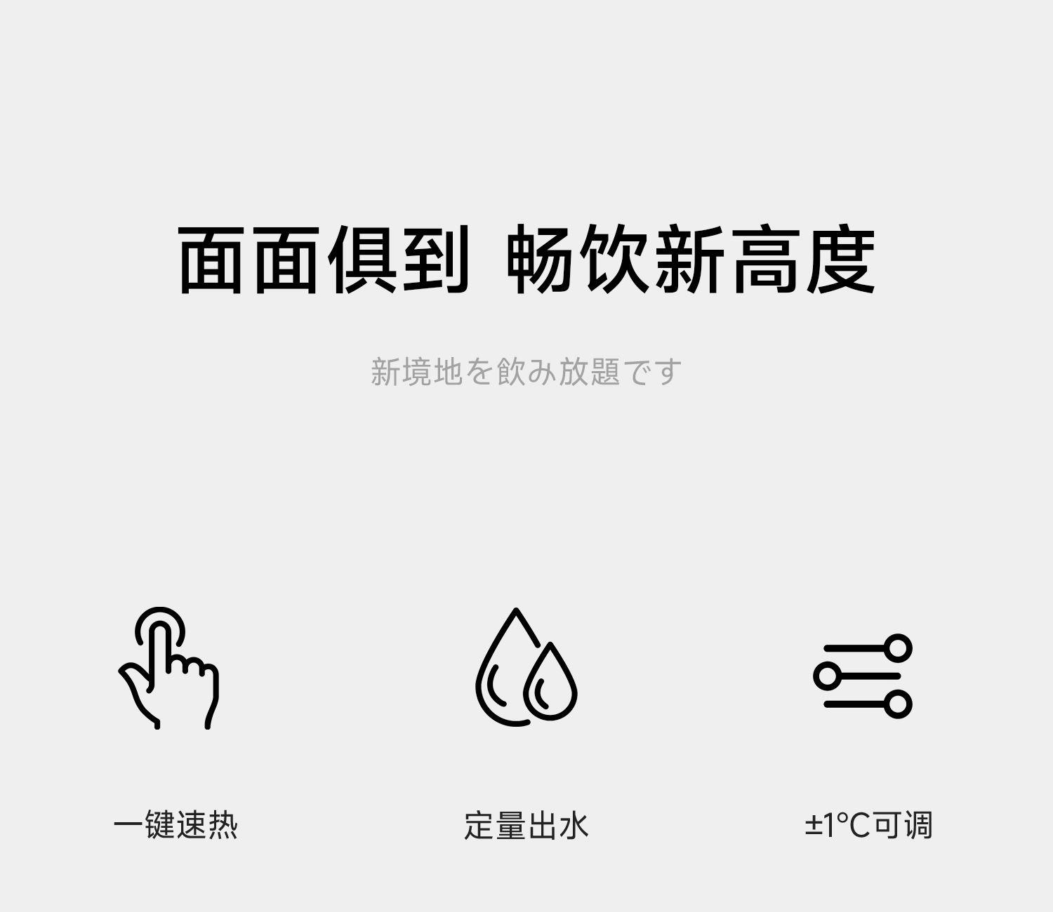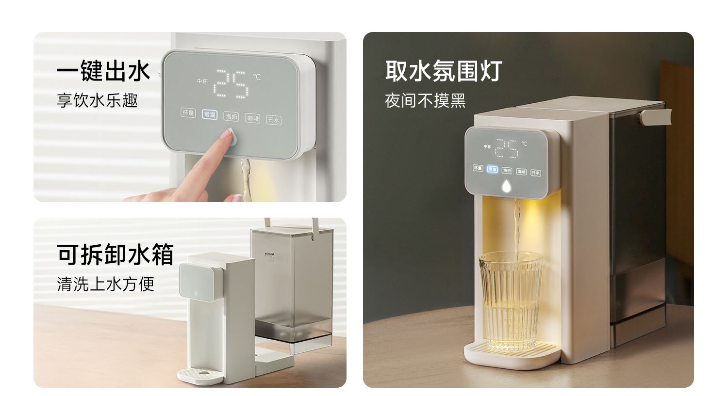 額定功率:2000W 重量:1.8kg 線長:85cm 水箱容量:3L 質(zhì)保:1年 包裝清單:主機*1、水箱*1、水箱蓋*1、積水盤、*1、說明書*1 稀土厚膜加熱技術(shù)、即開即熱 多段定溫模式、±1℃可調(diào)節(jié) 水路安全、食品級材質(zhì)、 0異味,0雙酚A 柔光夜晚氛圍燈 定量取水、輕音制水 即熱式節(jié)能低耗 防干燒、自動停止加熱