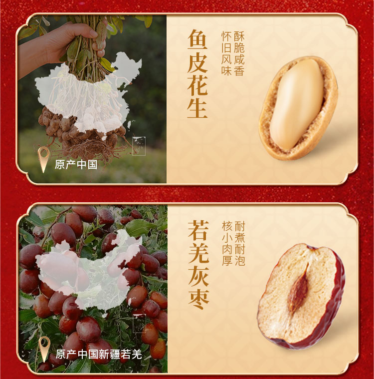 越南紫衣腰果88g 開口杏核108g 泰國龍眼干188g 魚皮花生188g 若羌灰棗288g 夾層山楂288g 老北京酥糖150g