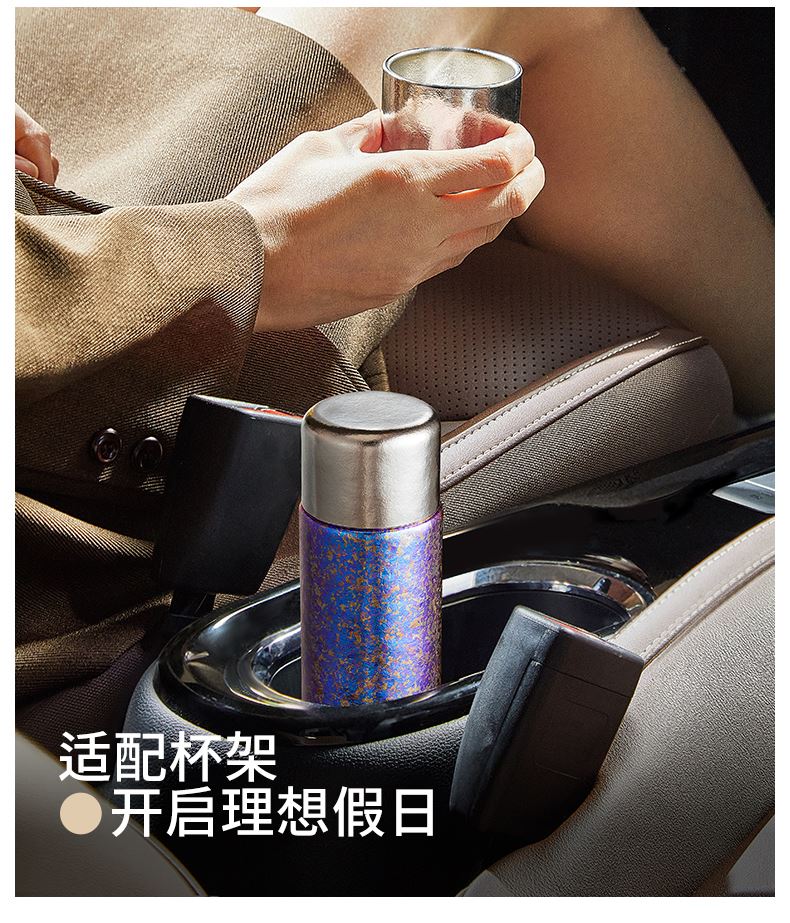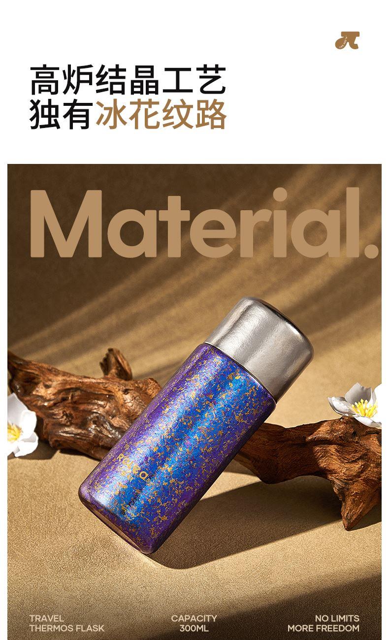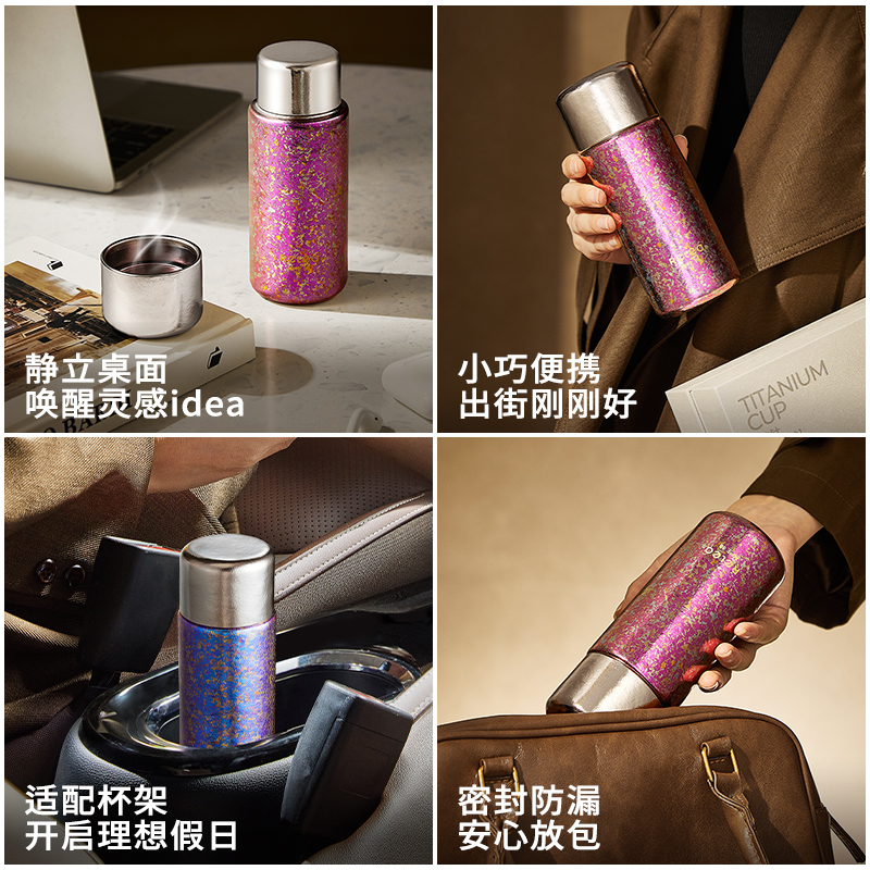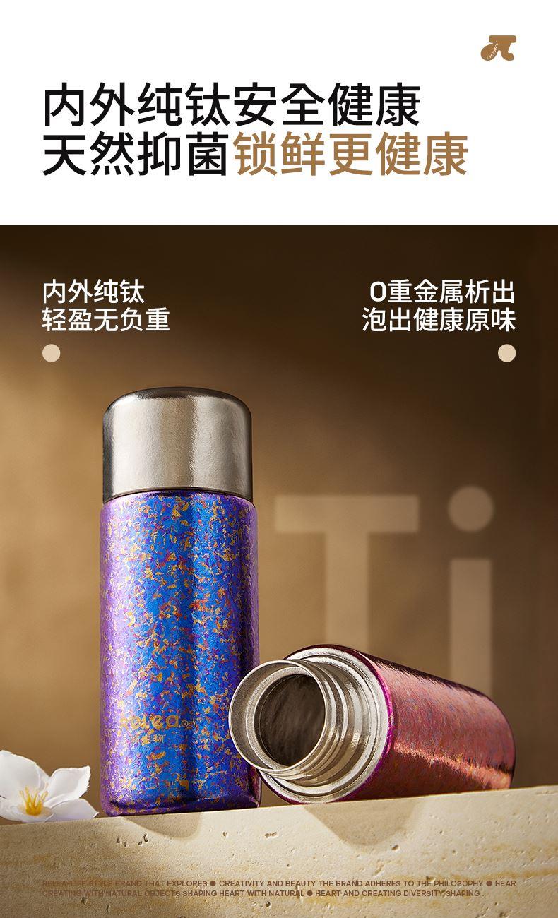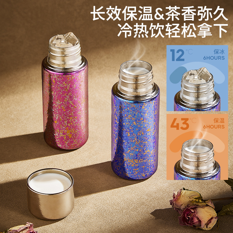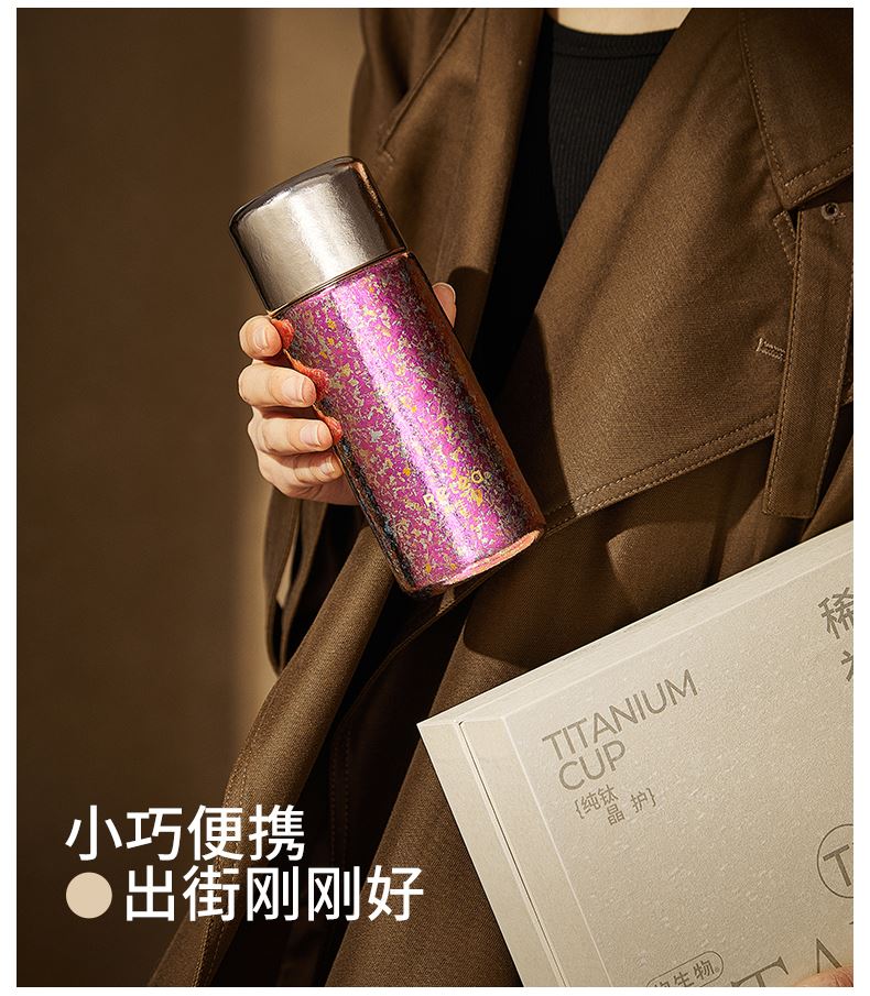 顏色:霞光粉 凝夜紫 容量:300ml 材質(zhì):內(nèi)膽-外蓋-內(nèi)蓋/純鈦杯蓋配件密封圈/PP+食品級硅膠 尺寸:尺寸:16cm(高度)x5.2cm(寬度) 1 內(nèi)外航天級純鈦材質(zhì),鈦含量大于99% 2.專屬禮盒包裝,儀式感慢慢 3.持久保溫保冷。 4.高爐結(jié)晶工藝,獨有冰花紋路。 磁吸杯蓋設(shè)計,杯蓋即茶盞,單手輕松喝水~