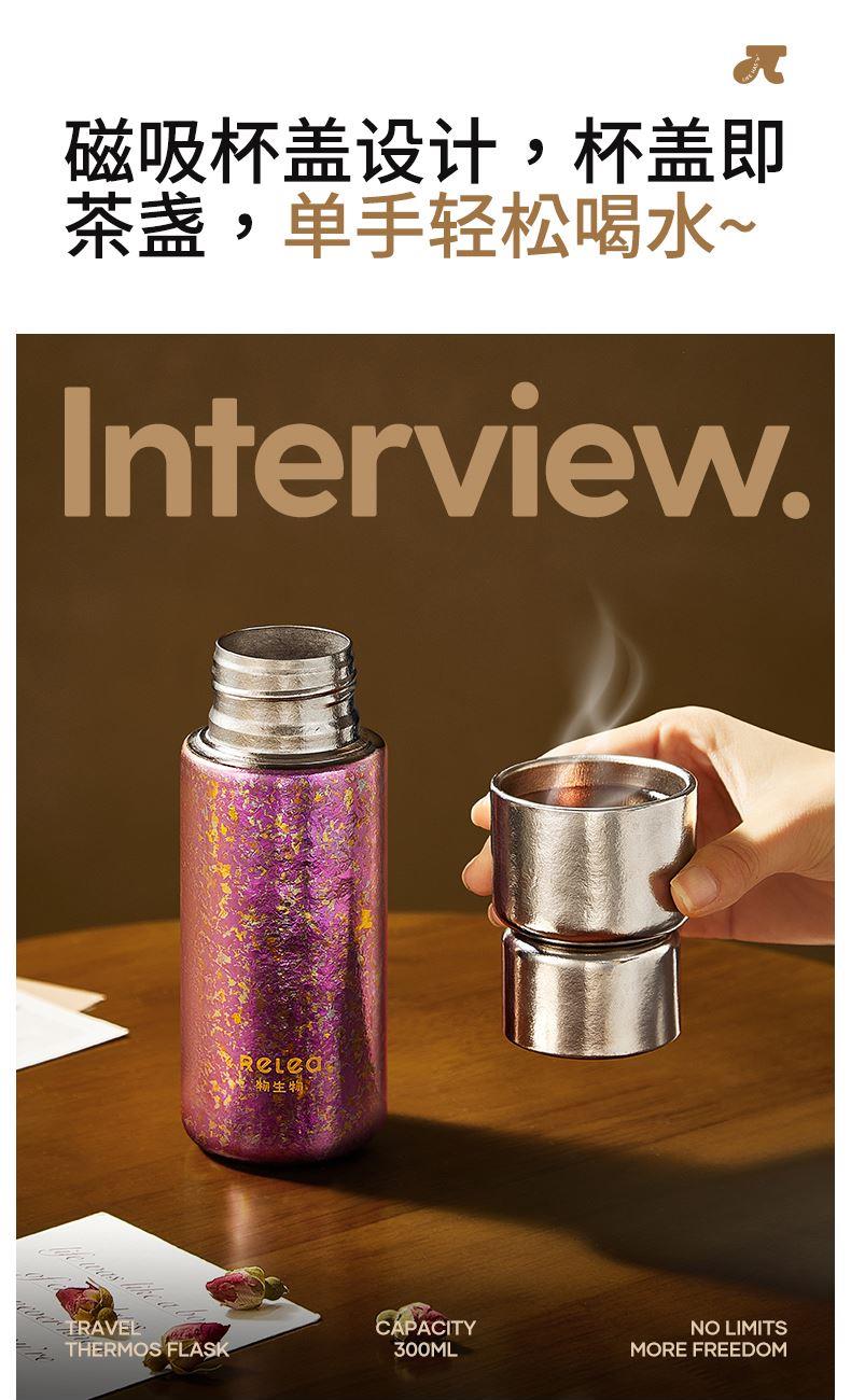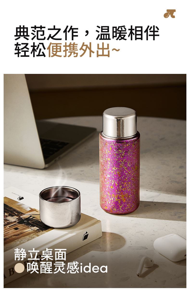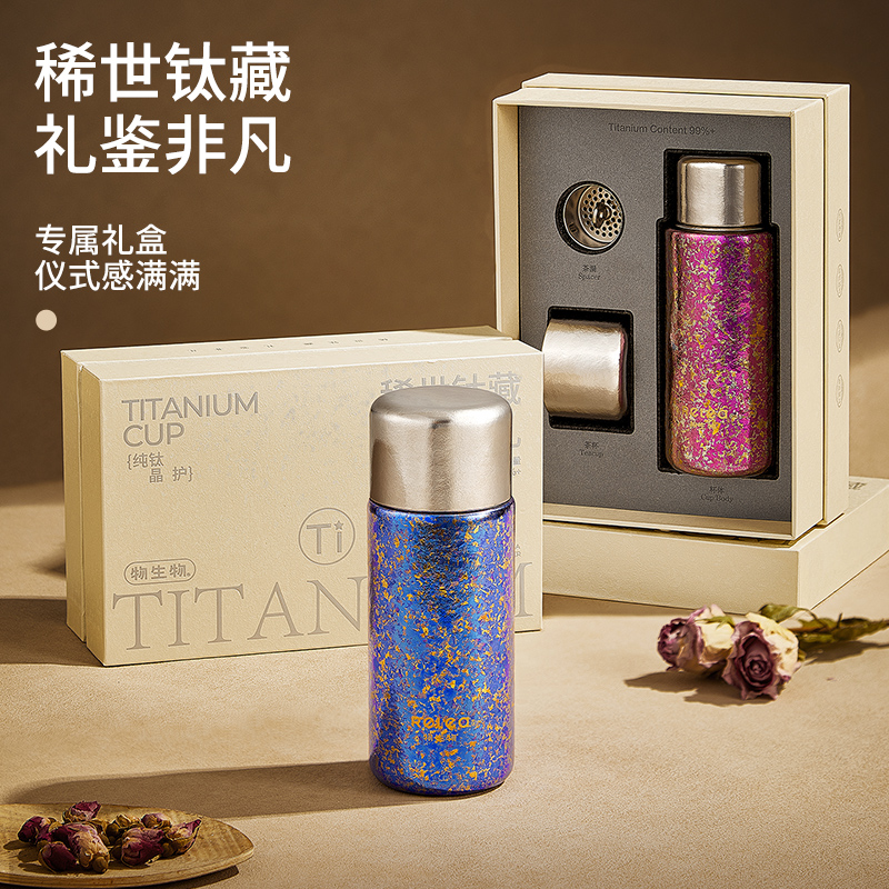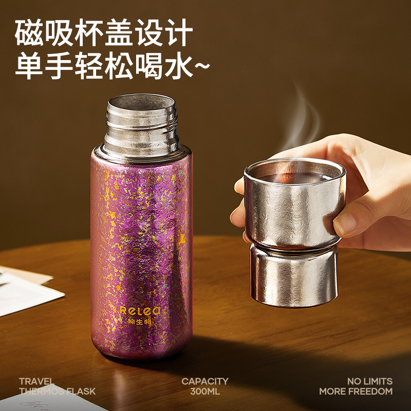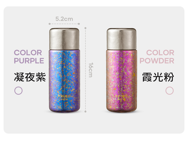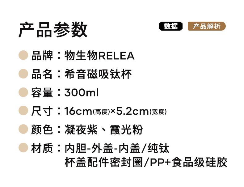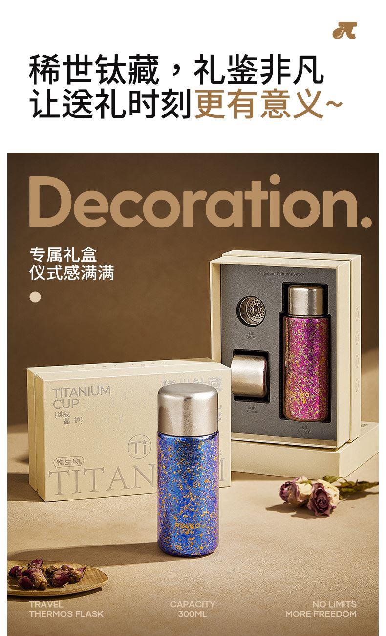 顏色:霞光粉 凝夜紫 容量:300ml 材質(zhì):內(nèi)膽-外蓋-內(nèi)蓋/純鈦杯蓋配件密封圈/PP+食品級硅膠 尺寸:尺寸:16cm(高度)x5.2cm(寬度) 1 內(nèi)外航天級純鈦材質(zhì),鈦含量大于99% 2.專屬禮盒包裝,儀式感慢慢 3.持久保溫保冷。 4.高爐結(jié)晶工藝,獨有冰花紋路。 磁吸杯蓋設(shè)計,杯蓋即茶盞,單手輕松喝水~