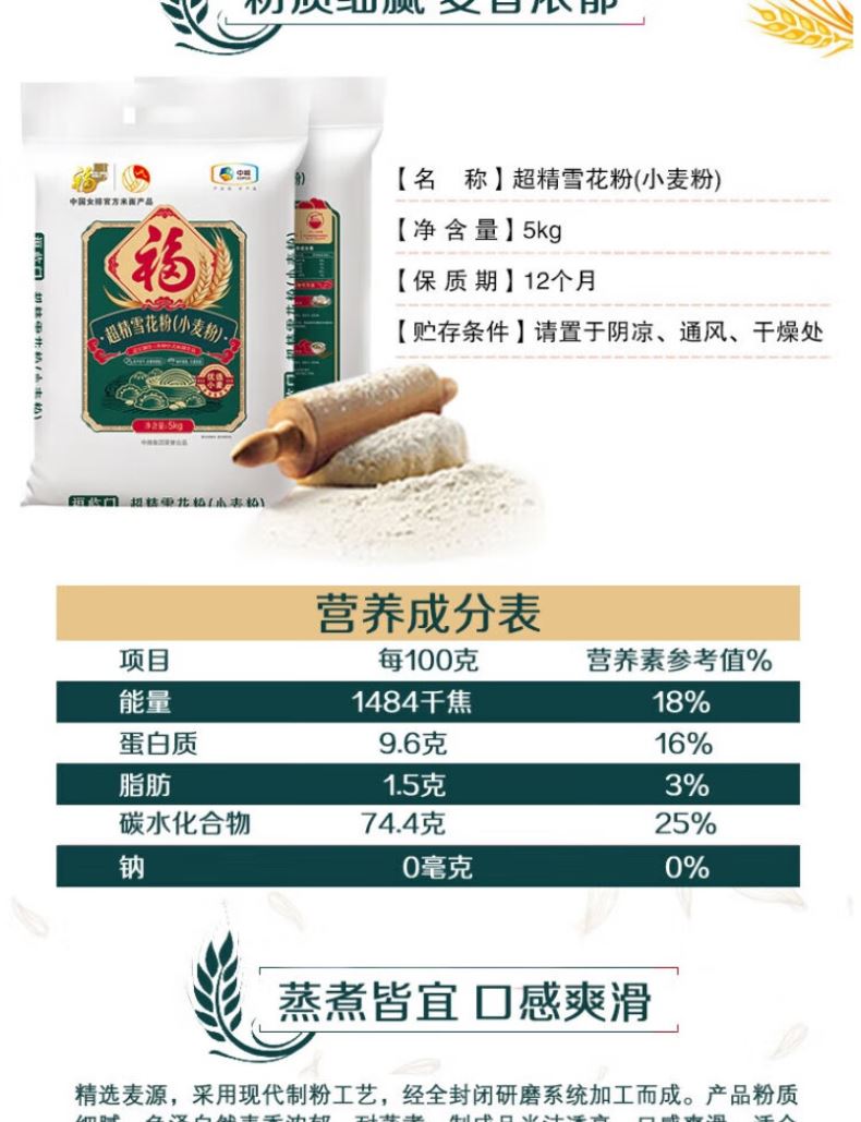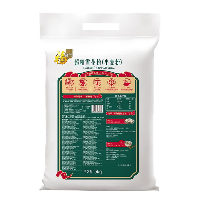 凈含量:5kg 條形碼:6944910370584 開票稅率:9% 產(chǎn)品賣點: 央企精磨,雪花粉質(zhì):中糧全鏈品控,精選優(yōu)質(zhì)麥源精磨,粉質(zhì)細膩白凈如雪花,麥香濃郁無添加 爽滑筋道,多能適配:耐蒸煮不易破,成品光潔透亮,口感爽滑筋道,包餃子 / 饅頭 / 面條等中式面點皆適用 5kg 實用裝,便捷易儲:5kg 家庭友好規(guī)格,密封鎖鮮,日常烹飪、節(jié)慶囤貨與企業(yè)福利采購均適配