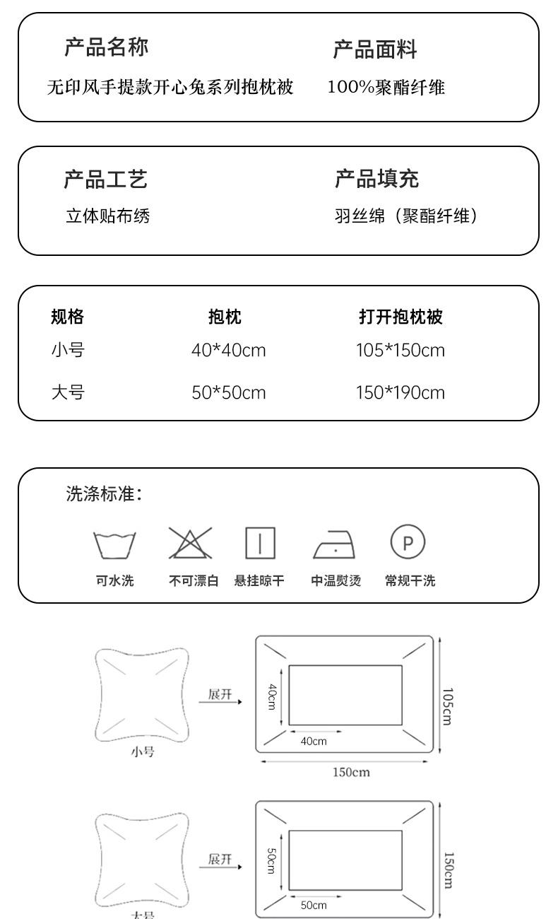規(guī)格:40*40cm打開被子105*150cm 面料: 聚酯纖維 花色:開心兔粉色、開心兔藍(lán)色、開心兔香草色、開心兔煙灰色 抱枕被設(shè)計(jì),一枕多用,可做靠枕,打開可做被子,用途廣泛,攜帶方便,手感舒適親膚,填用優(yōu)質(zhì)整張聚脂纖維,不易變形,手洗機(jī)洗均可,活性印染,色牢度高,不縮水不掉色。