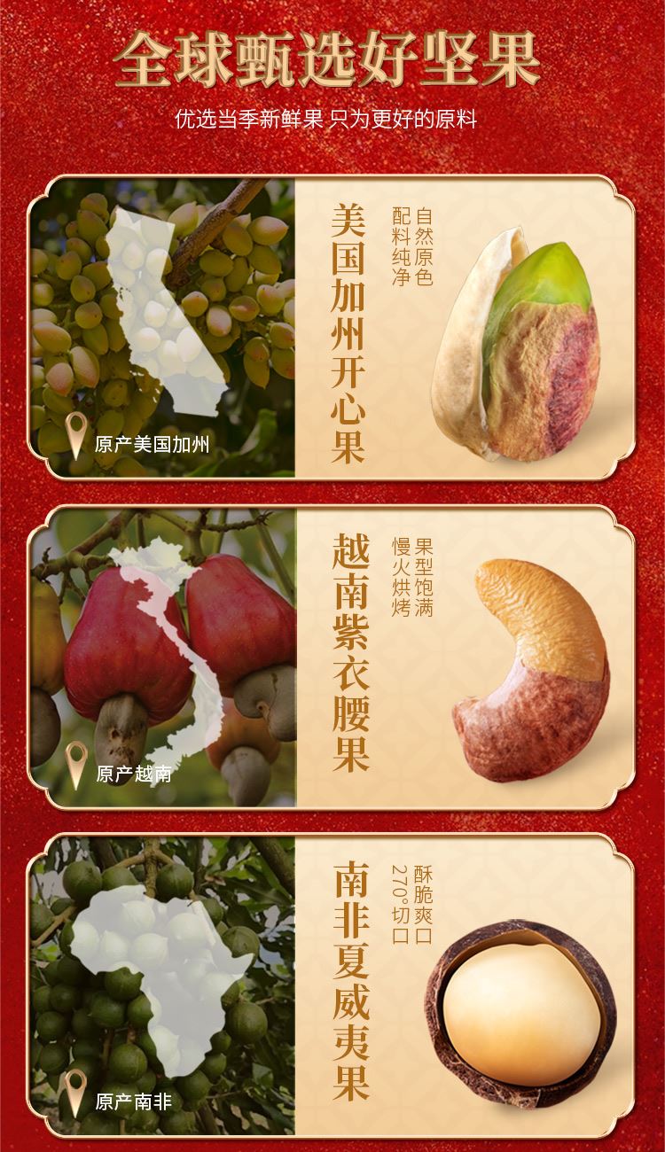 美國(guó)加州開(kāi)心果88g 越南紫衣腰果88g 南非夏威夷果88g 新疆紙皮核桃108g 開(kāi)口杏核108g 五香打手瓜子188g 魚皮花生288g 泰國(guó)龍眼干288g 夾層山楂288g 若羌灰棗288g 香酥黑豆188g